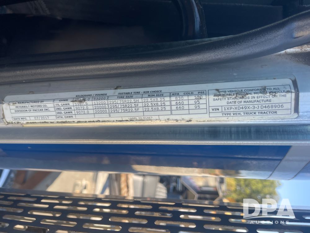 2018 Peterbilt 389 Day Cab Truck (LLD1455), Cummins ISX diesel engine, wet kit, air brakes, shows 385,564 miles.