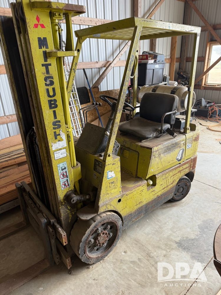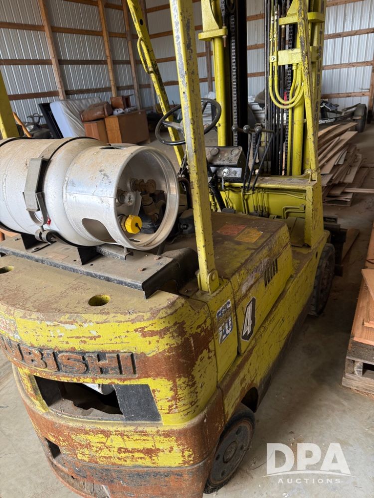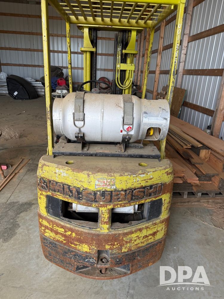 Mitsubishi Forklift (DR12670), LP gas engine, shuttle shift drive, 3 stage mast, hydraulic side shift, heavy duty manual adjust forks, solid tires.