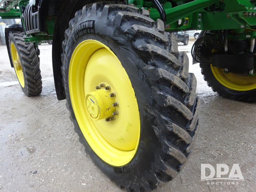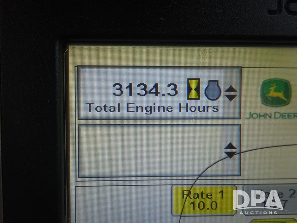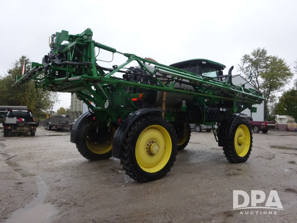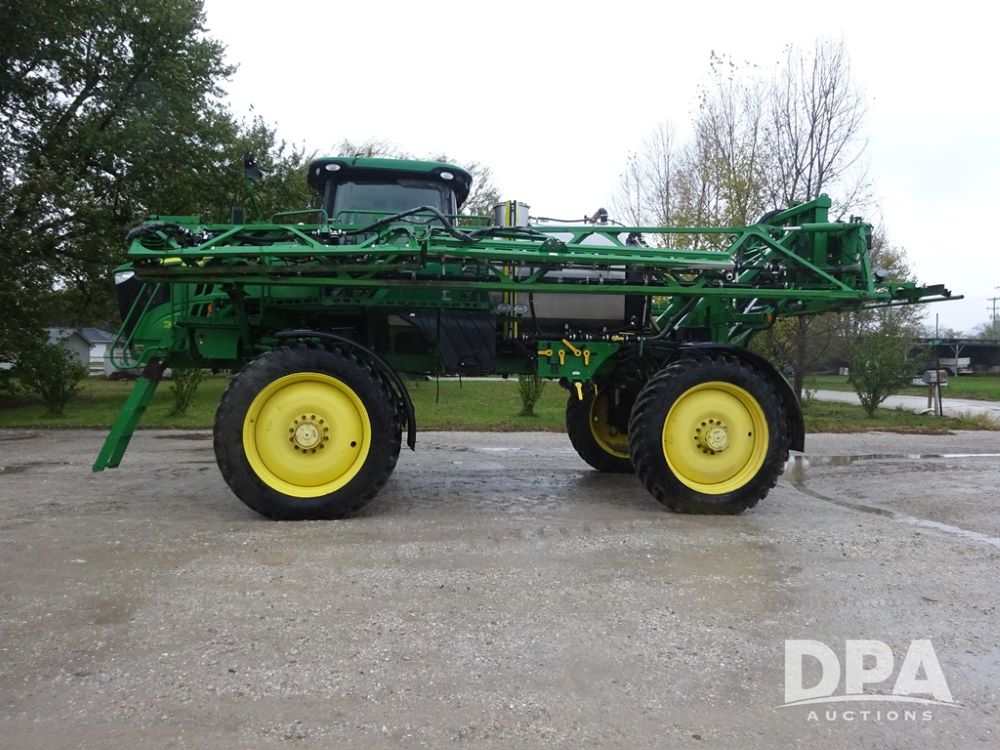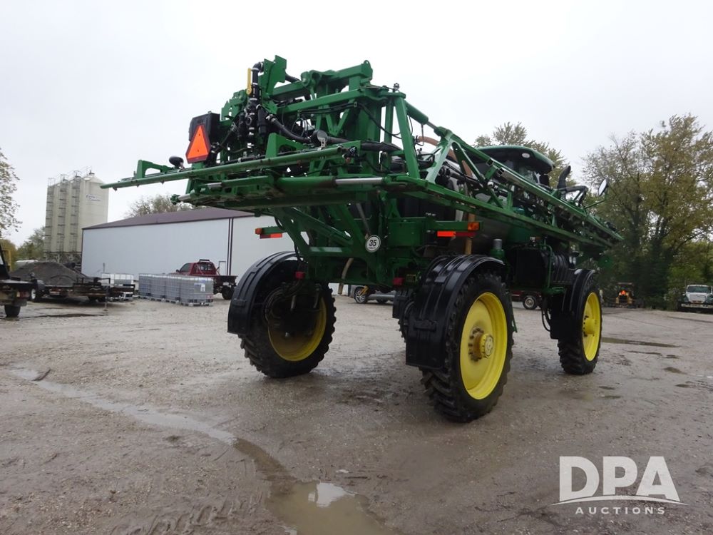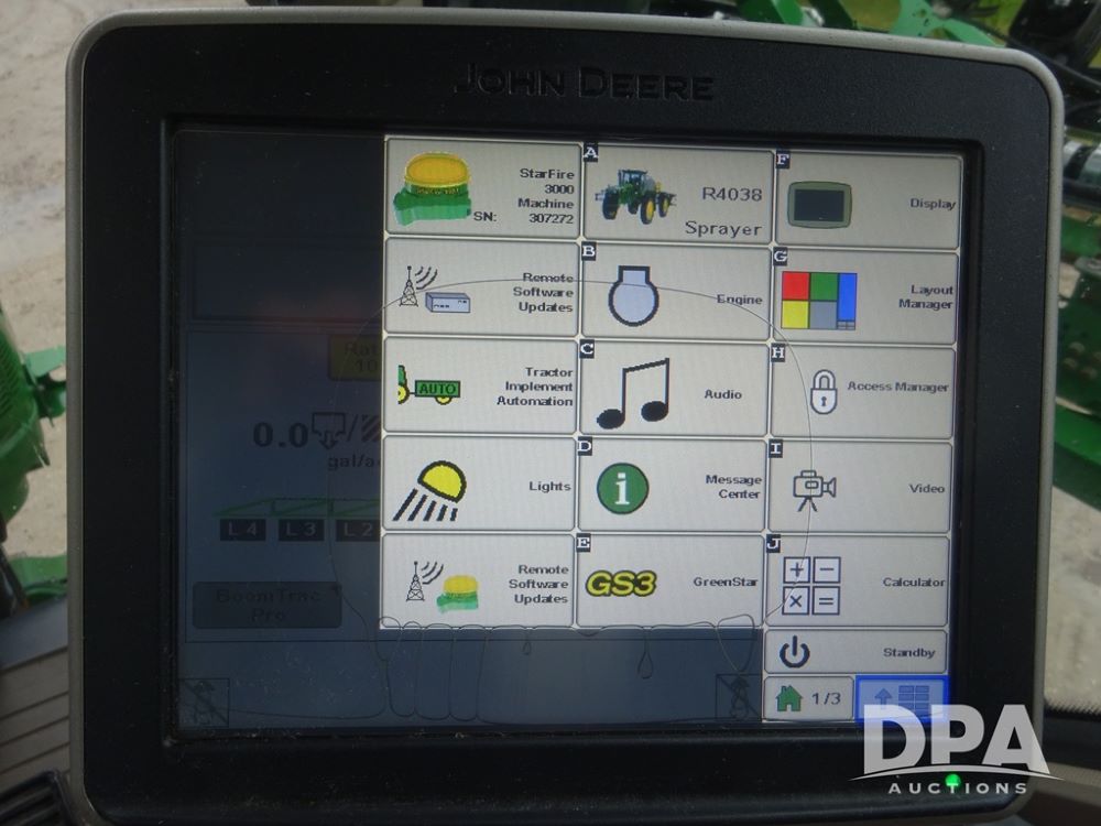 2015 John Deere R4038 Sprayer (PZ14111), John Deere diesel engine, hydrostatic transmission, heat, air conditioning, Am/Fm radio, 1,000 gallon stainless steel liquid system, 100' boom, rear mount poly rinse tank, manual solution control, 380/90R46 tires, fenders, StarFire 3000 globe, GreenStar monitor, shows 3,134 hours.