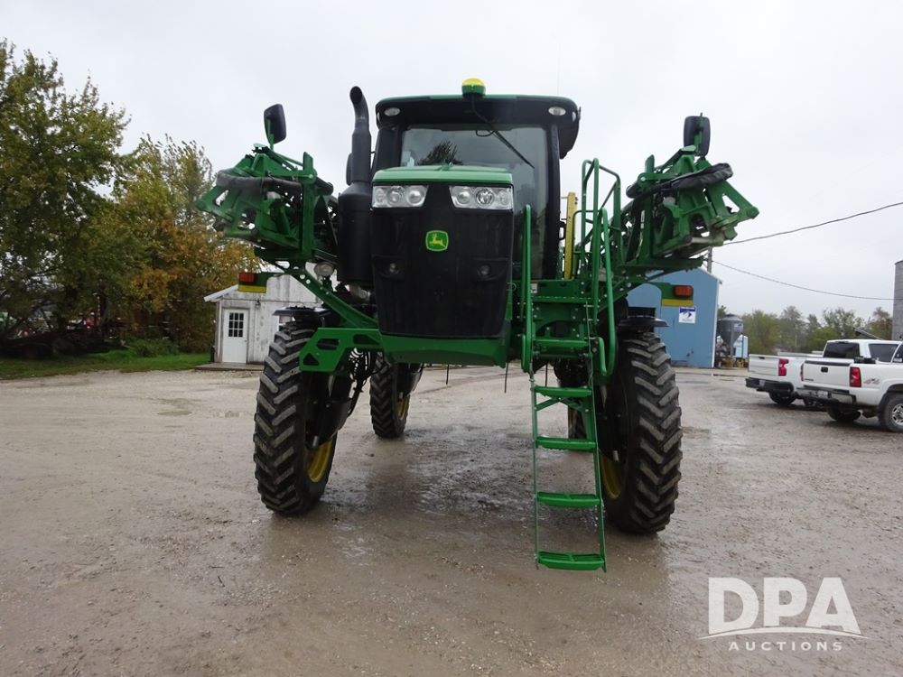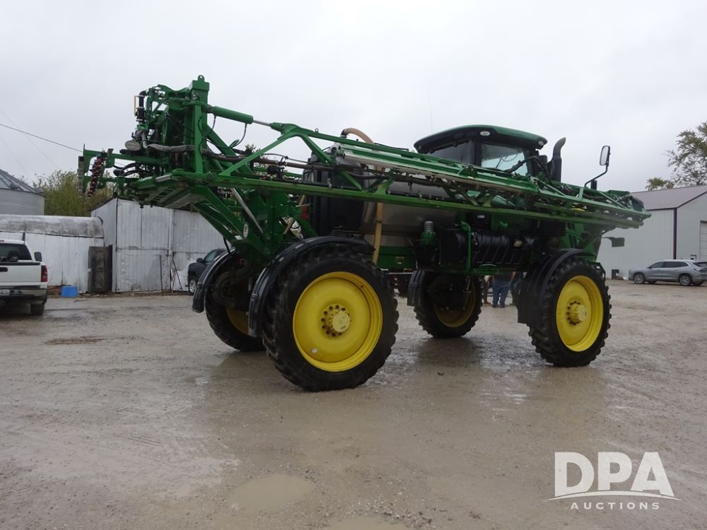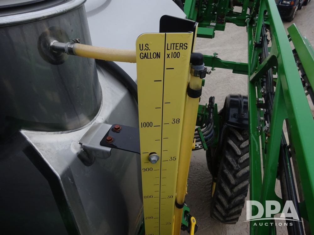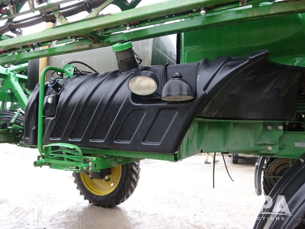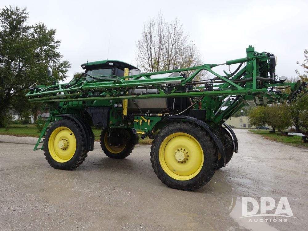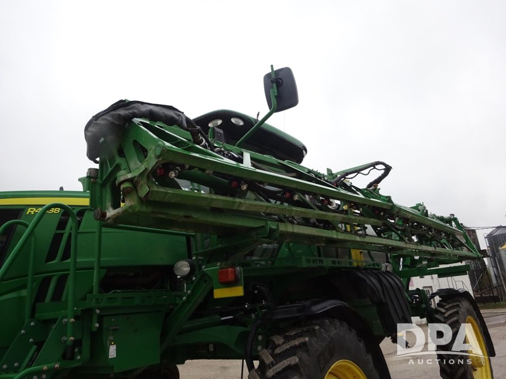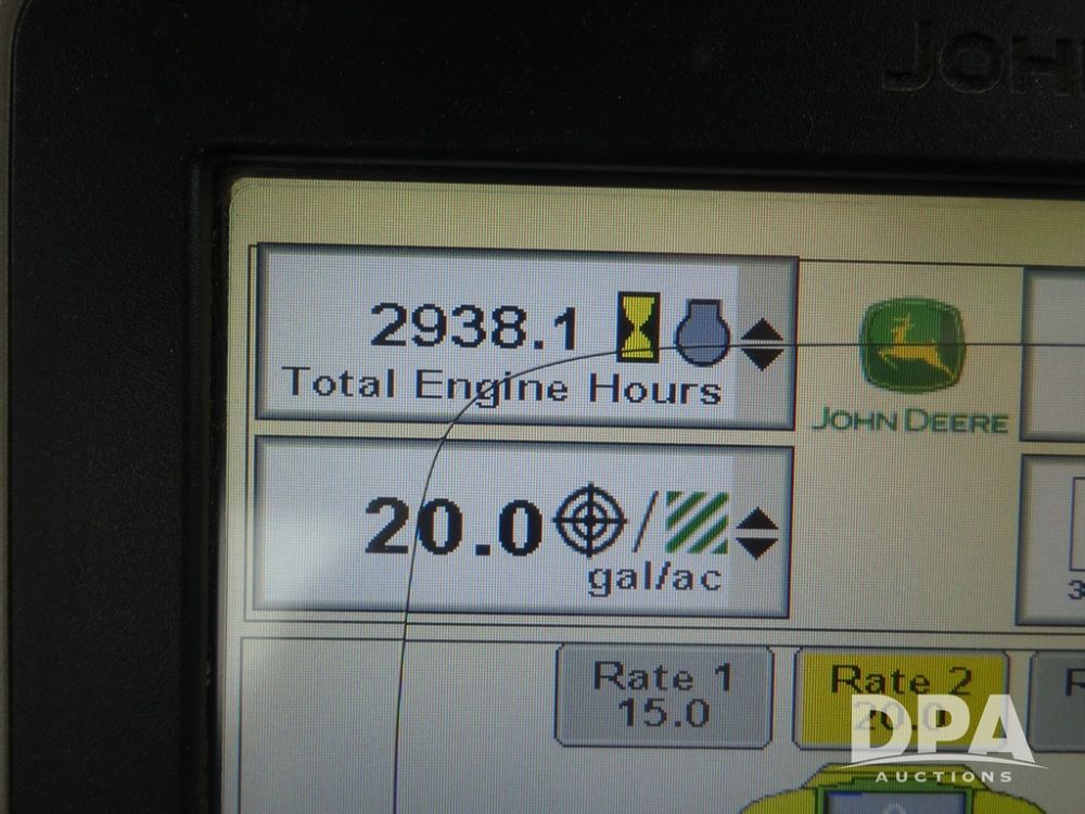 2017 John Deere R4038 Sprayer (PZ14112), John Deere diesel engine (S/N RG6090U037169), hydrostatic transmission, heat, air conditioning, Am/Fm radio, 1,000 gallon stainless steel liquid system, 100' boom, rear mount poly rinse tank, manual solution control, 380/90R46 tires, fenders, StarFire 6000 globe, GreenStar monitor, shows 2,938 hours.