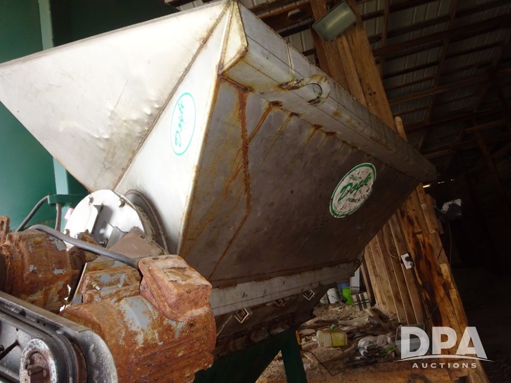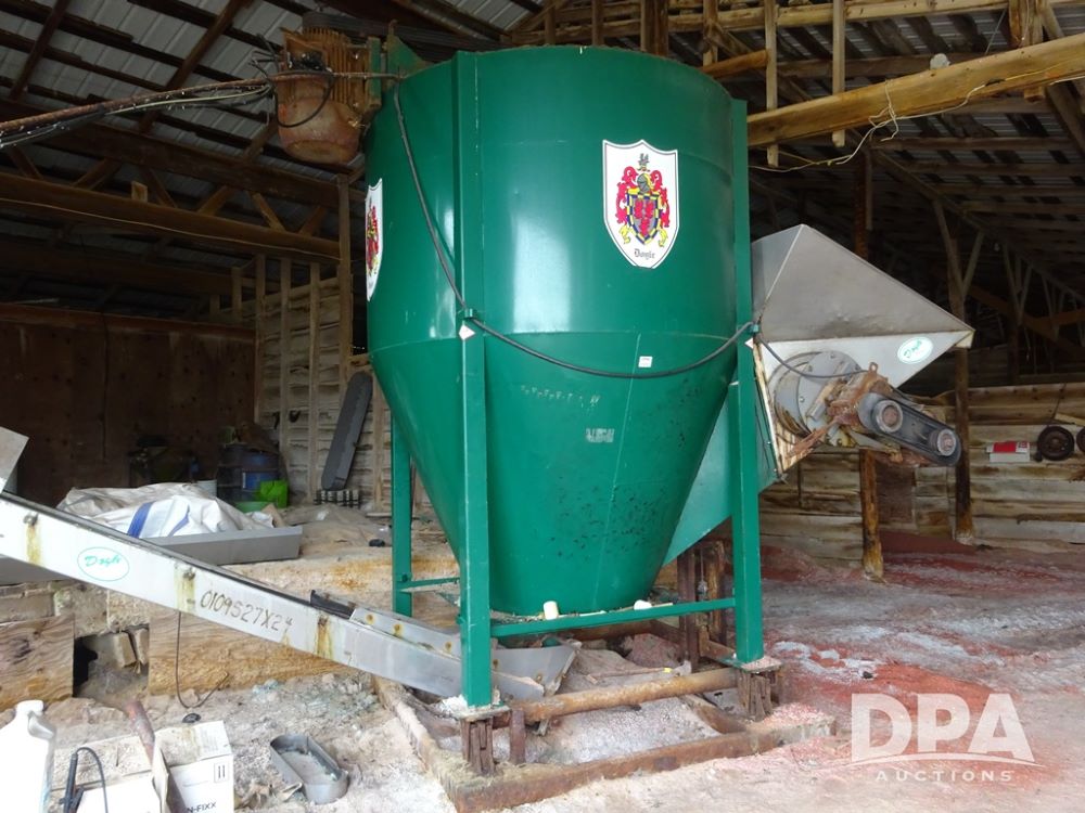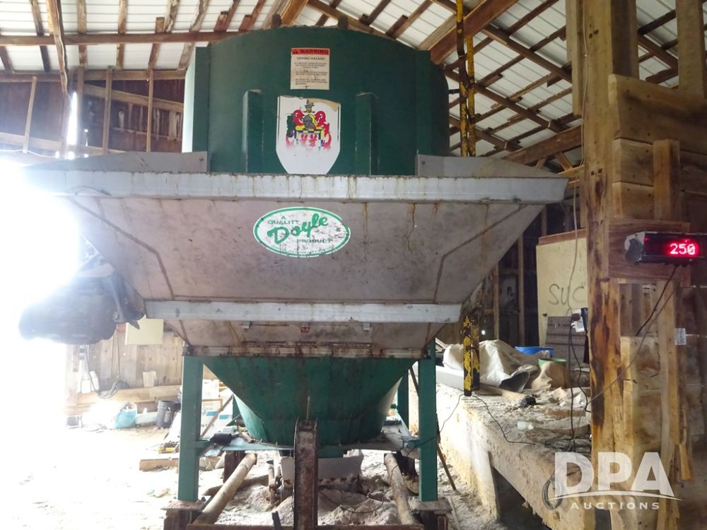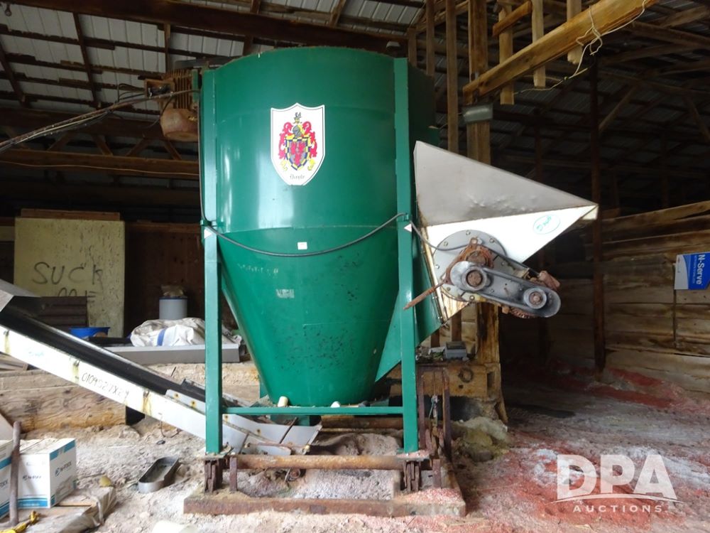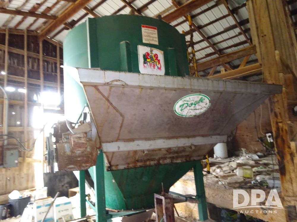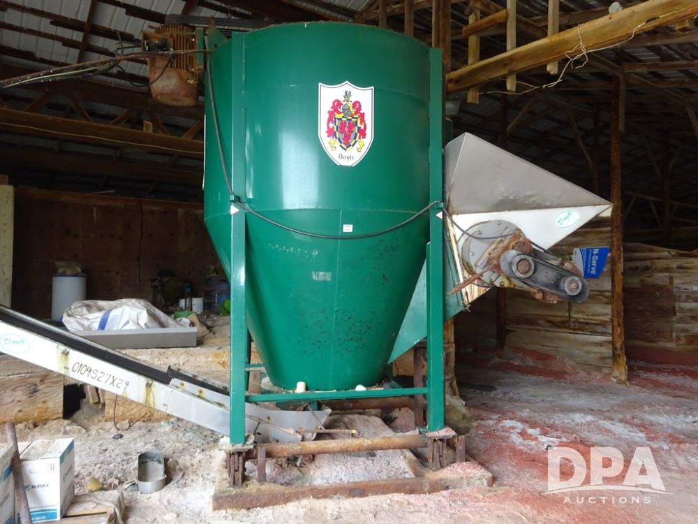 Doyle Vertical Dry Blender (PZ14120), Doyle vertival dry fertilizer blender, side mount hopper, Matko digital scale head, Doyle stationary discharge conveyor (S/N 0109S27X24), 27' length x 24" belt, electric motor.