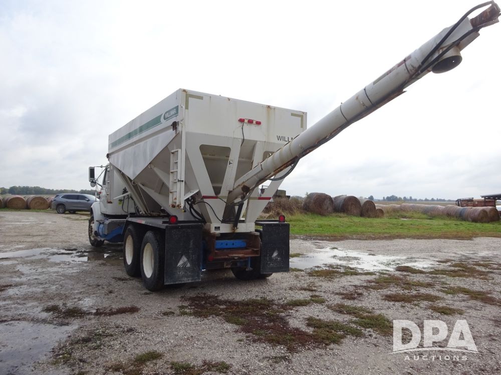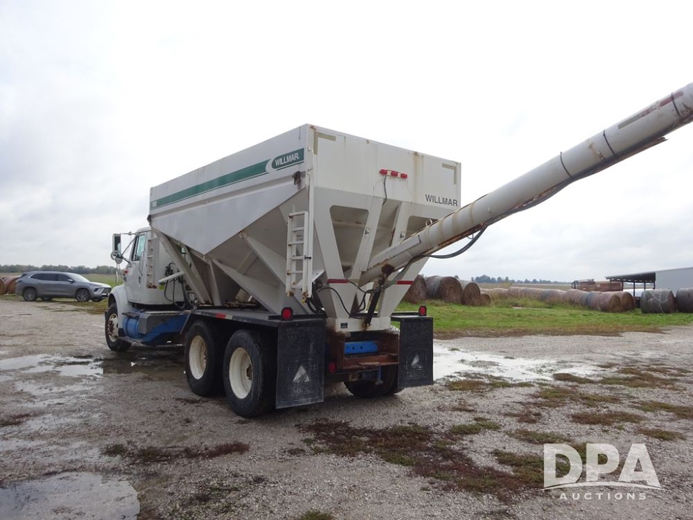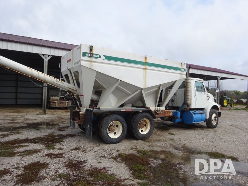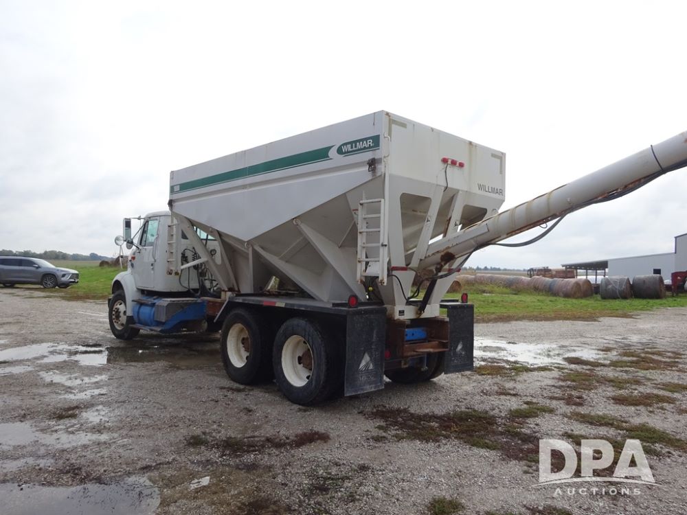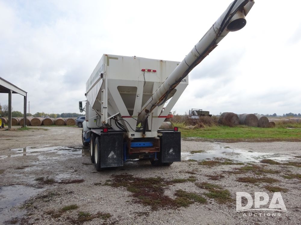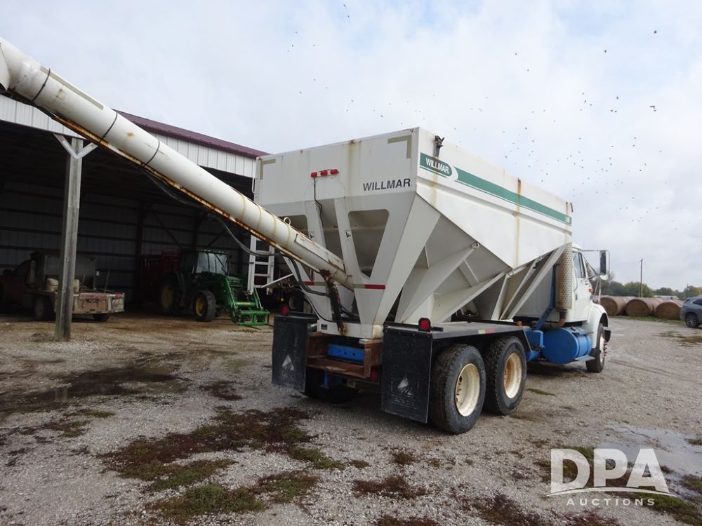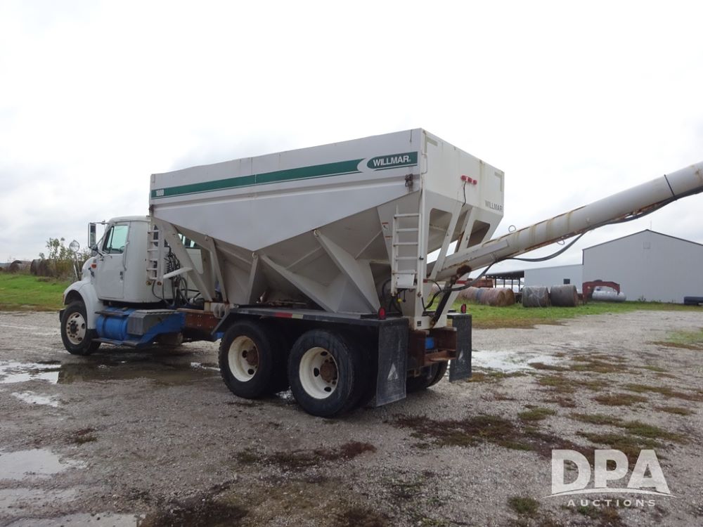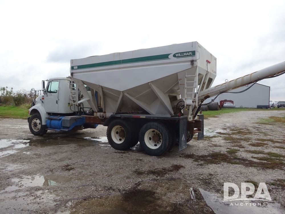 2003 International 8100 Dry Tender Truck (PZ14121), Cat diesel engine, Eaton Fuller 10 speed transmission, heat, Am/Fm radio, cruise control, tandem axle, air ride suspension, Willmar 1600 dry tender box, rear discharge auger, hydraulic, dual fuel tanks, single exhaust, 11R22.5 tires, shows 377,860 miles.