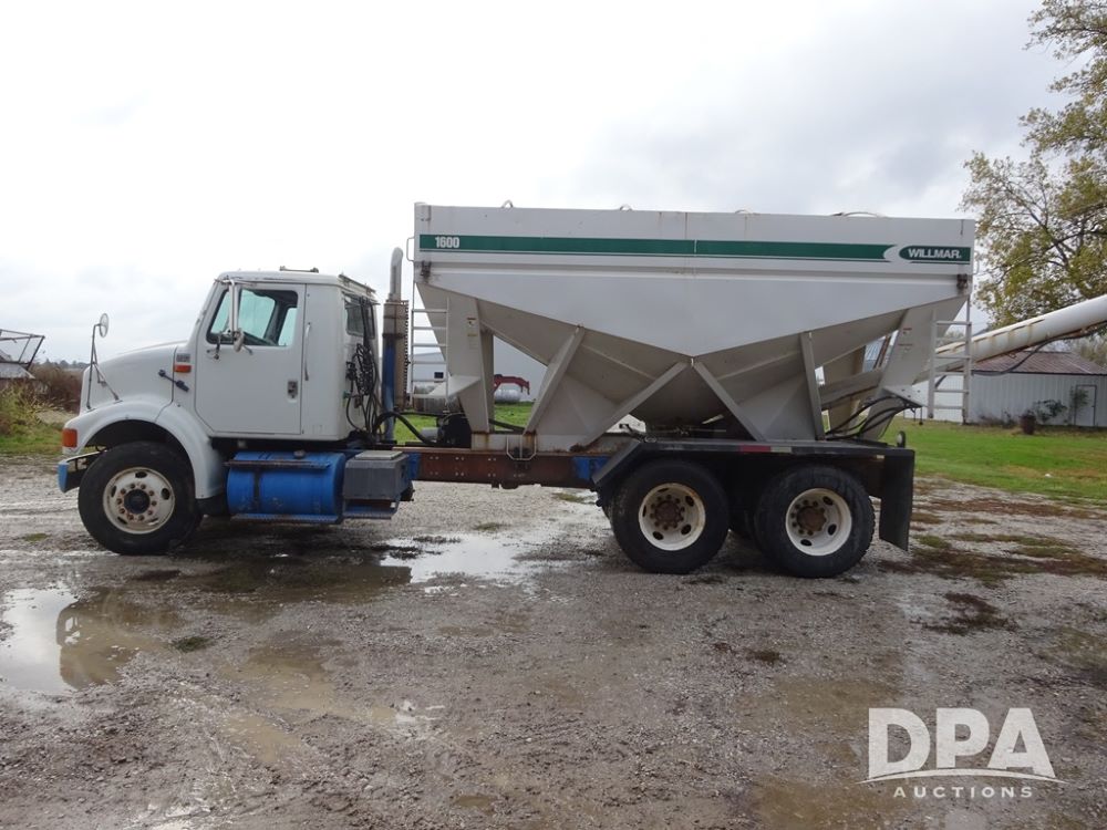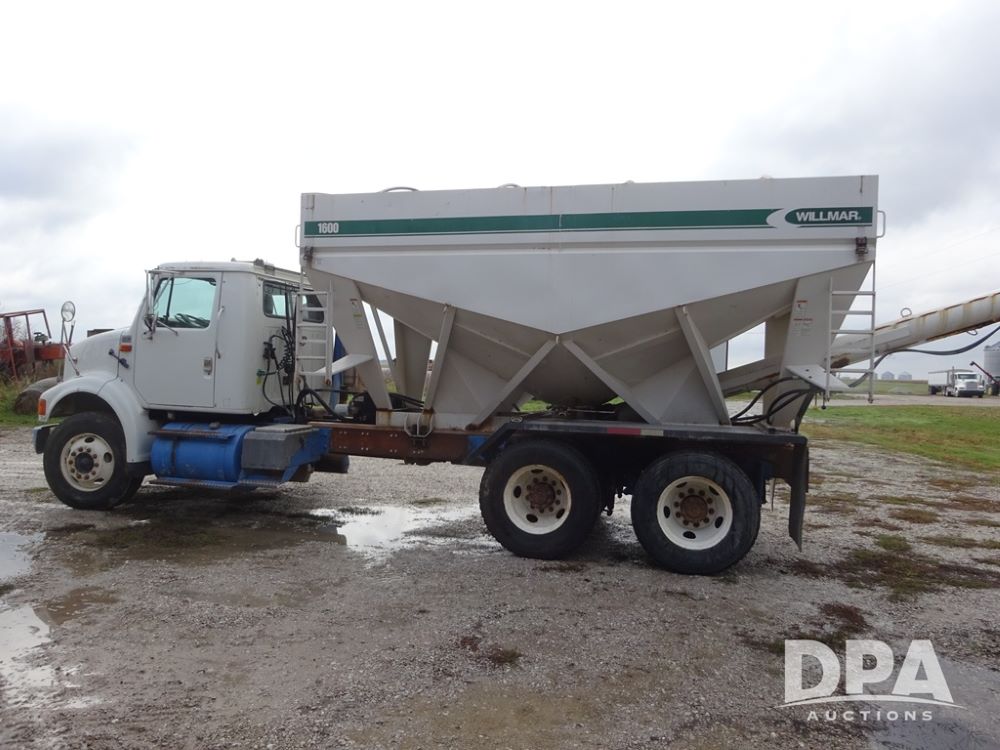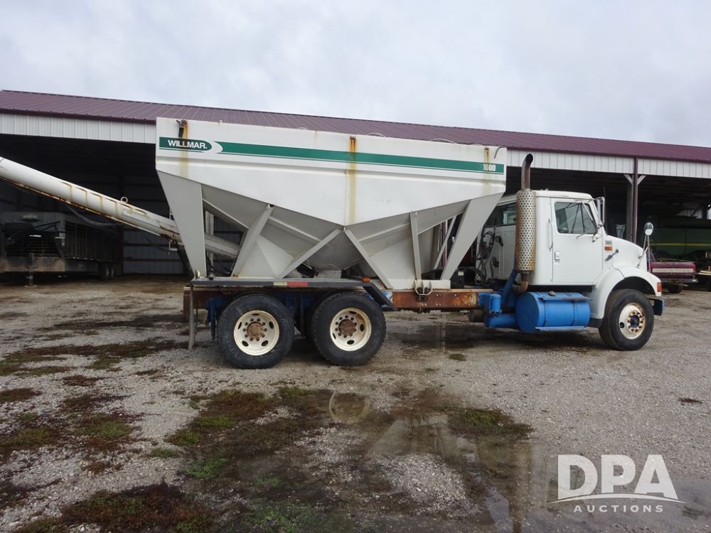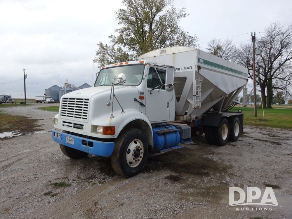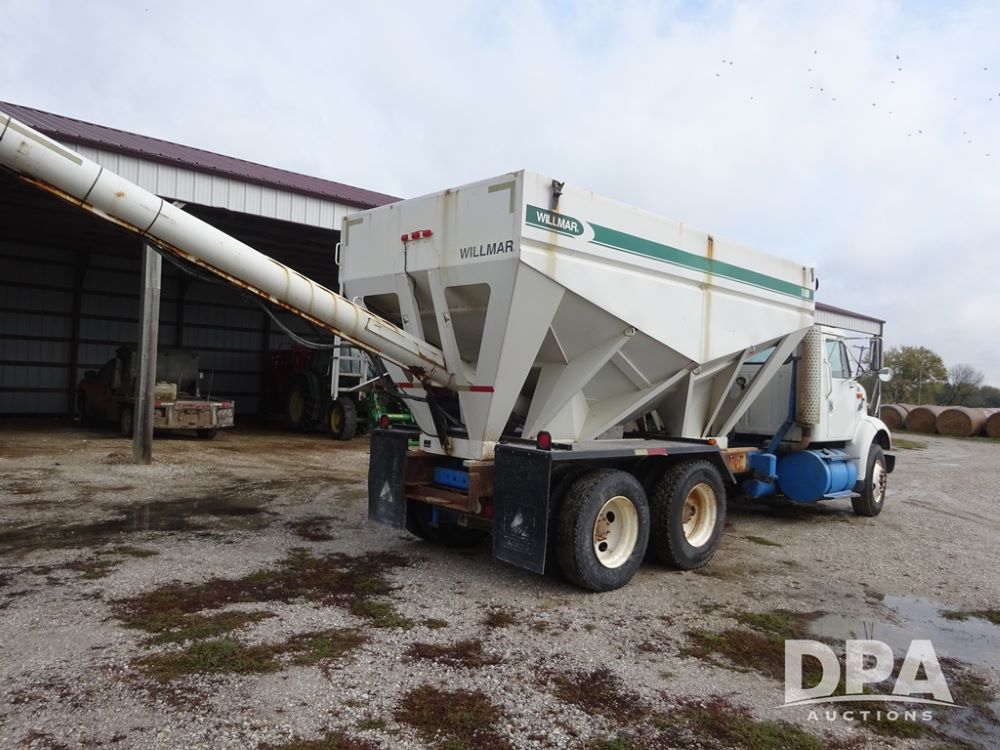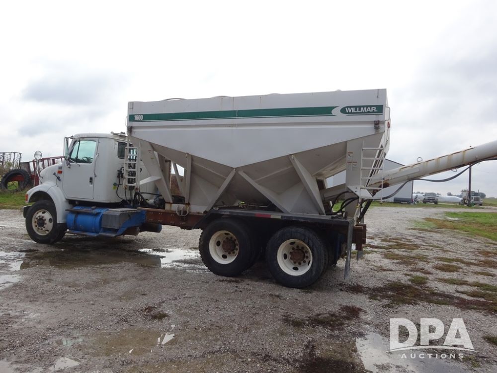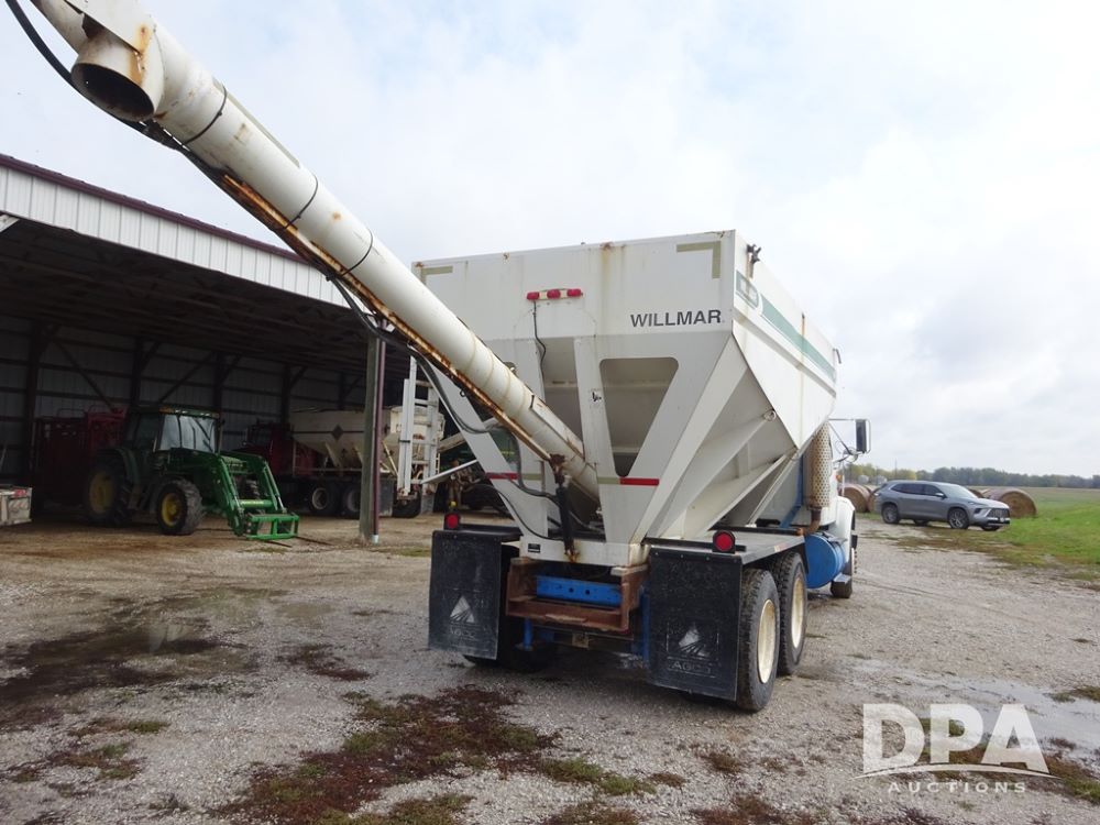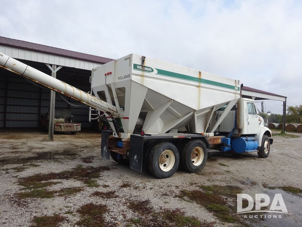 2003 International 8100 Dry Tender Truck (PZ14121), Cat diesel engine, Eaton Fuller 10 speed transmission, heat, Am/Fm radio, cruise control, tandem axle, air ride suspension, Willmar 1600 dry tender box, rear discharge auger, hydraulic, dual fuel tanks, single exhaust, 11R22.5 tires, shows 377,860 miles.