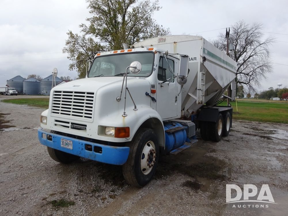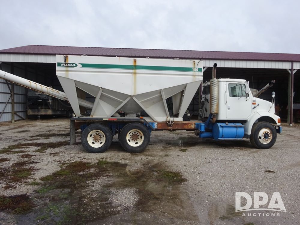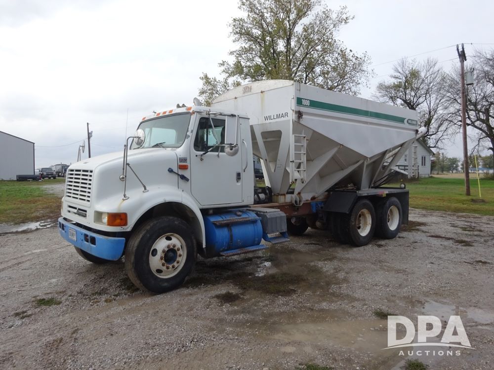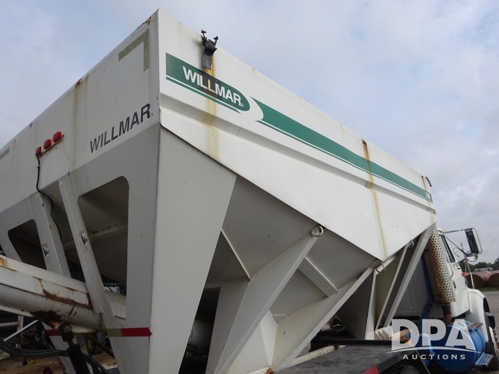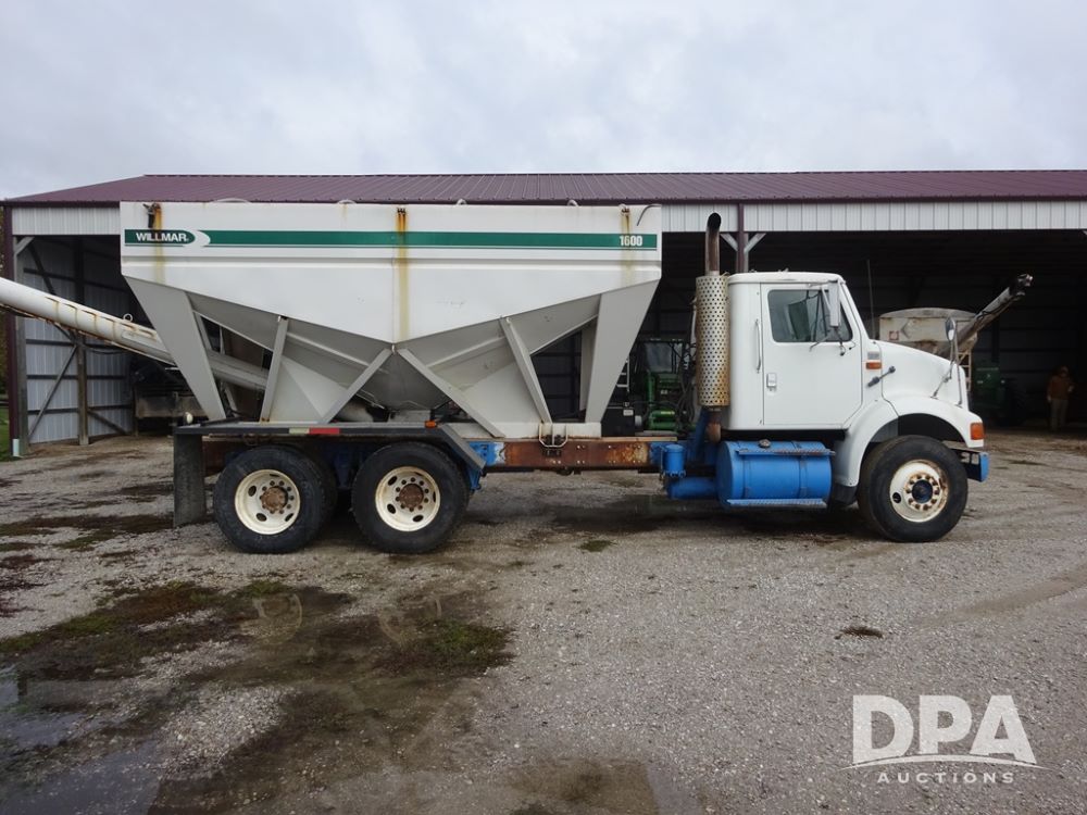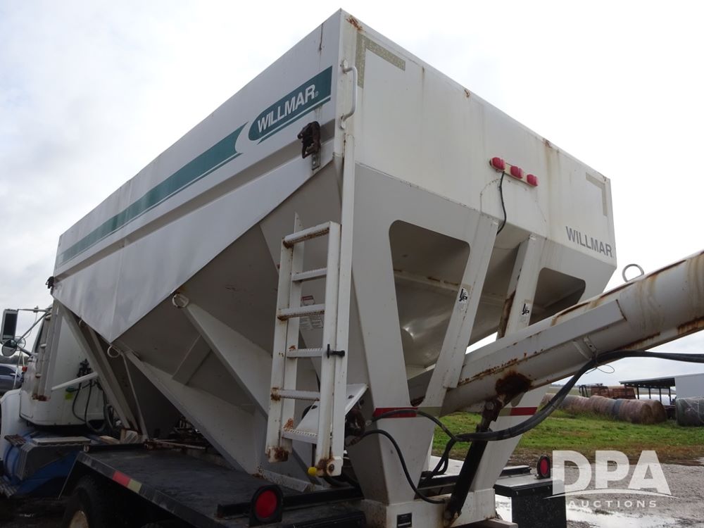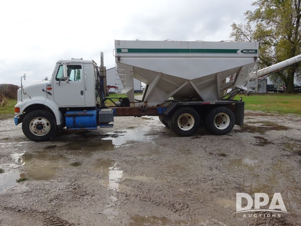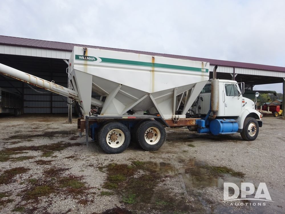 2003 International 8100 Dry Tender Truck (PZ14121), Cat diesel engine, Eaton Fuller 10 speed transmission, heat, Am/Fm radio, cruise control, tandem axle, air ride suspension, Willmar 1600 dry tender box, rear discharge auger, hydraulic, dual fuel tanks, single exhaust, 11R22.5 tires, shows 377,860 miles.