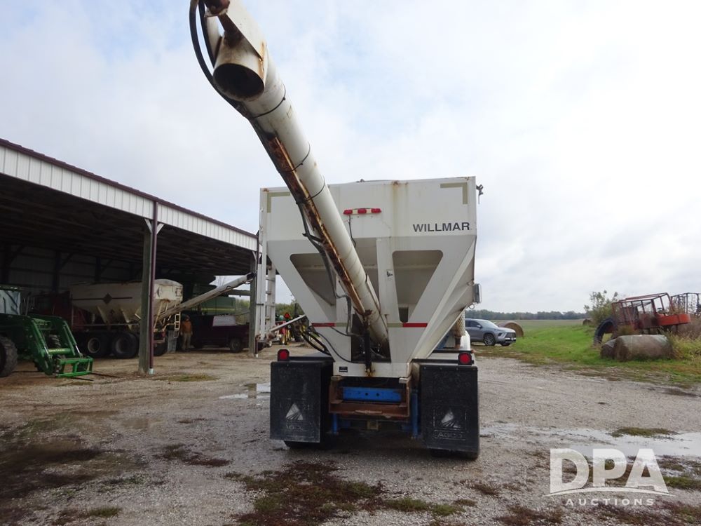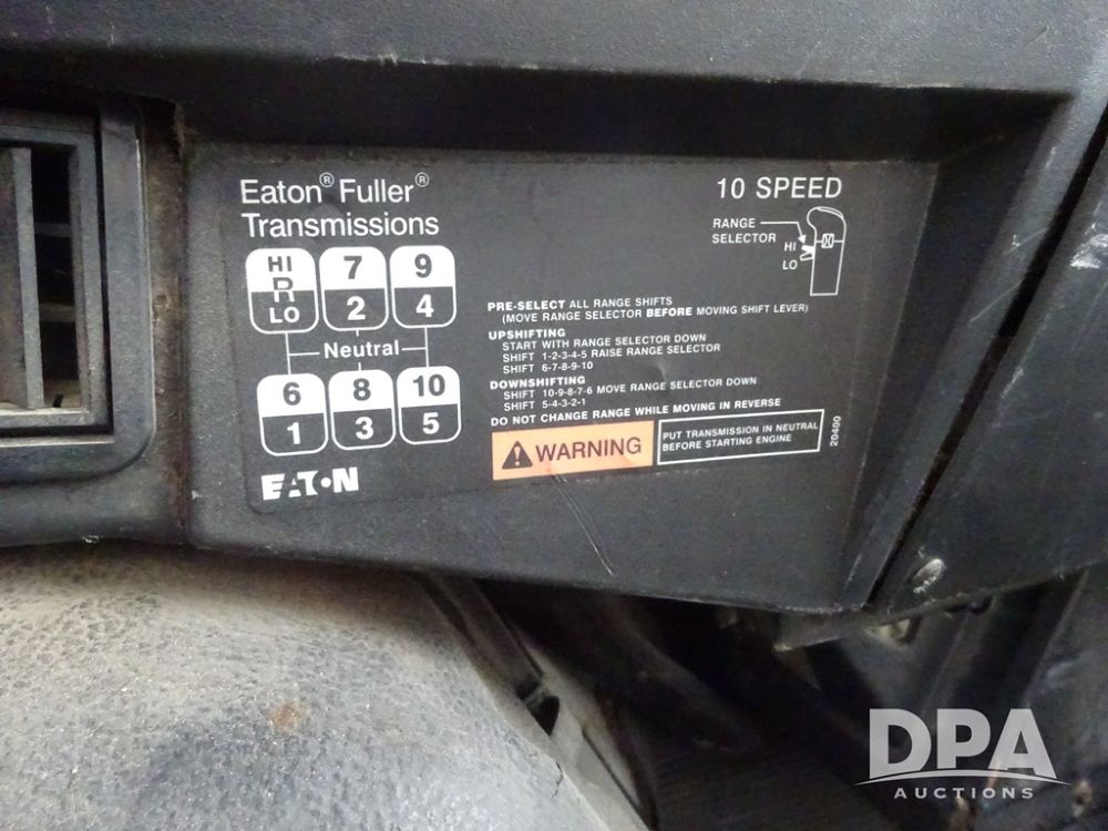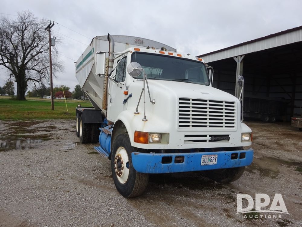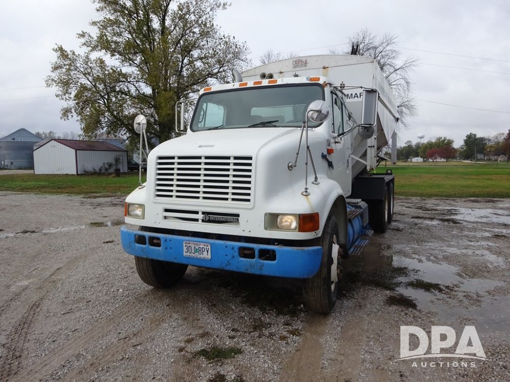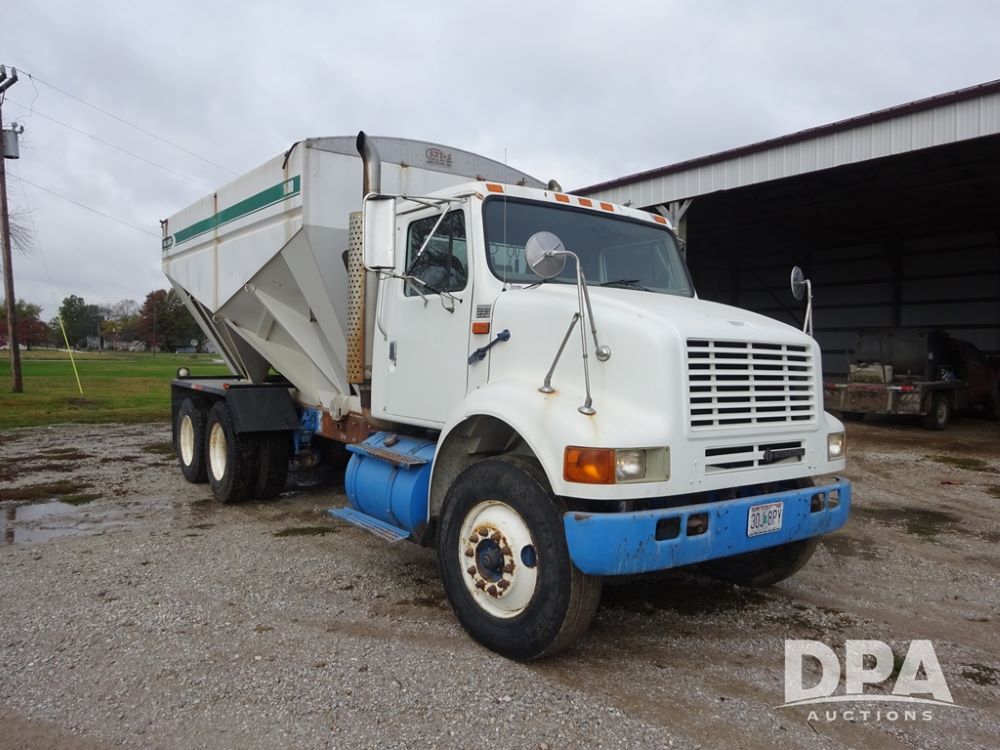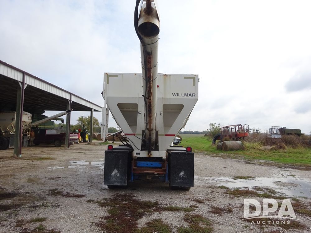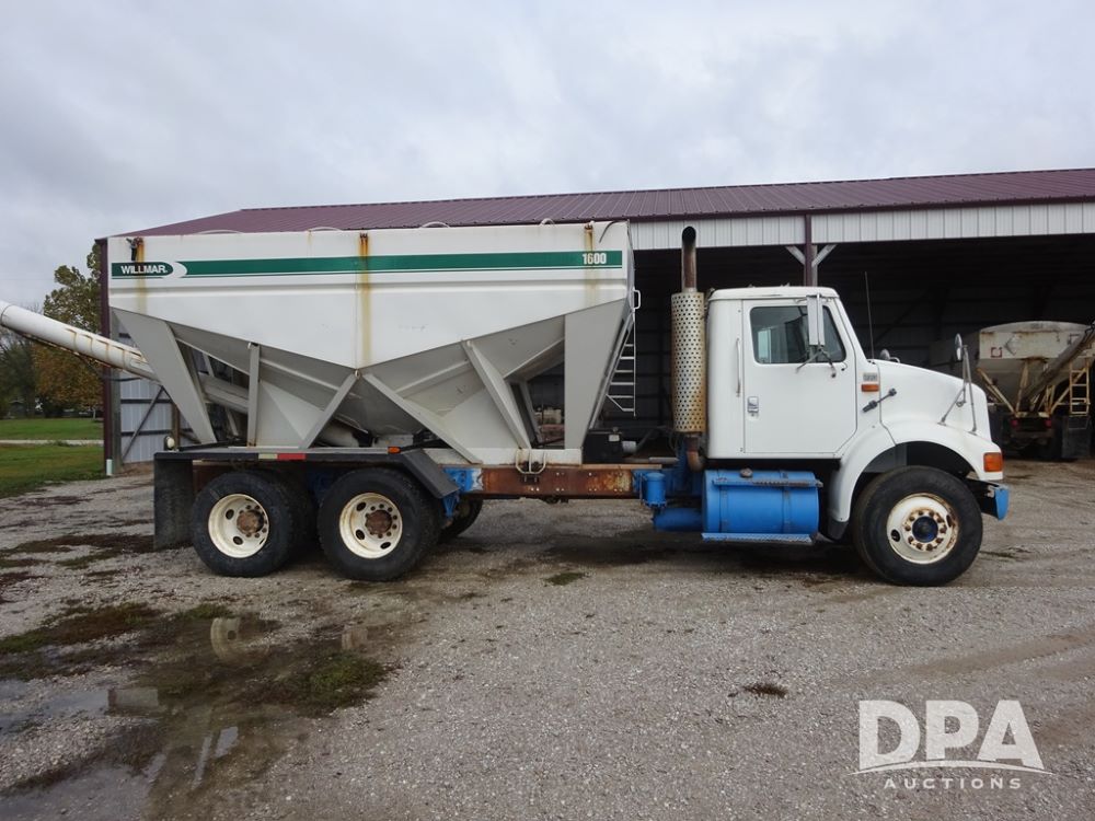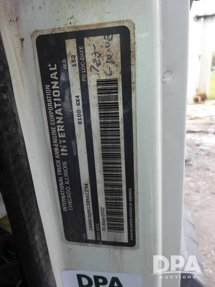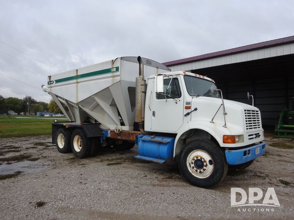2003 International 8100 Dry Tender Truck (PZ14121), Cat diesel engine, Eaton Fuller 10 speed transmission, heat, Am/Fm radio, cruise control, tandem axle, air ride suspension, Willmar 1600 dry tender box, rear discharge auger, hydraulic, dual fuel tanks, single exhaust, 11R22.5 tires, shows 377,860 miles.