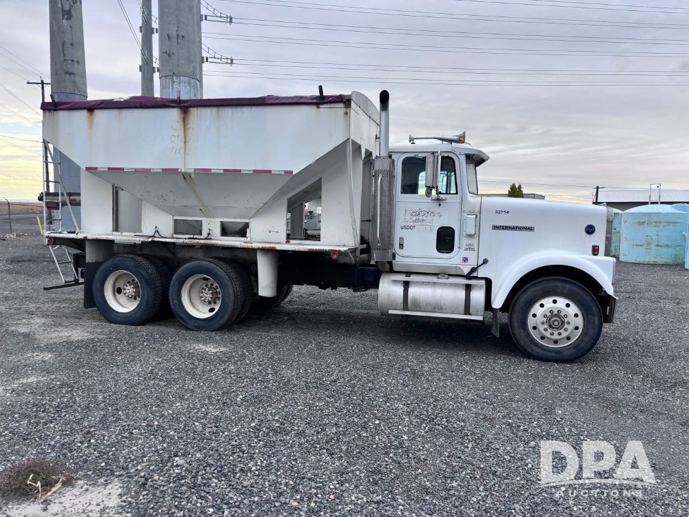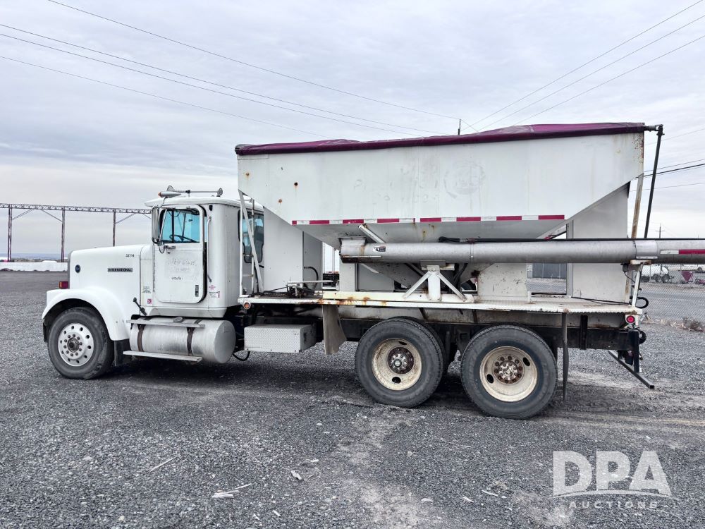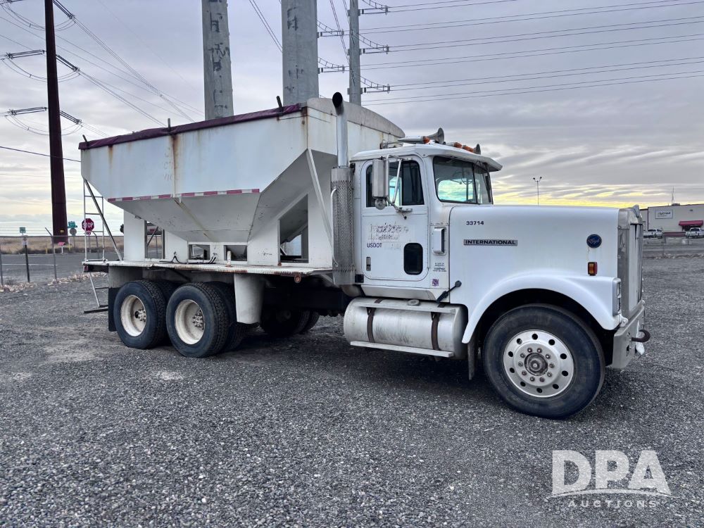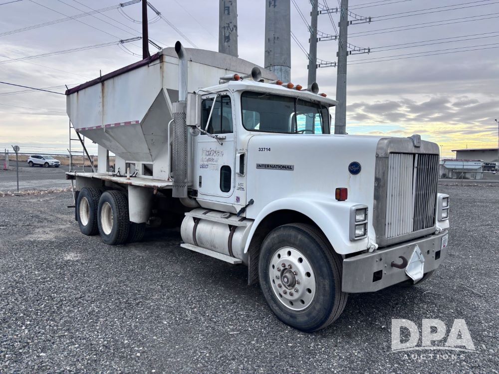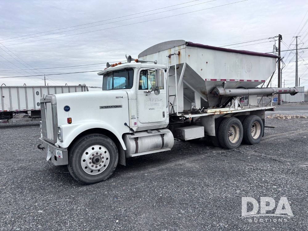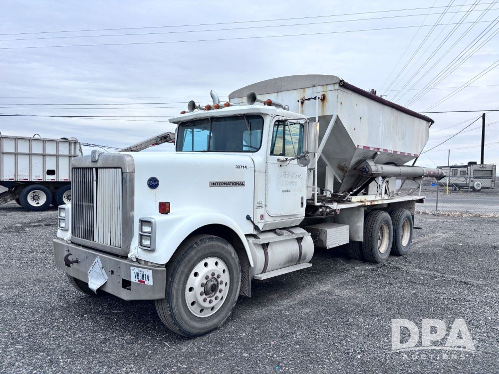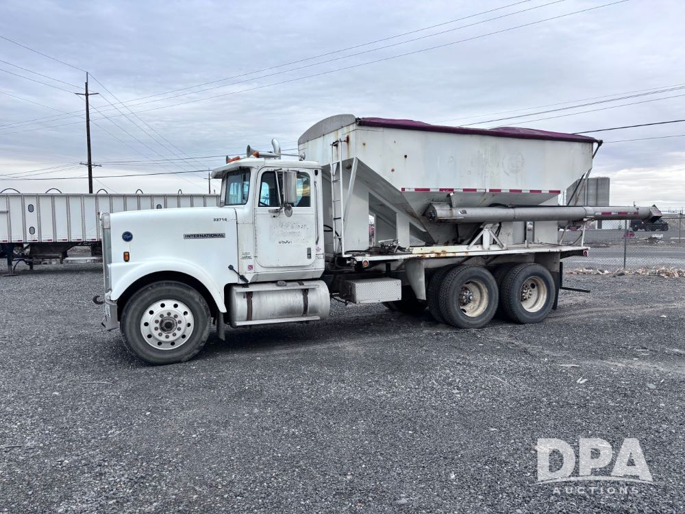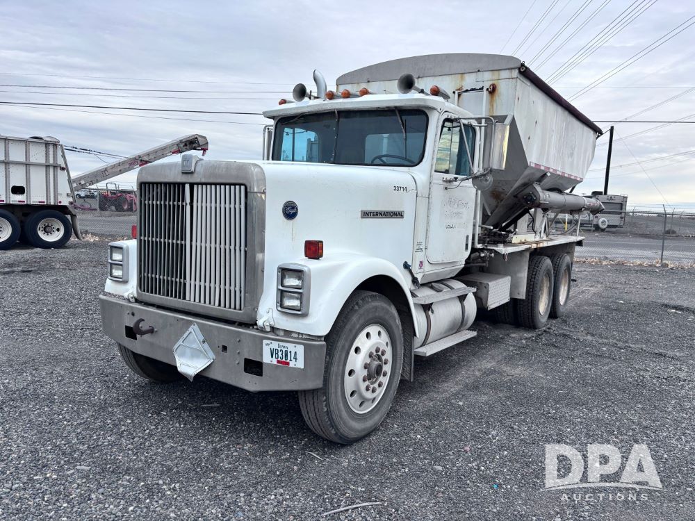 1986 IHC Eagle 9370 Dry Tender Truck (GP11922, Unit 33714), Cummins diesel engine, Eaton Fuller 13 speed transmission, air conditioning, heat, Am/Fm radio, engine brake, tandem axle, full screw, air ride suspension, 16 ton dry tender box, side discharge auger, all hydraulic, roll over tarp, 11R24.5 tires.