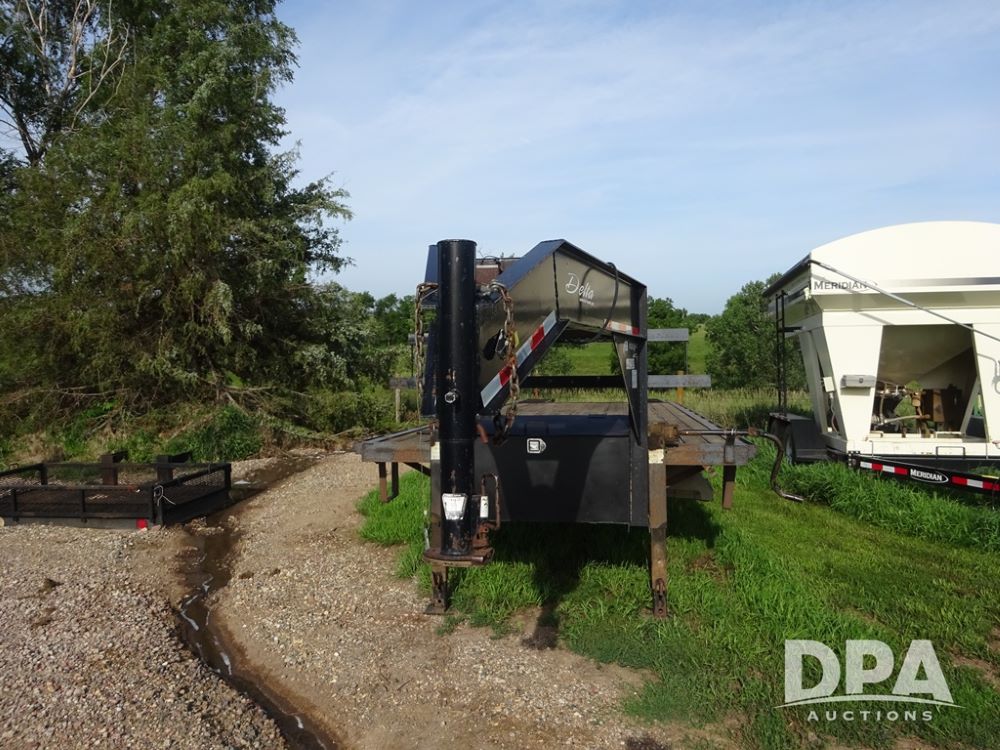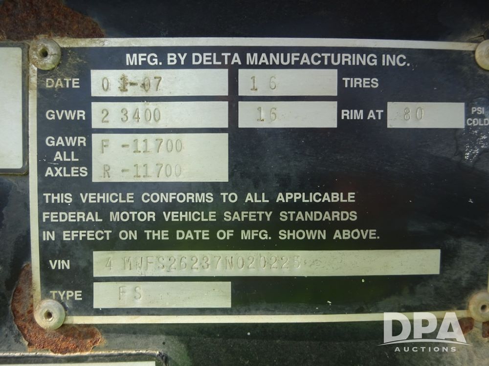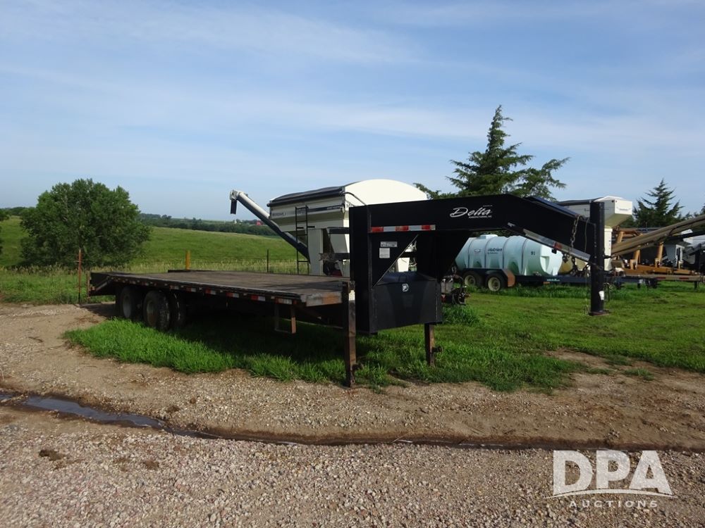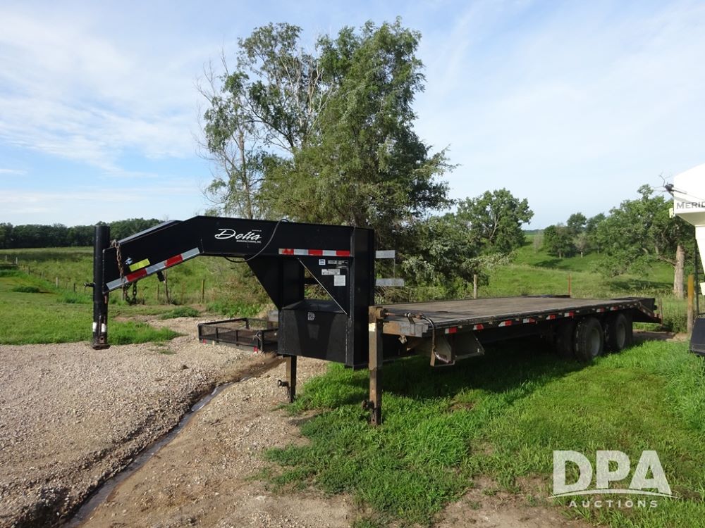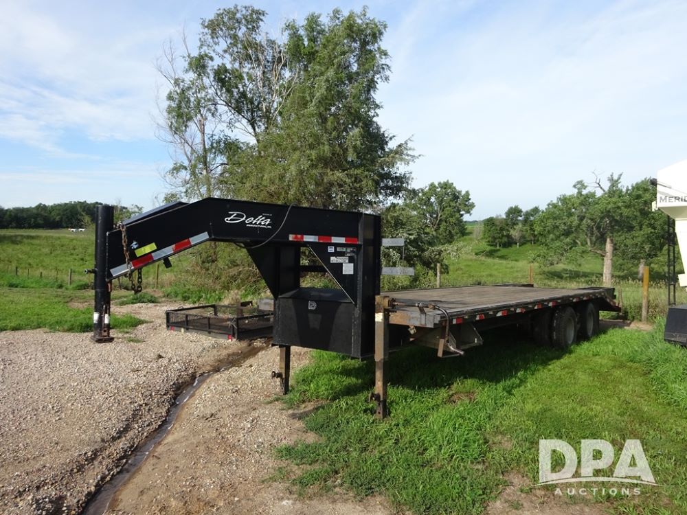 2007 Delta Trailer (PZ13712 Unit 33942), 26' gooseneck hitch trailer, rear beaver tail, rear manual ramps, front mounted storage box, rear manual outriggers, tandem dual wheeled axles 12,000 GVW each, 235/80R16 tires.