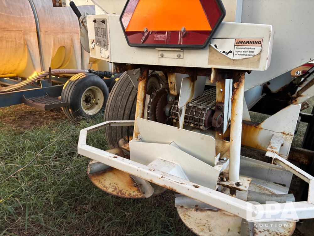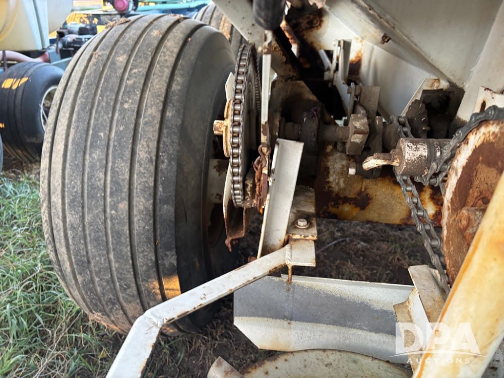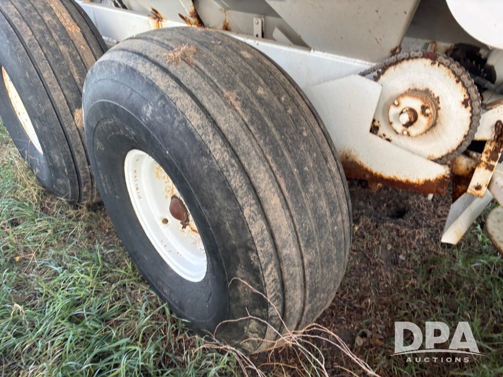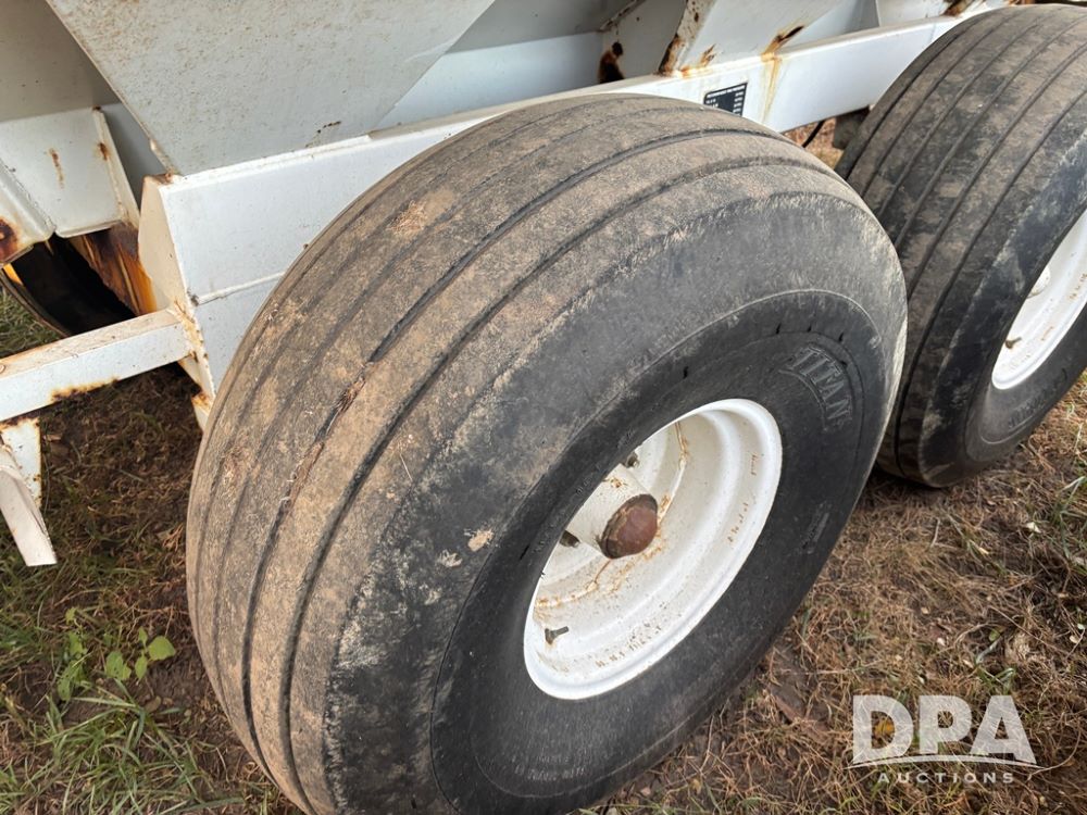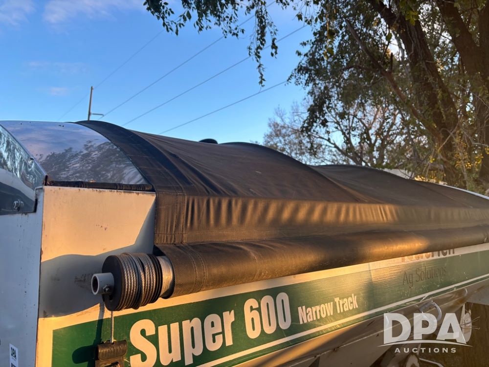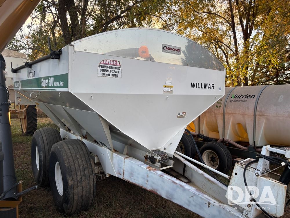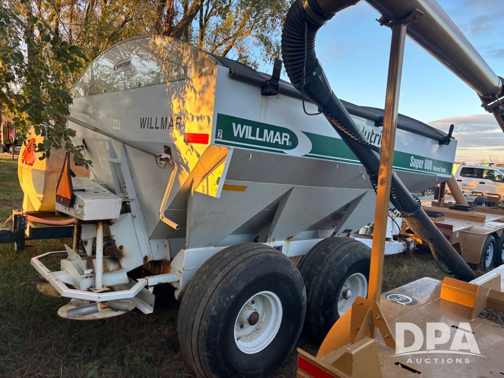 Willmar Spreader (DR12659 Unit 2), model Super 600 Narrow Track pull spreader buggy, 2 speed ground drive web chain, dual PTO drive spinner pans, hydraulic shut off, roll over tarp, 16.5L-16.1 tires.