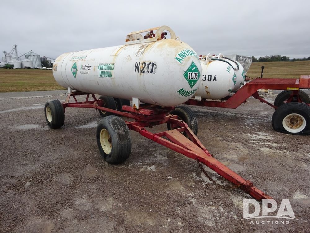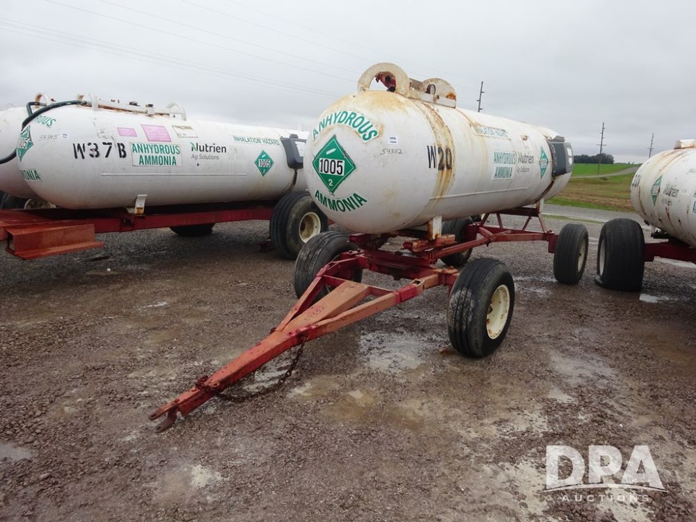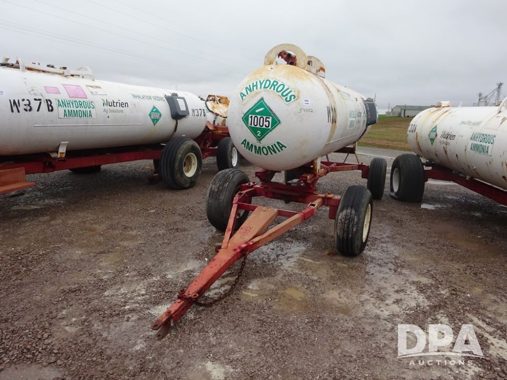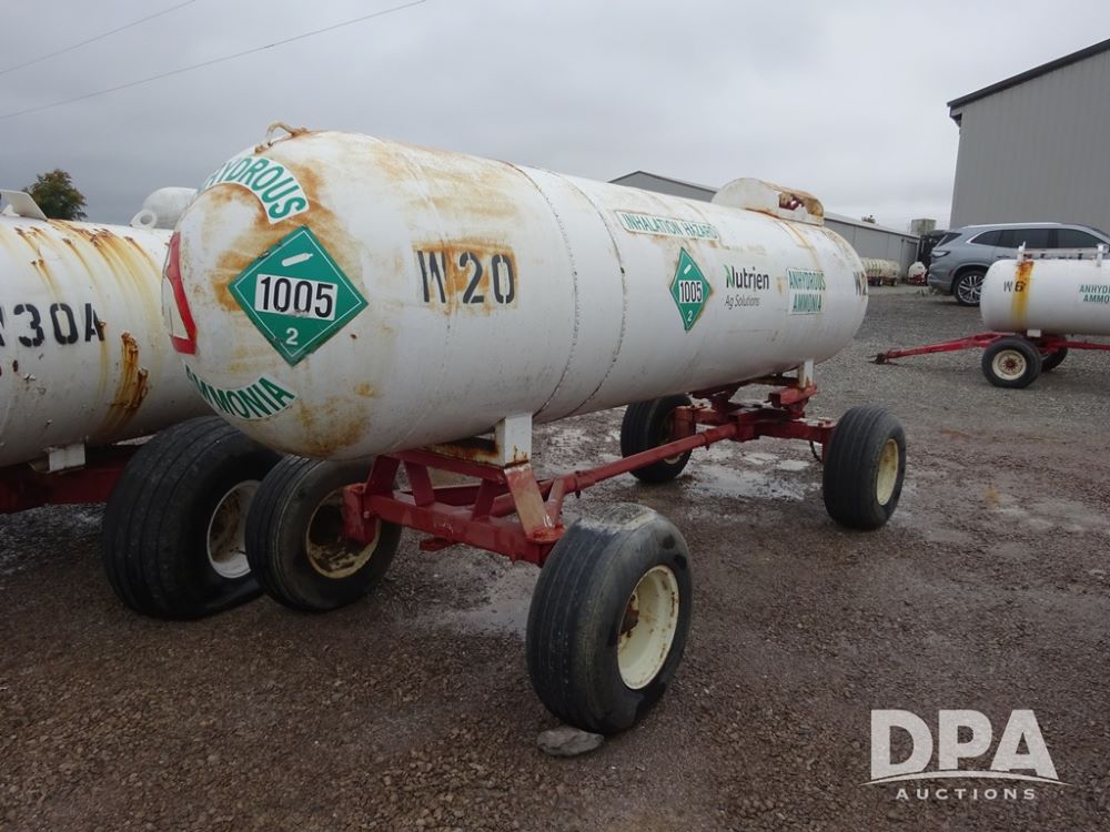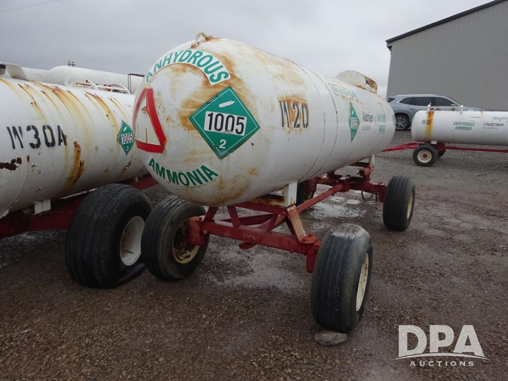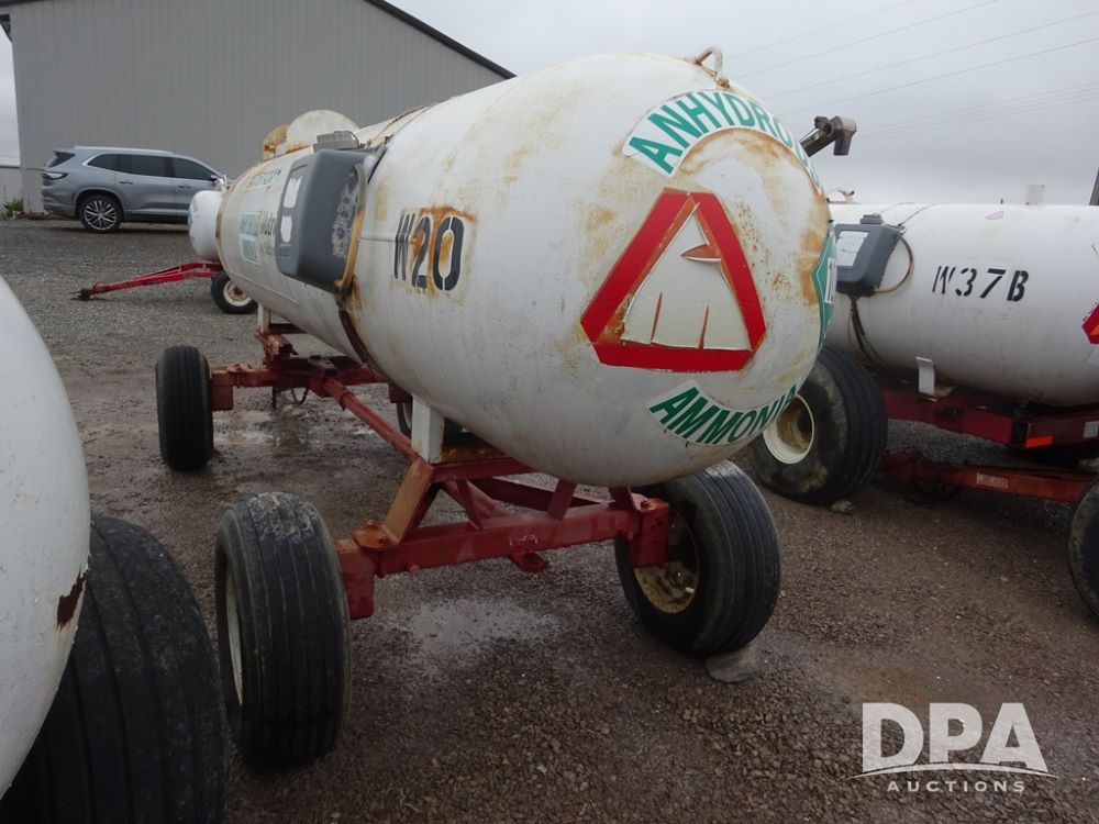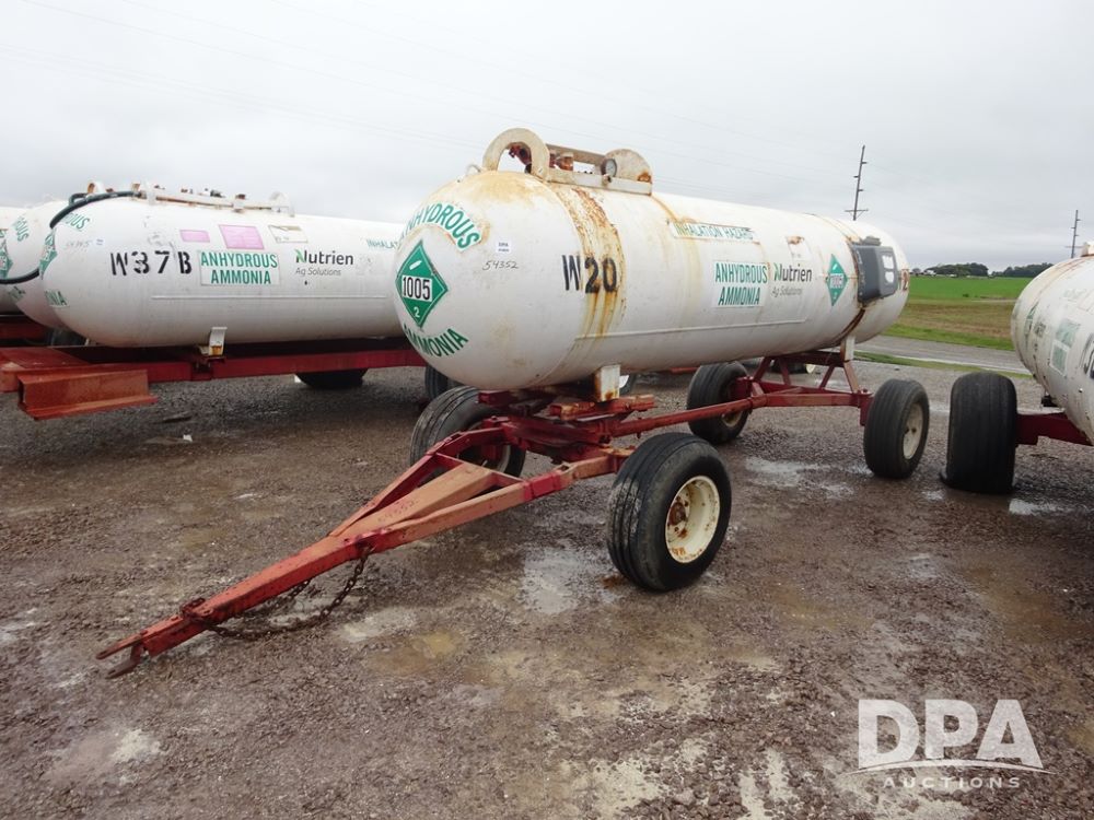 NH3 Nurse Tank (PZ14020, Unit 54352, Tank W20), 1000 gallon NH3 nurse tank, top front fill, poly water tank, no data plate, VTP 1-19, 5th wheel adjustable running gear, 11L-15 flotation tires.