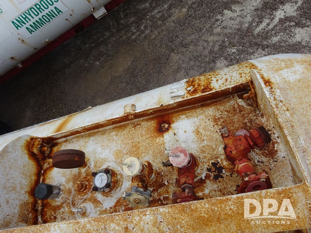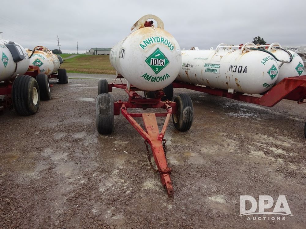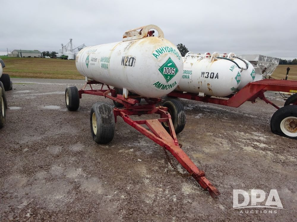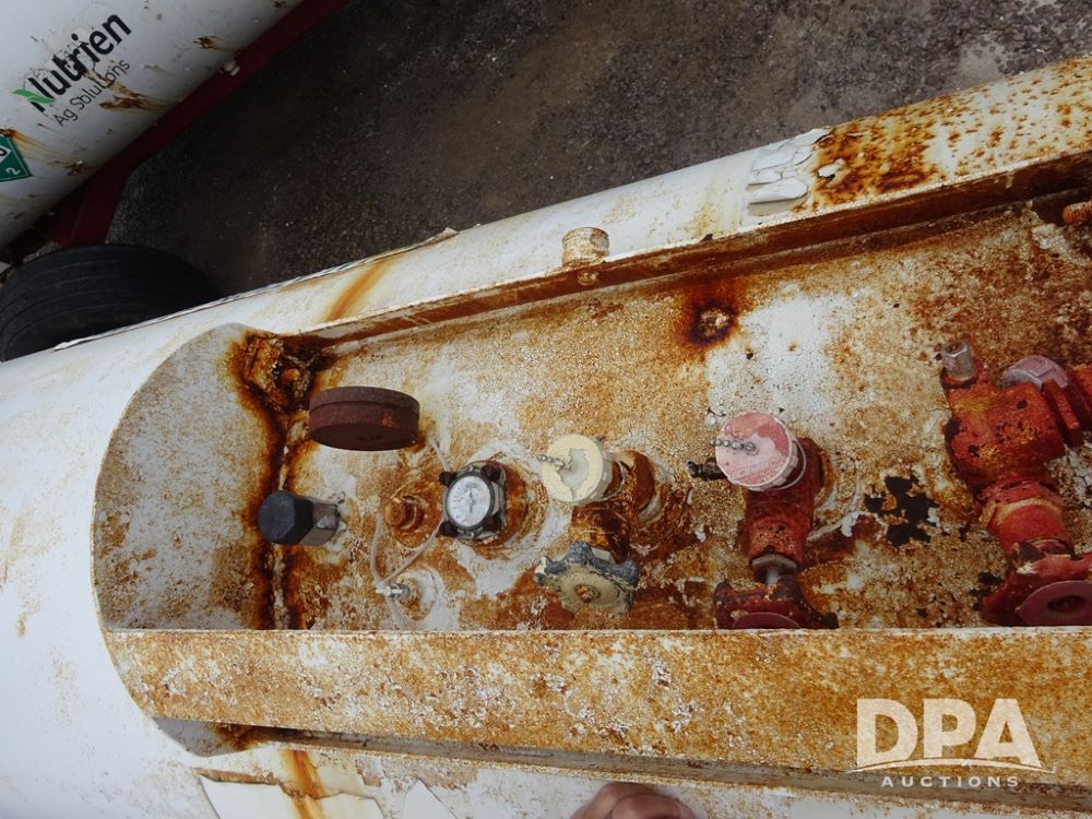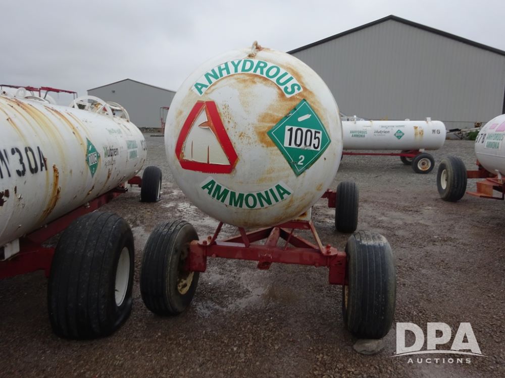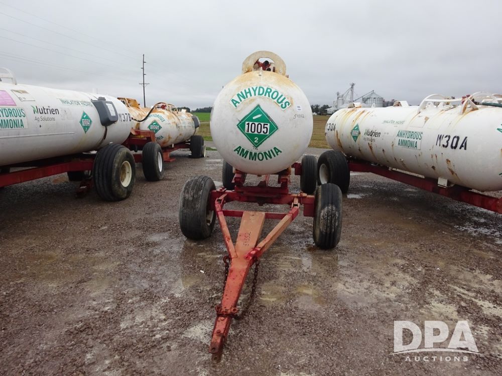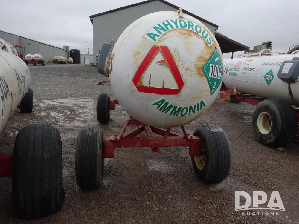 NH3 Nurse Tank (PZ14020, Unit 54352, Tank W20), 1000 gallon NH3 nurse tank, top front fill, poly water tank, no data plate, VTP 1-19, 5th wheel adjustable running gear, 11L-15 flotation tires.