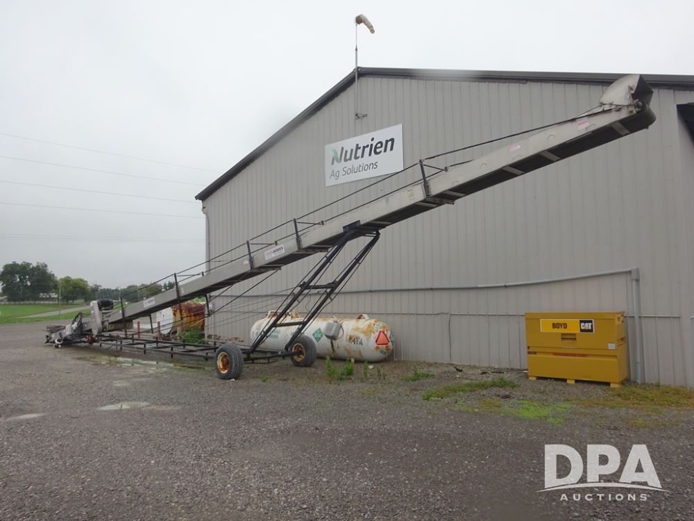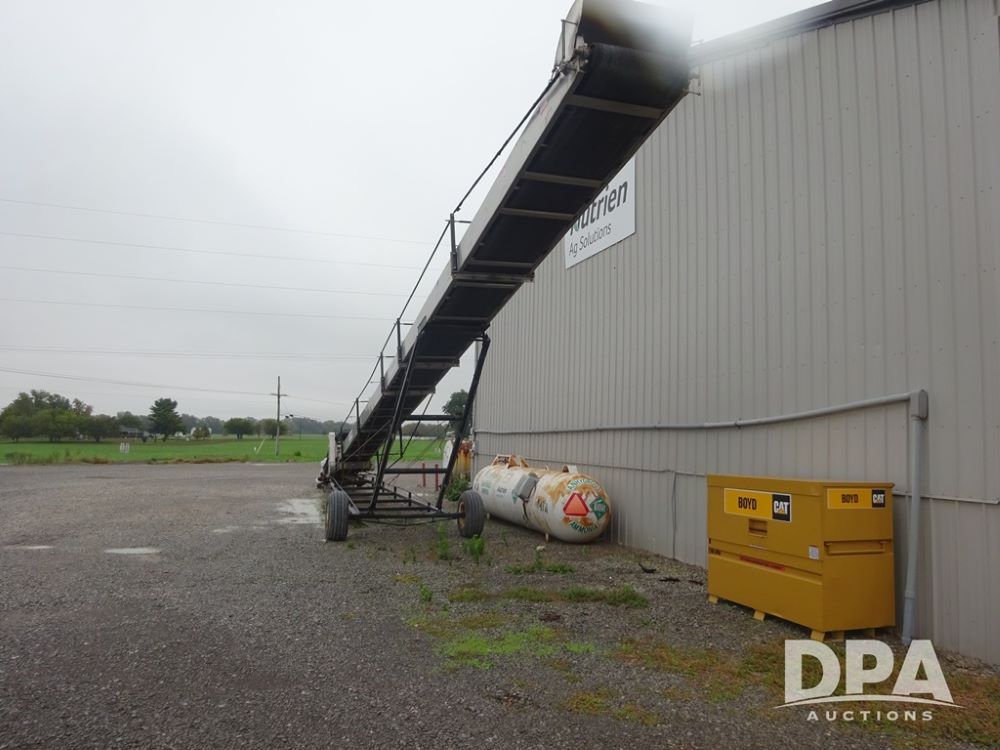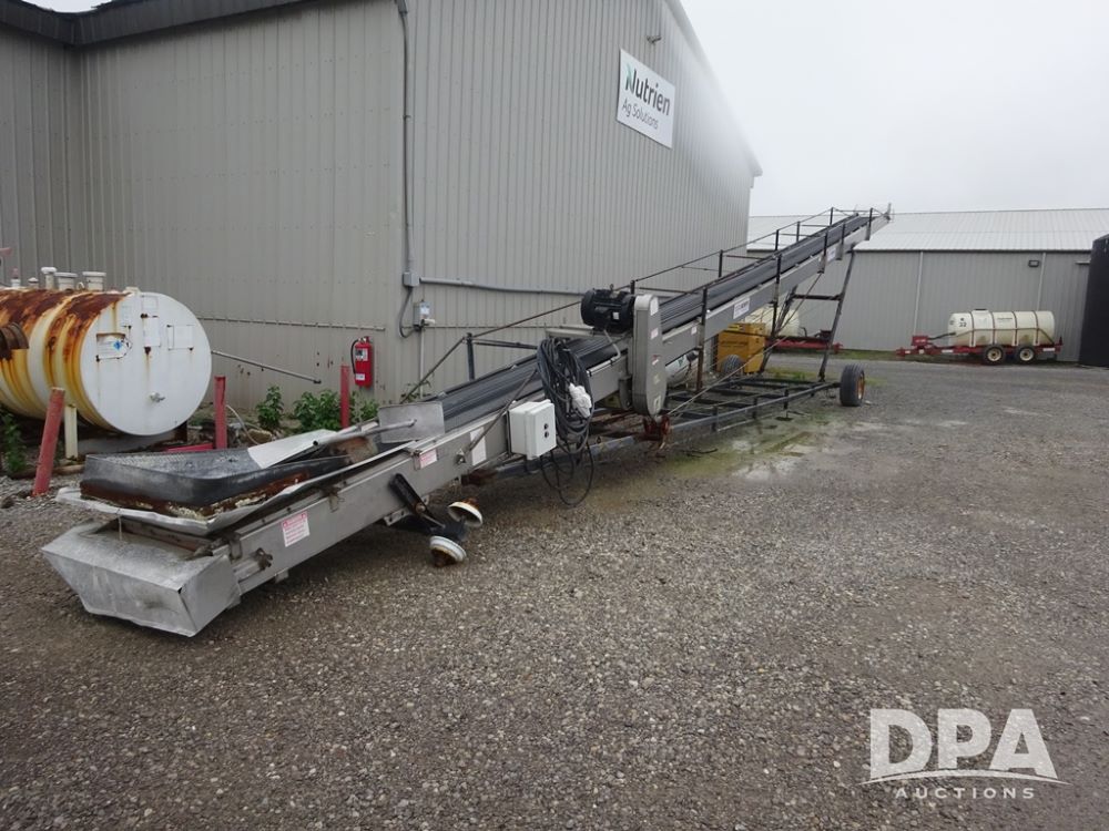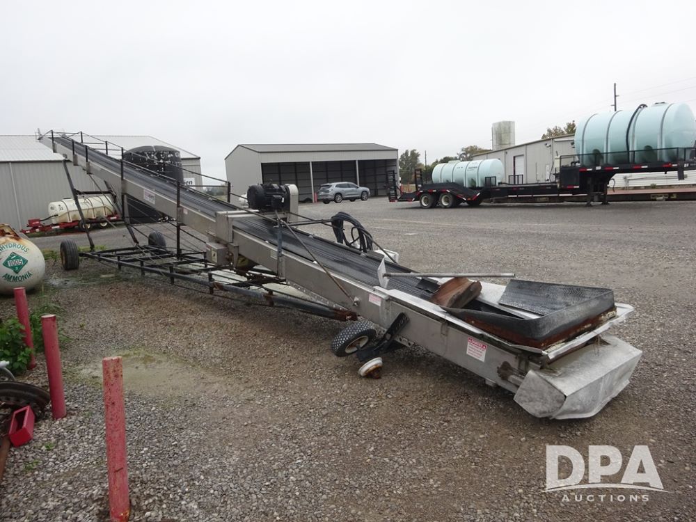 Adams Dry Fertilizer Conveyor (PZ14050, Unit 101993), Adams model PORT 24-65-6019 stainless steel belt conveyor, Baldor 15 hp electric motor, cord, control box, portable, 11L-15 flotation tires.