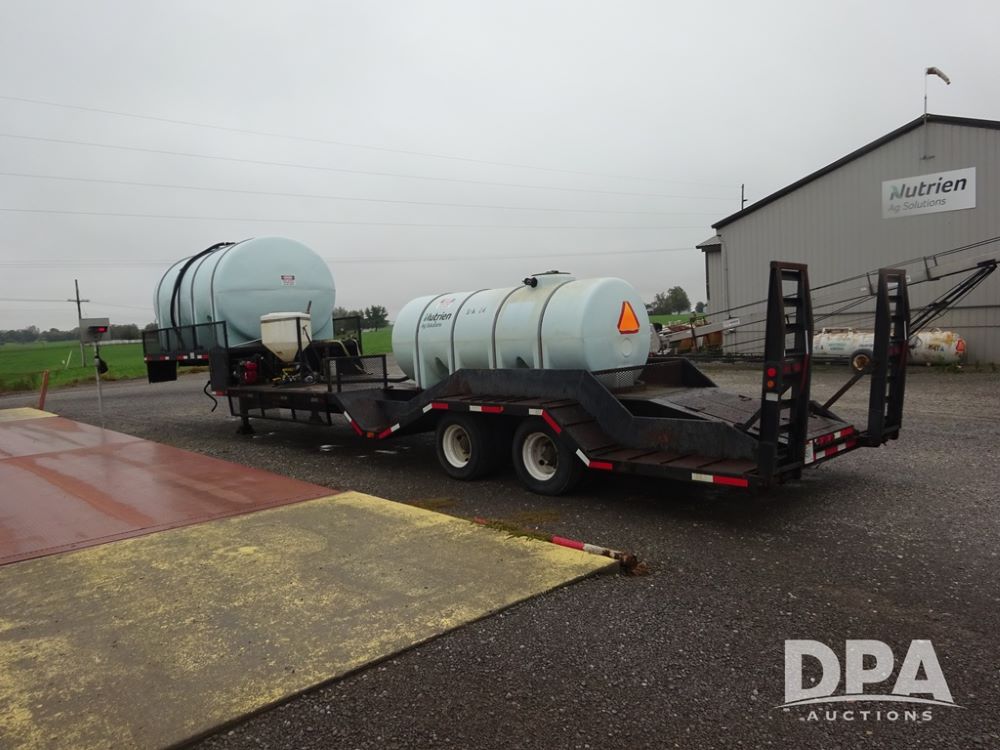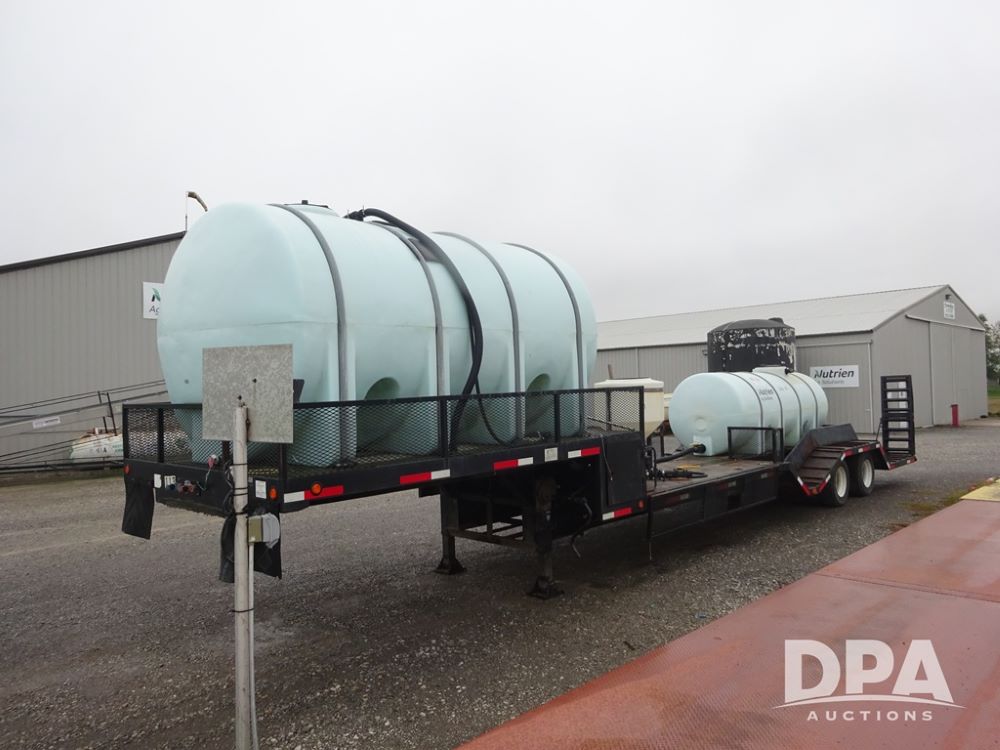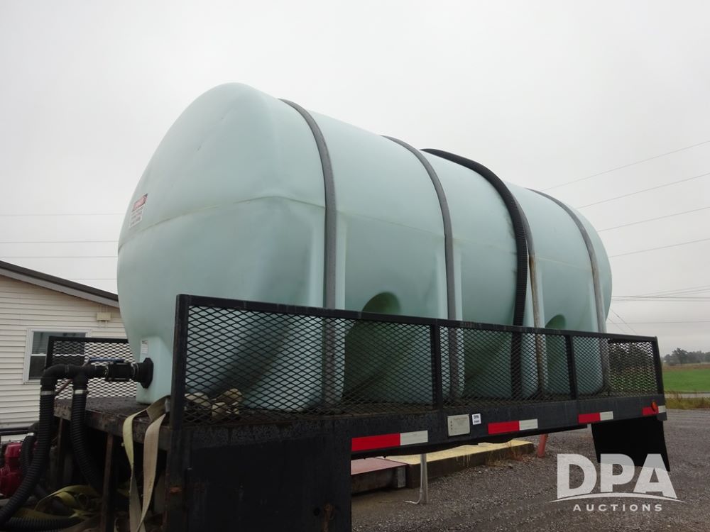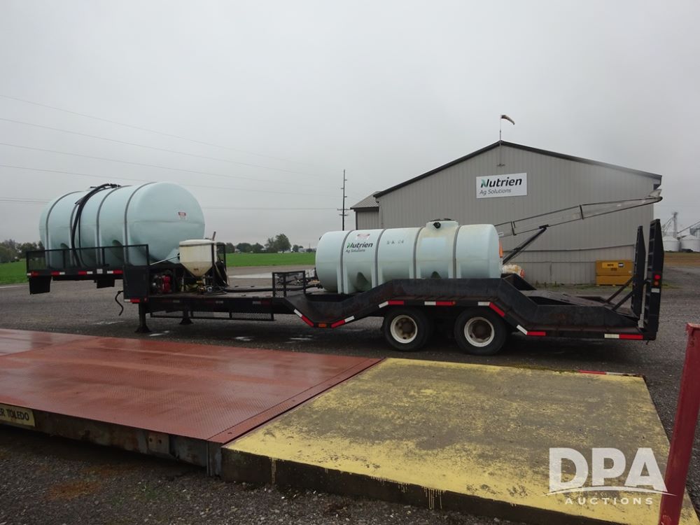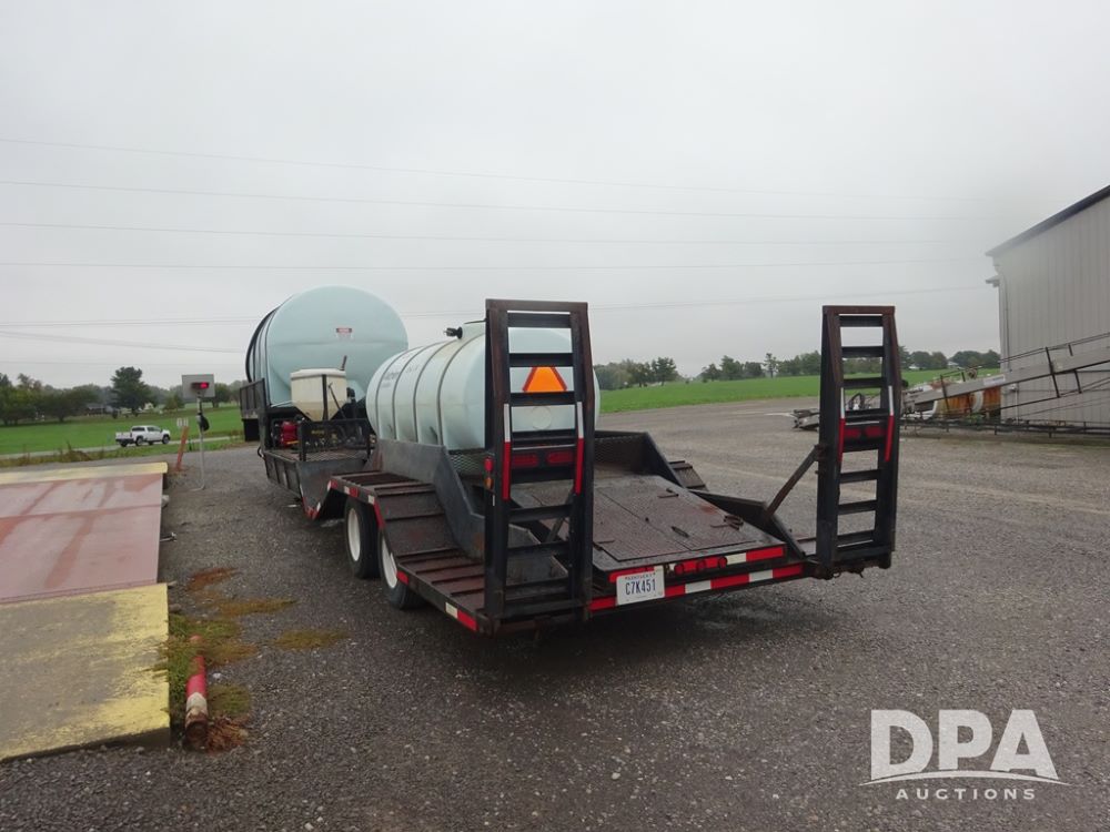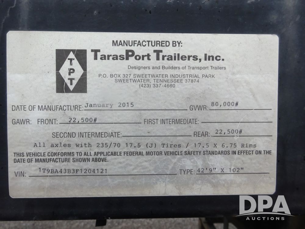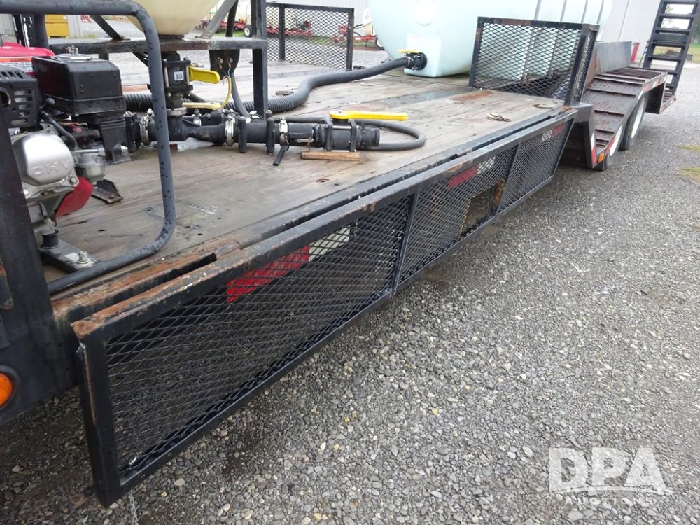 2015 TarasPort Liquid Sprayer Trailer (PZ14052, Unit 109067), 2015 TarasPort model 42'9" - 102" liquid sprayer trailer, 80,000 # GVWR, 1000 gallon poly liquid tank, 3000 gallon poly liquid tank, 55 gallon poly chemical inductor, Honda GX160 gas engine, pump, fold down sides, 5' manual fold down ramps, tandem axle, spring suspension, 235/75R17.5 tires.