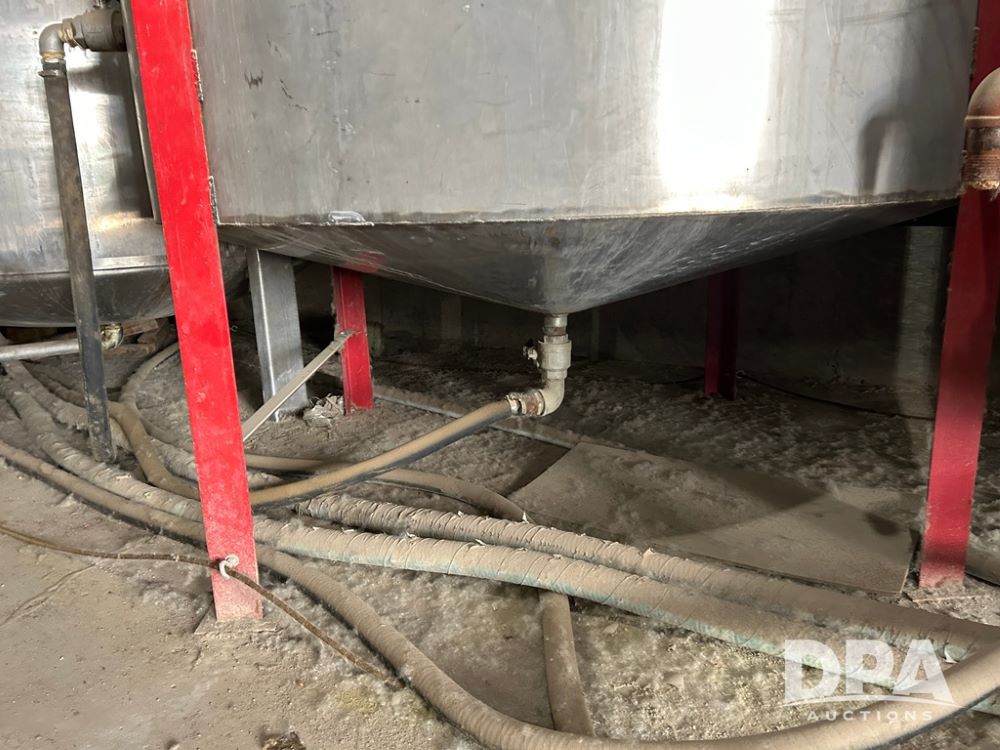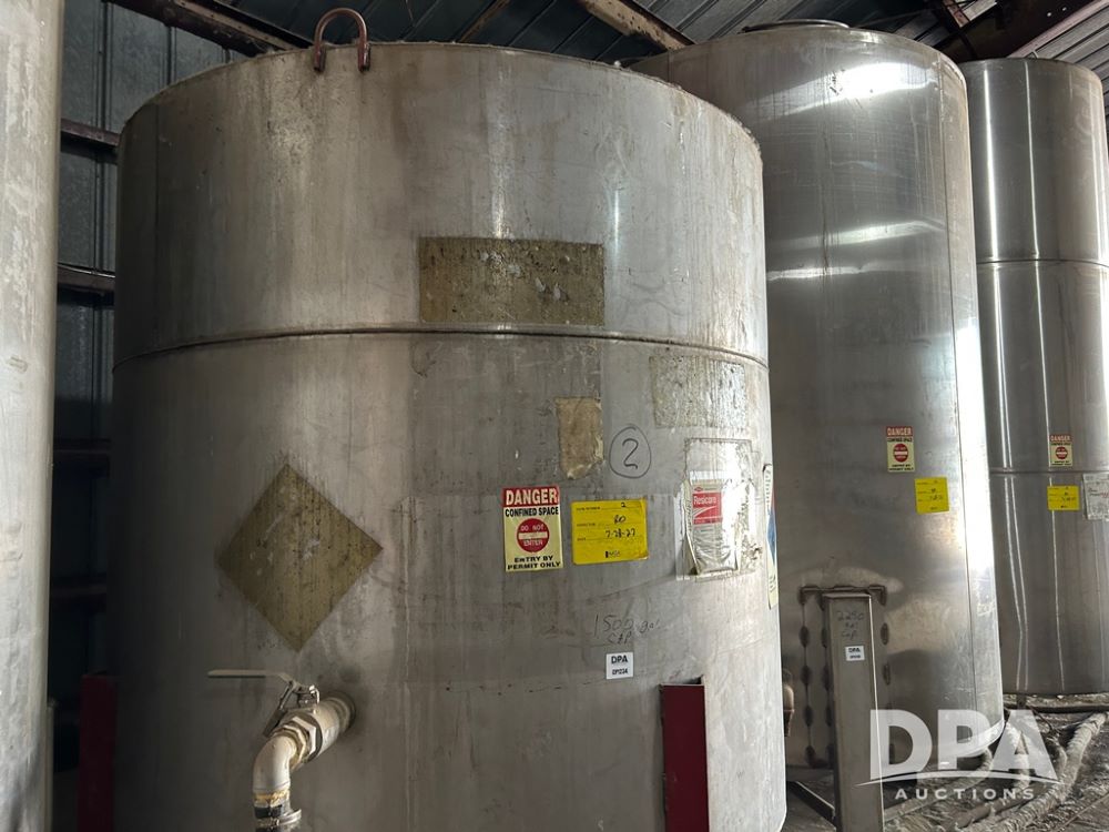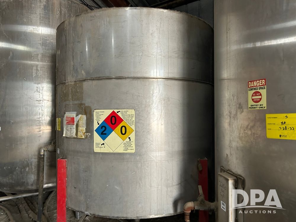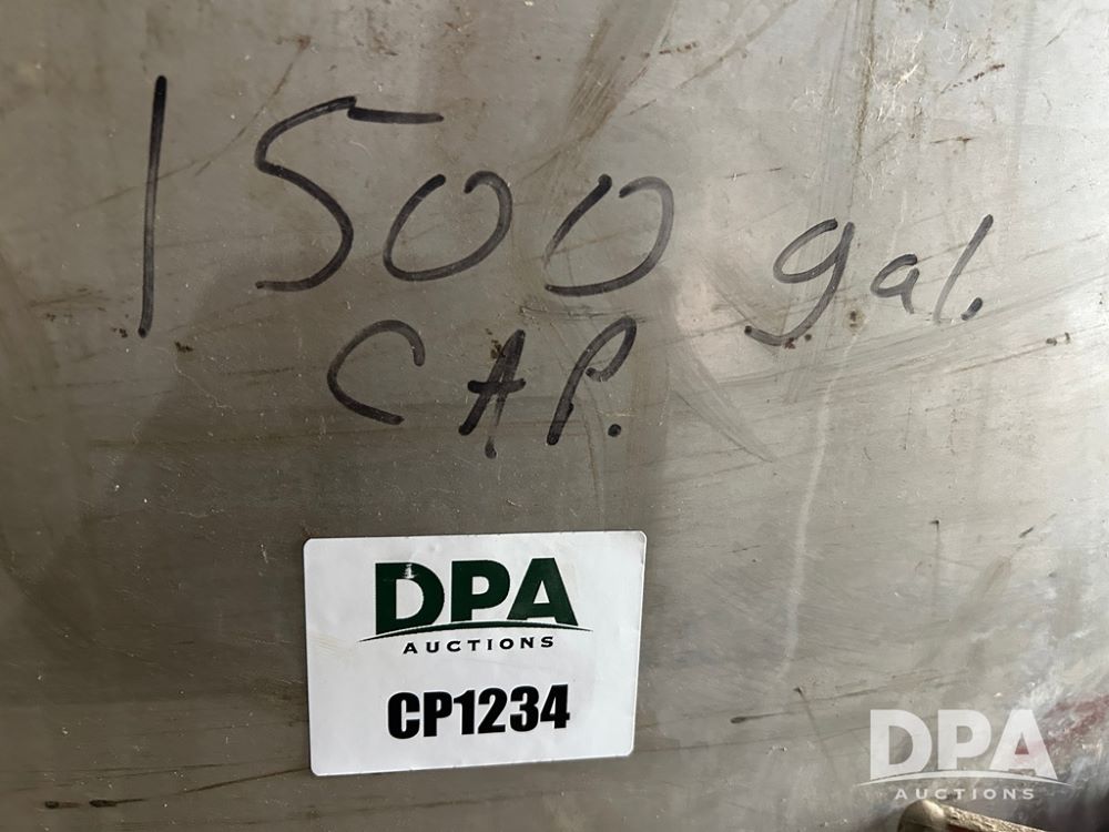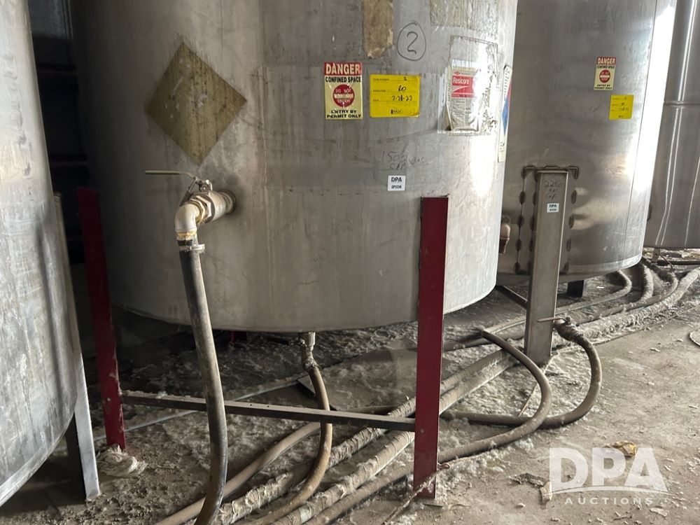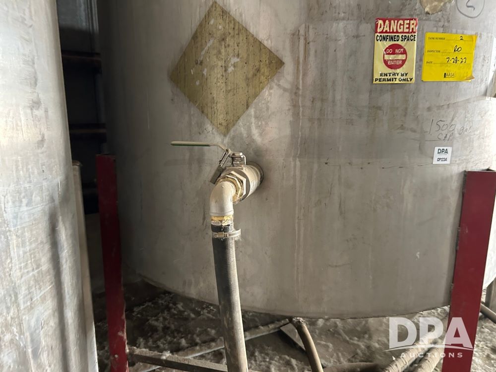 Stainless Steel Liquid Tank (CP1234, Unit 2), 1,500 gallon vertical stainless steel dish bottom liquid tank, stands, valve.