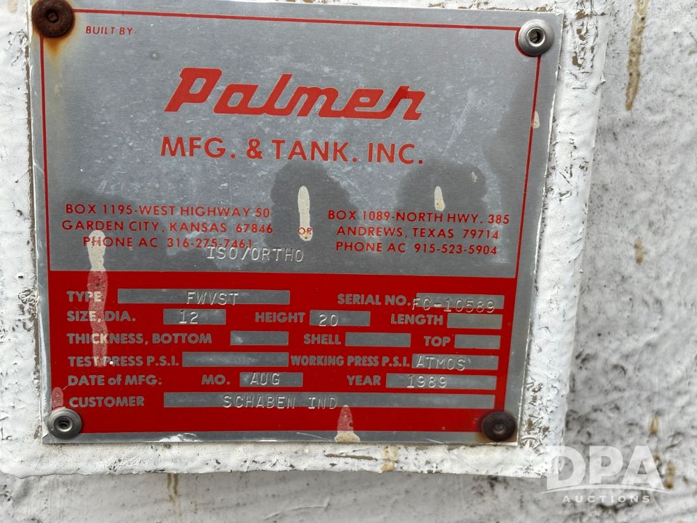 1989 Palmer Fiberglass Liquid Storage Tank (GP11940, Tank 7), 1989 Palmer Mfg. & Tank Model FWVST fiberglass vertical liquid storage tank, 12' diameter, 20' height, approx. 16,800 gallon capacity, flat bottom, manhole cover.