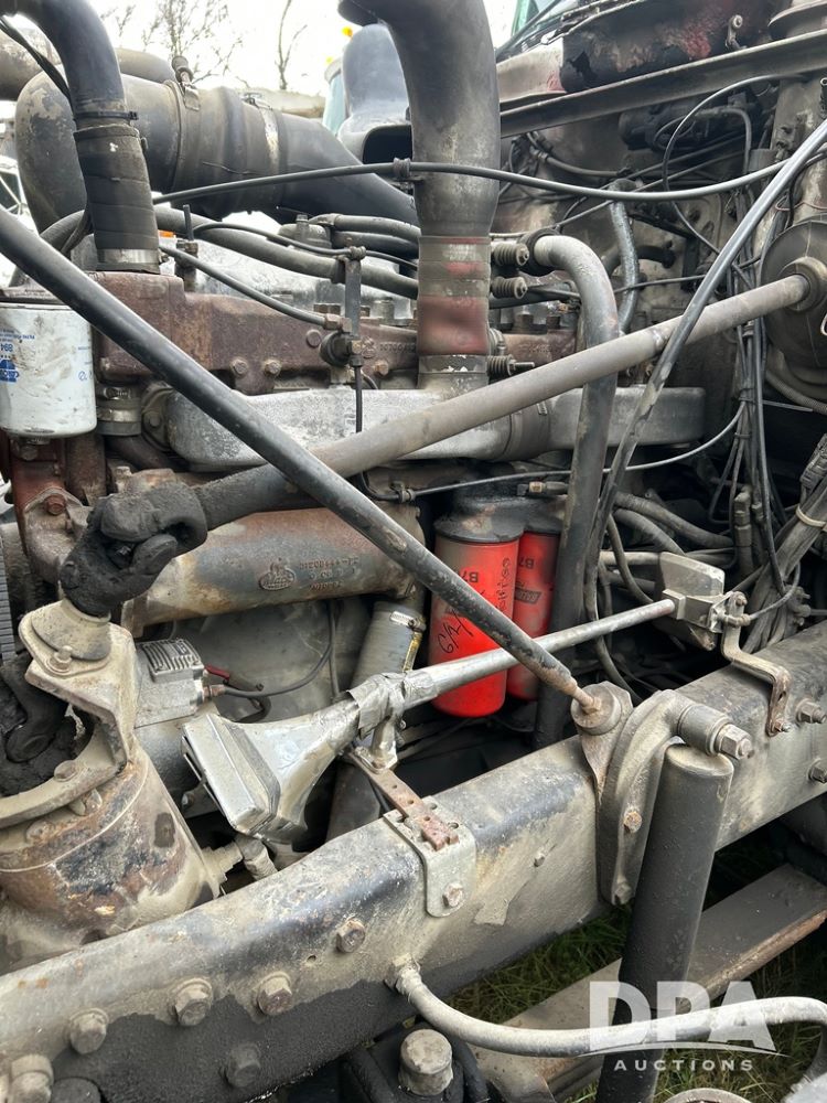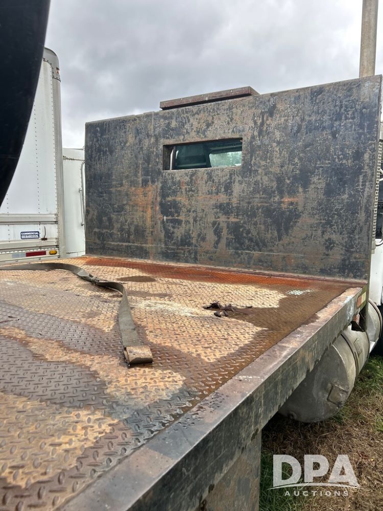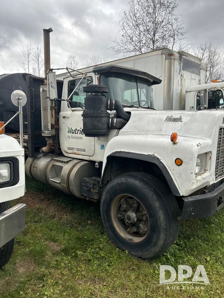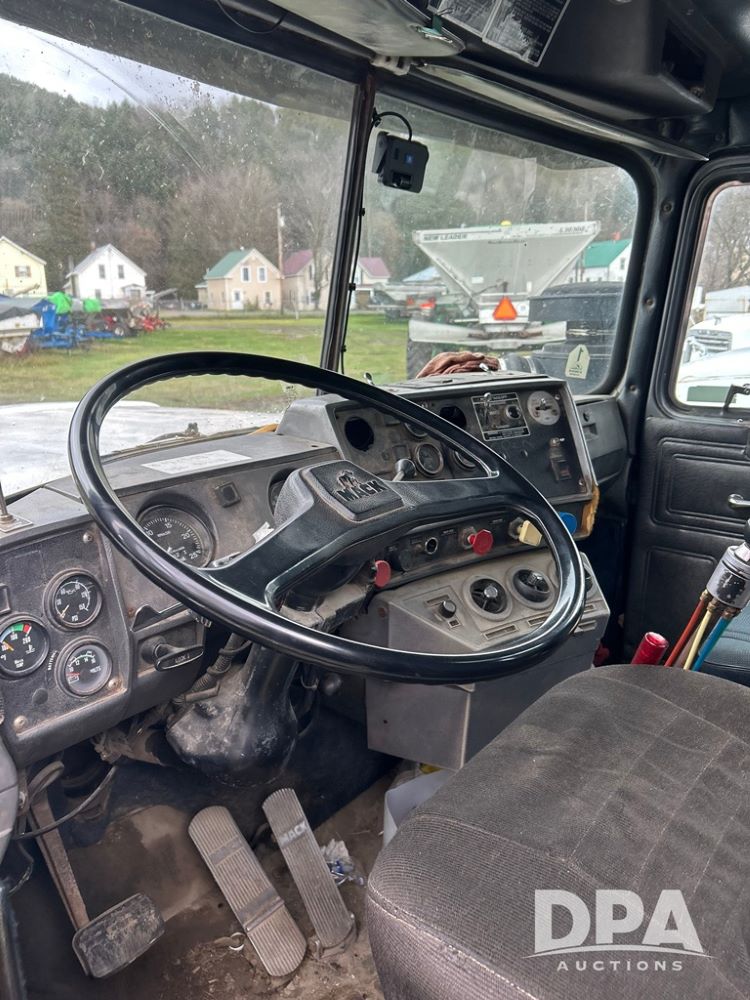 1988 Mack 686 Flatbed Truck (PZ14143, Unit 126308), Mack diesel engine, transmission, heat, radio, tandem axle, full screw, spring suspension, Steel flatbed, headache rack, side winches, rear pintal hitch, 385/65R22.5 front tires.