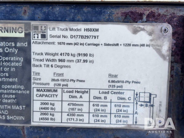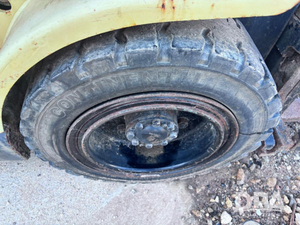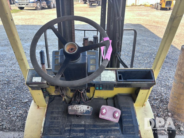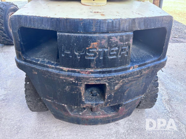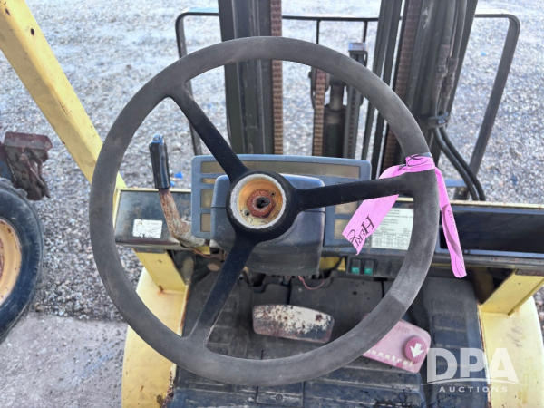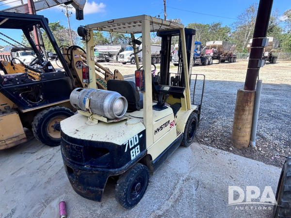 Hyster H50XM Forklift (GP11805, Unit 700-88), Hyster Model H50XM forklift, LP gas, forks, tilt, side shift, 4,400 pound lift capacity, 225/75-15 front tires, 6.00-9/4.00 rear tires, approx. 11,029 hours.