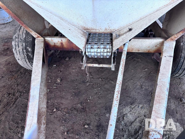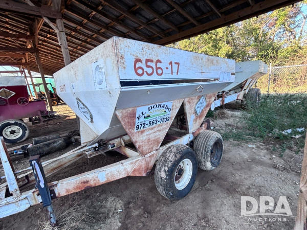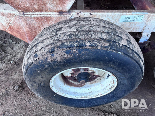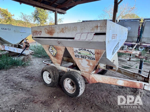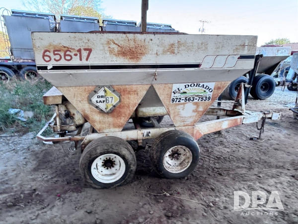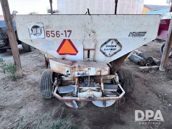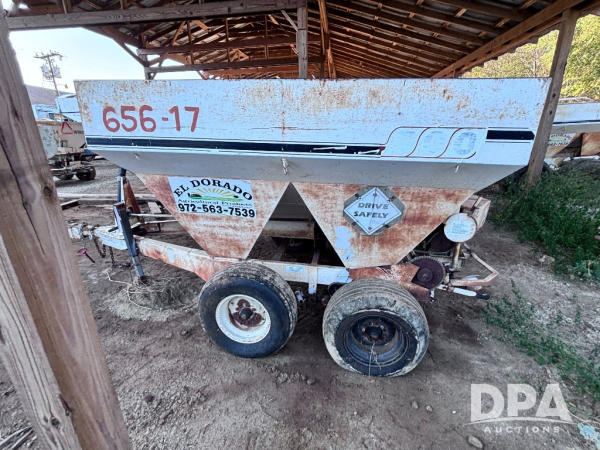 Willmar Dry Spreader (GP11781, Unit 656-17), Willmar pull type dry spreader, dual spinners, 540 PTO, tandem axle, flotation tires.