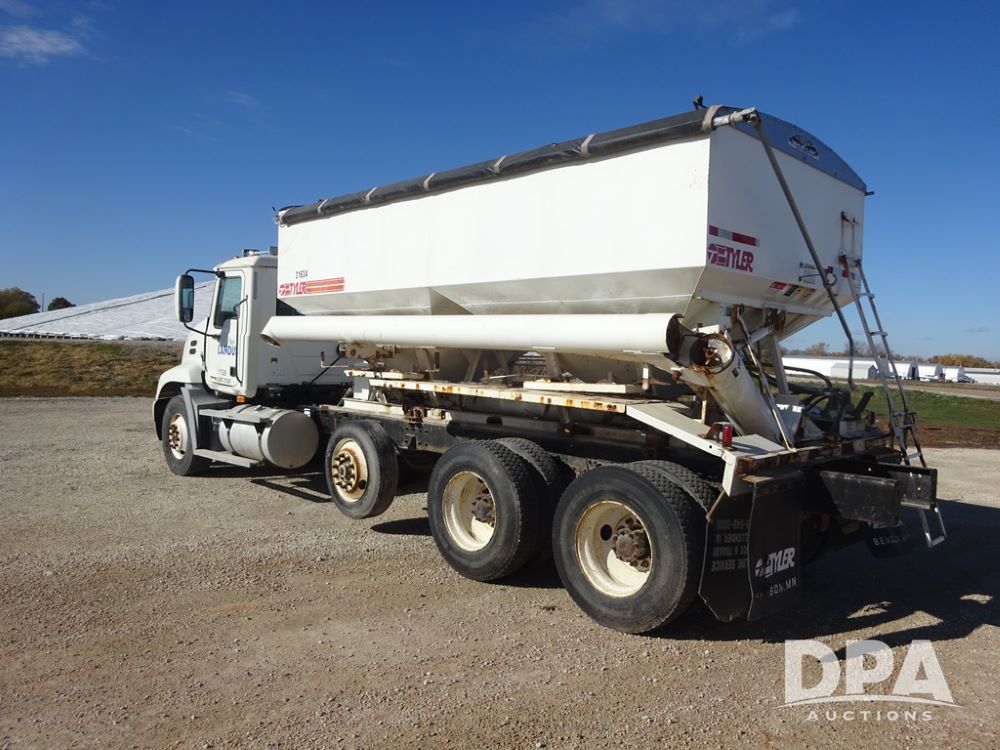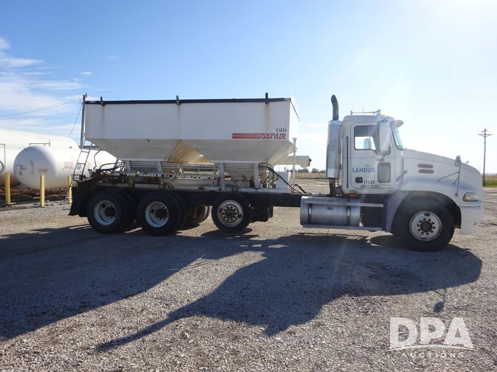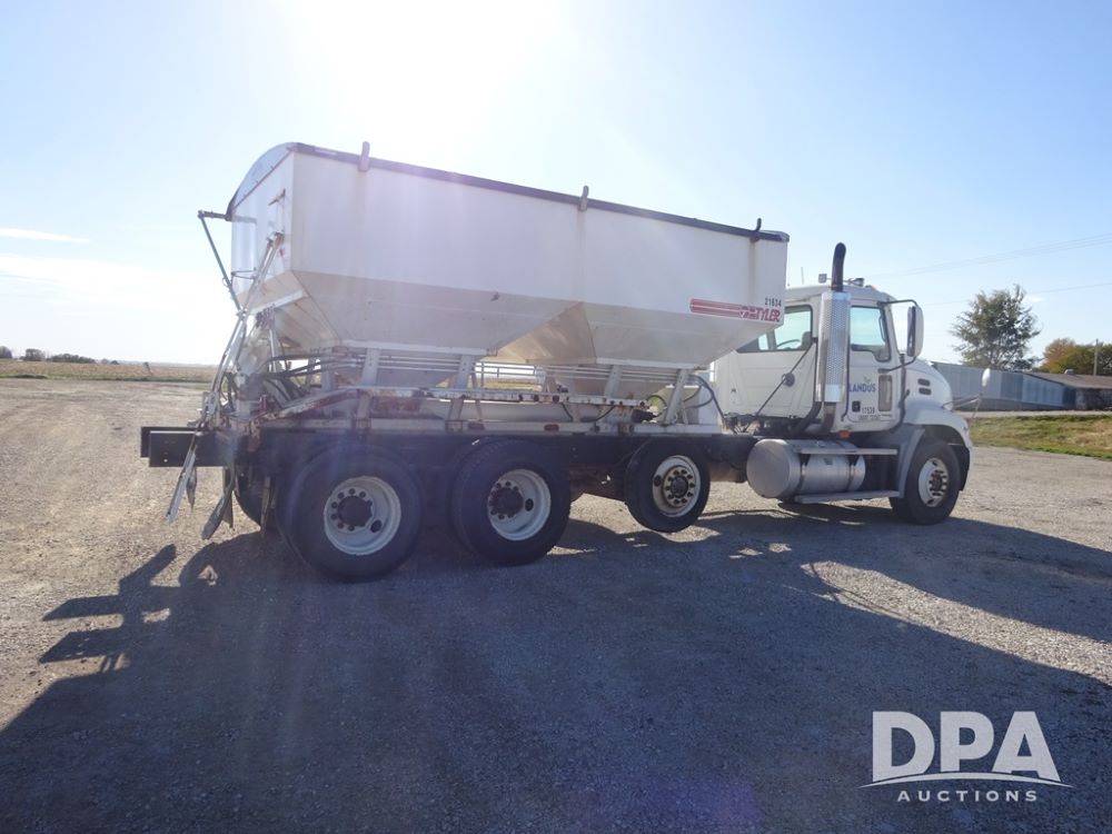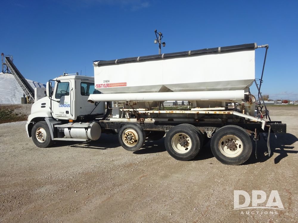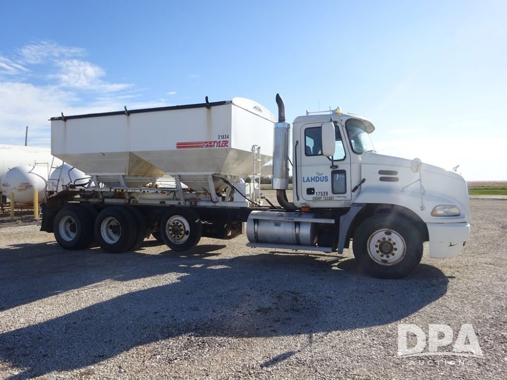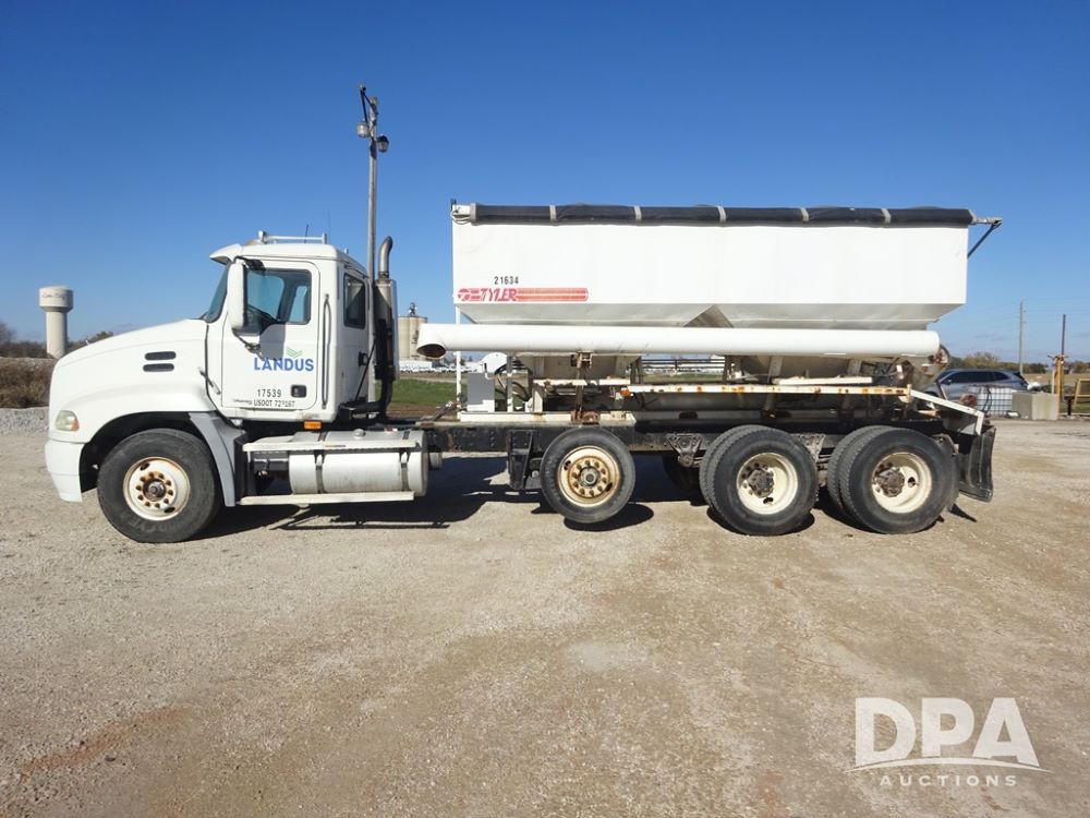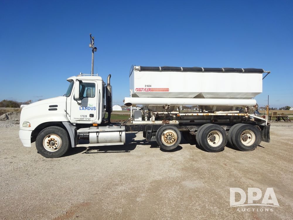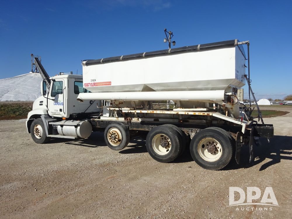 2004 Mack Vision Dry Tender Truck (PZ14165, Unit 17539), Mack diesel engine, Eaton Fuller 10 speed transmission, air conditioning, heat, Am/Fm radio, cruise control, tandem axle, full screw, air ride suspension, 3rd axle, Tyler 16 ton dry tender box (Unit 21634), side discharge auger, all hydraulic, roll over tarp, 315/80R22.5 front tires, 11R22.5 rear tires, 255/70R22.5 3rd axle tires, shows 461,262 miles.