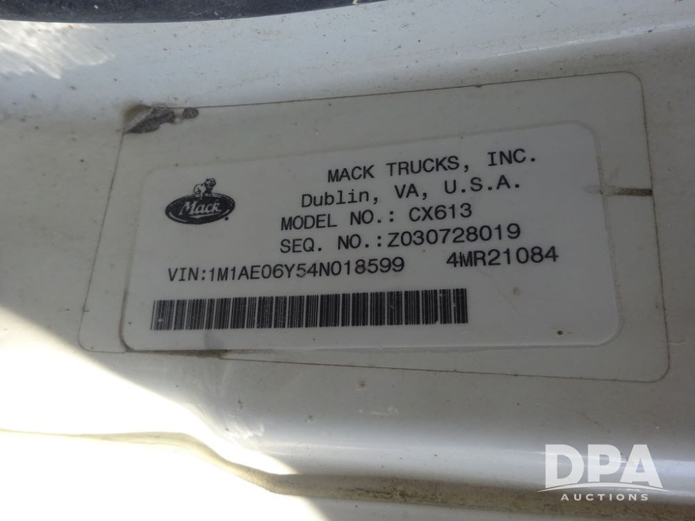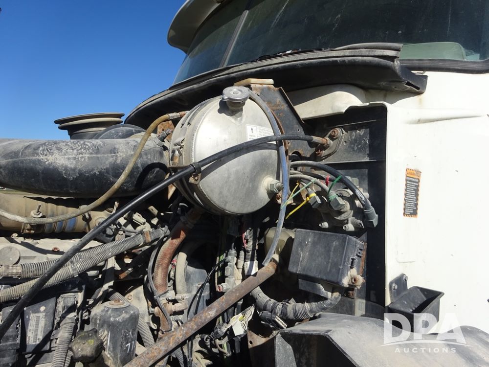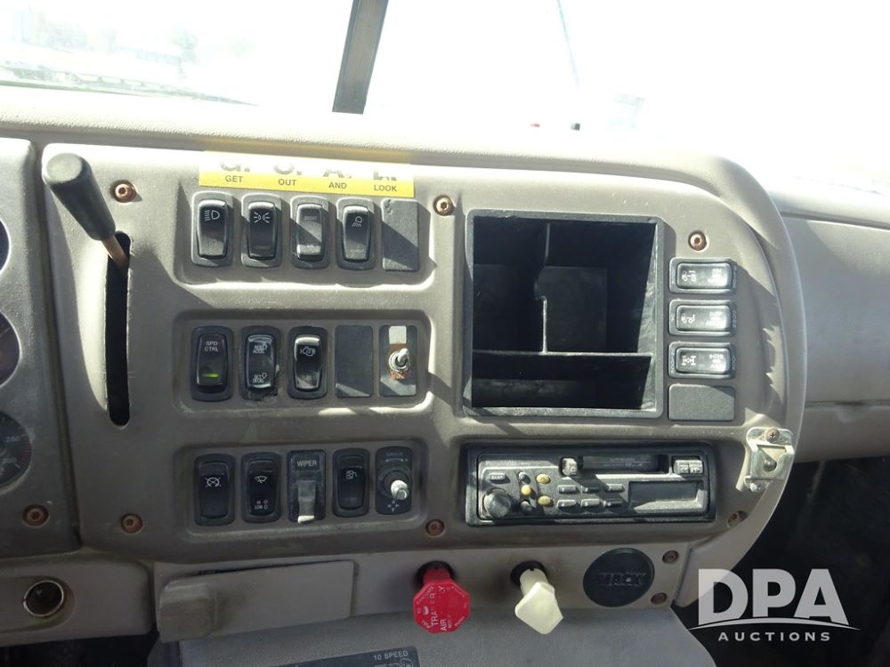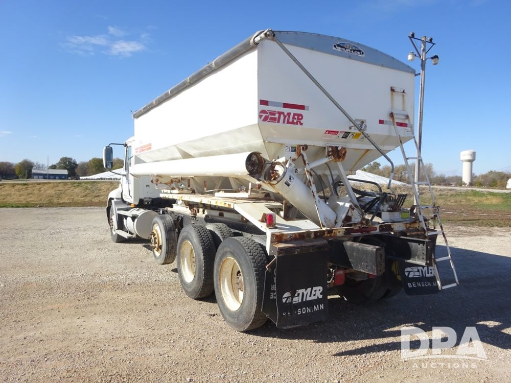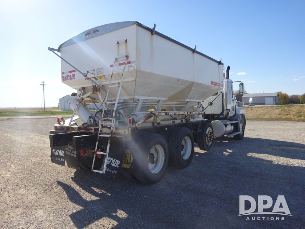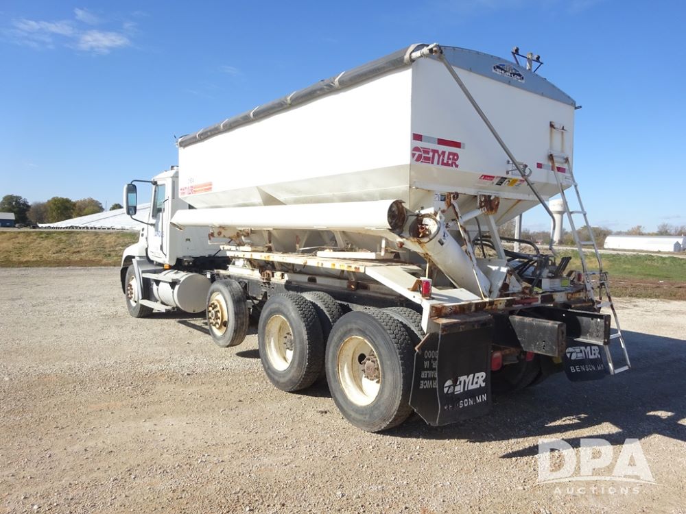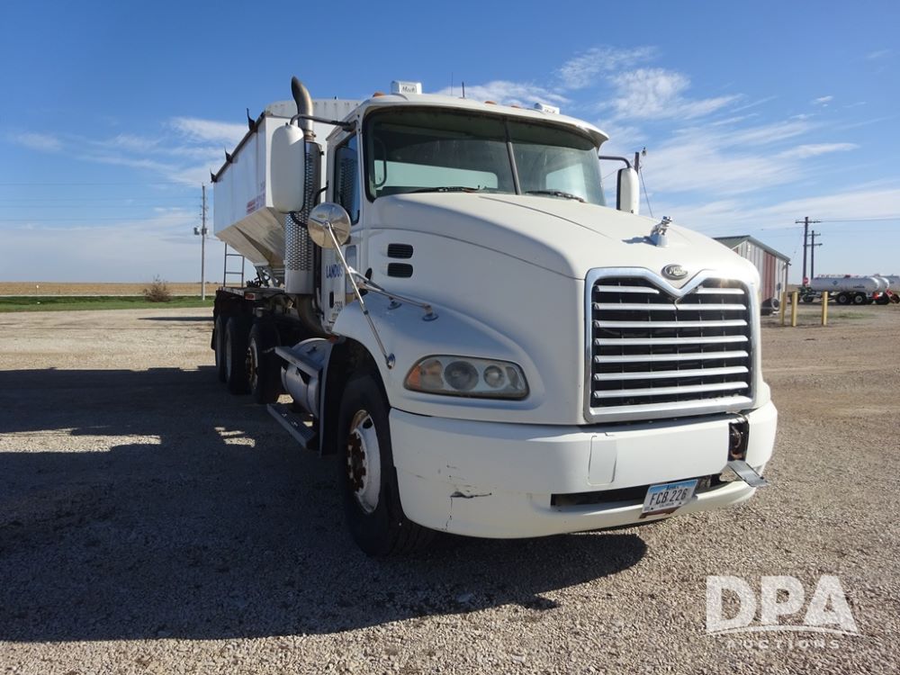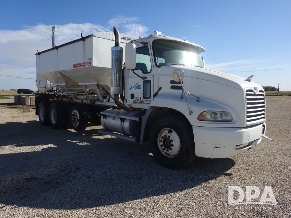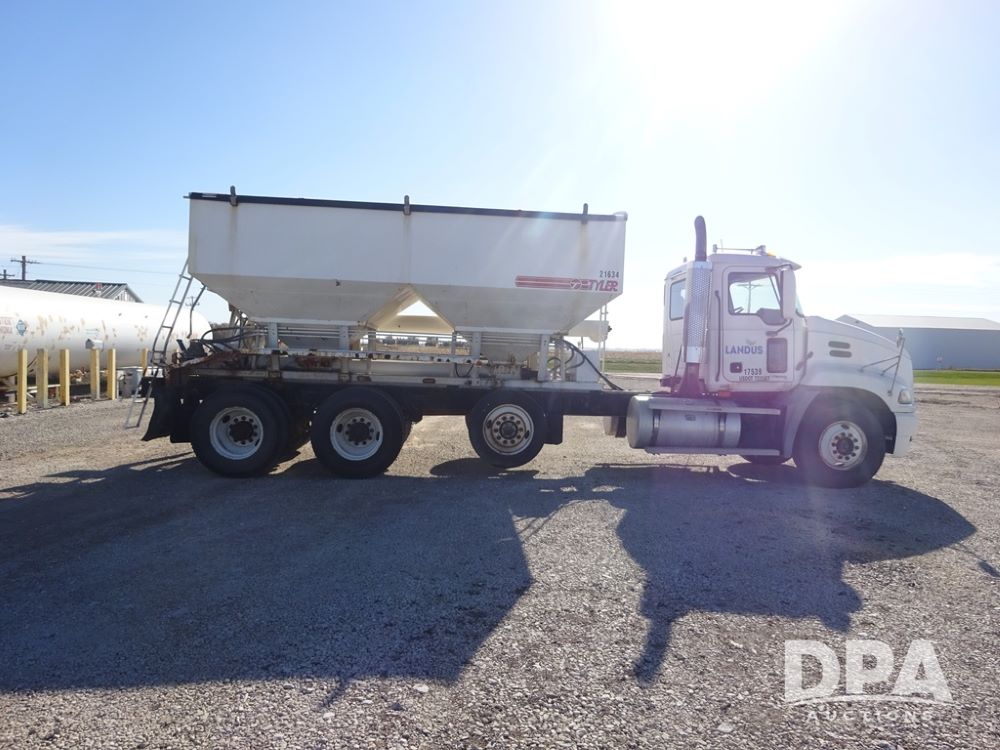 2004 Mack Vision Dry Tender Truck (PZ14165, Unit 17539), Mack diesel engine, Eaton Fuller 10 speed transmission, air conditioning, heat, Am/Fm radio, cruise control, tandem axle, full screw, air ride suspension, 3rd axle, Tyler 16 ton dry tender box (Unit 21634), side discharge auger, all hydraulic, roll over tarp, 315/80R22.5 front tires, 11R22.5 rear tires, 255/70R22.5 3rd axle tires, shows 461,262 miles.