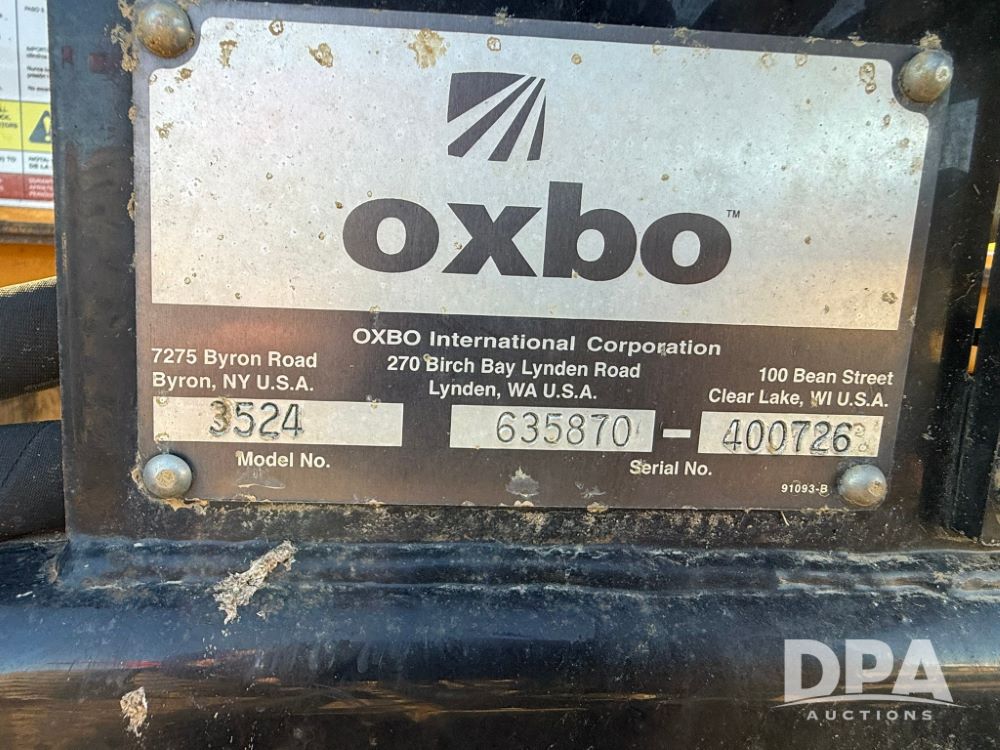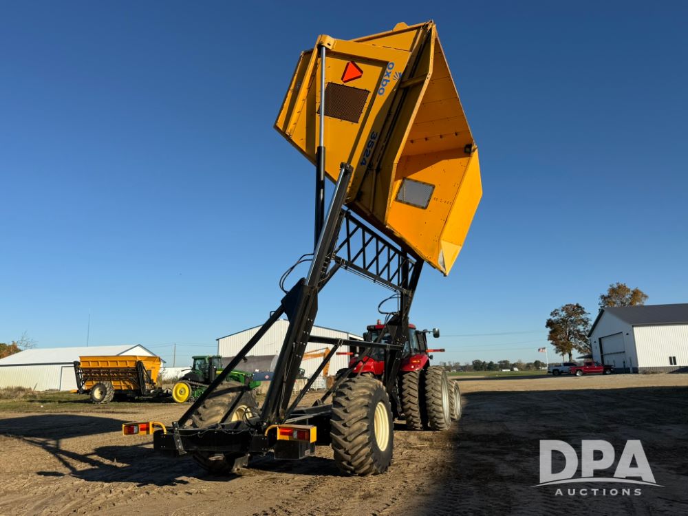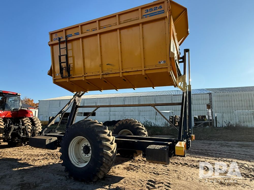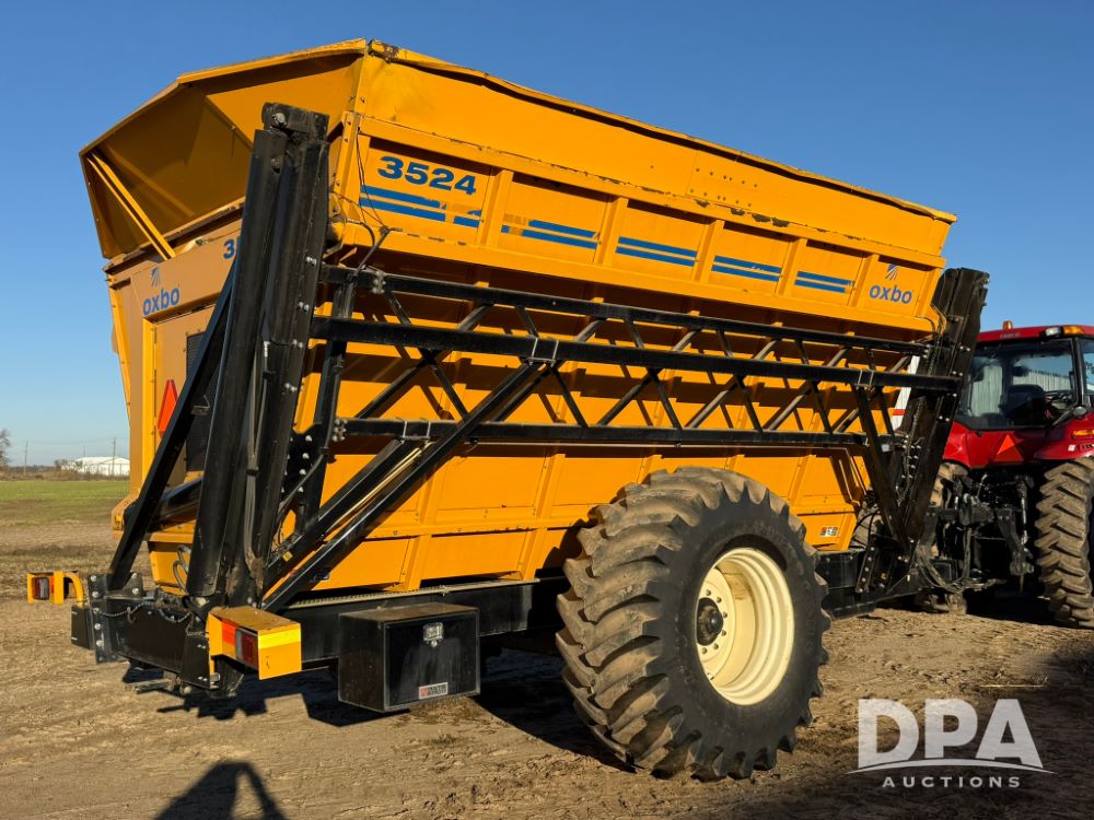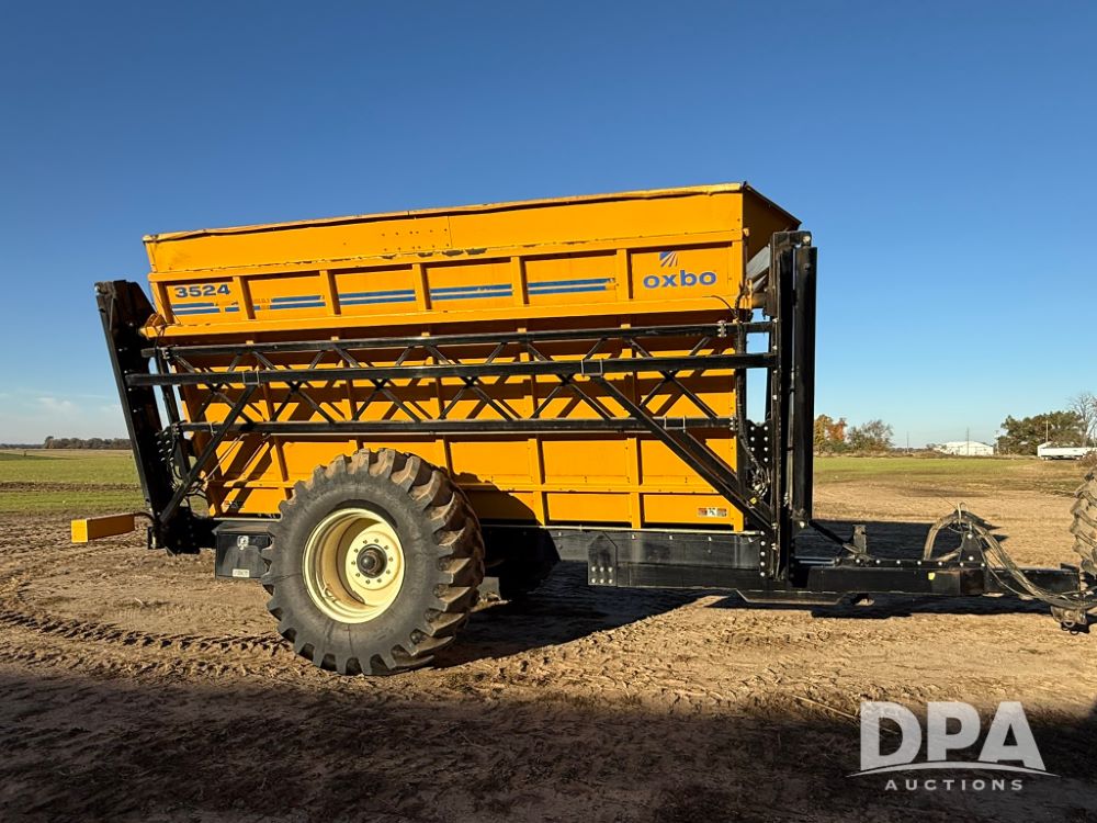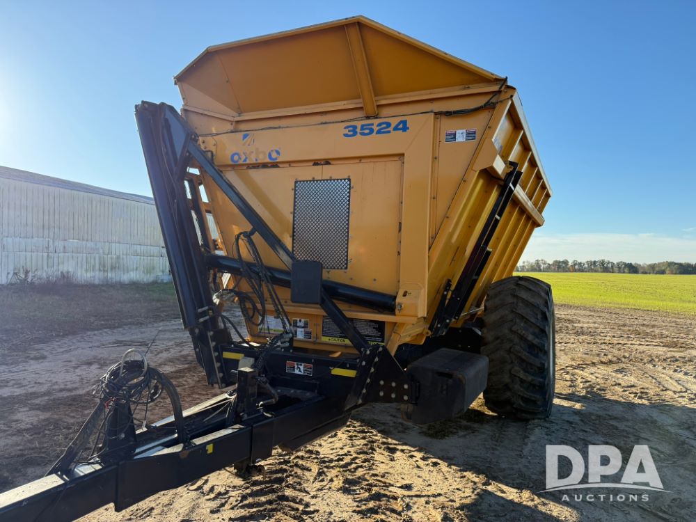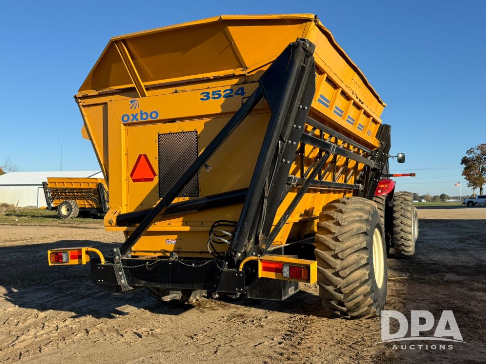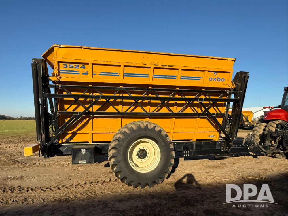 2012 Oxbo 3524 Dump Cart (LT1552), (40) suitcase weights plus loaded tire on left hand side, Digi-Star scale system with axle and tongue load cells, cart comes with cab scale head, LED work lights inside cart, Voyager camera system - (1) camera inside cart, (1) camera on rear of cart, rear hitch and 7 pin implement plus on back side of cart.