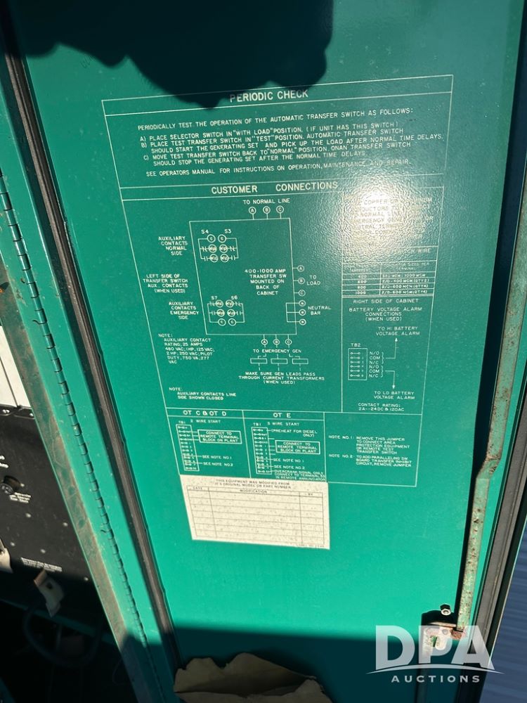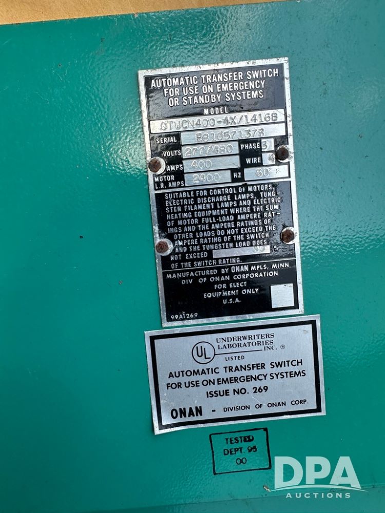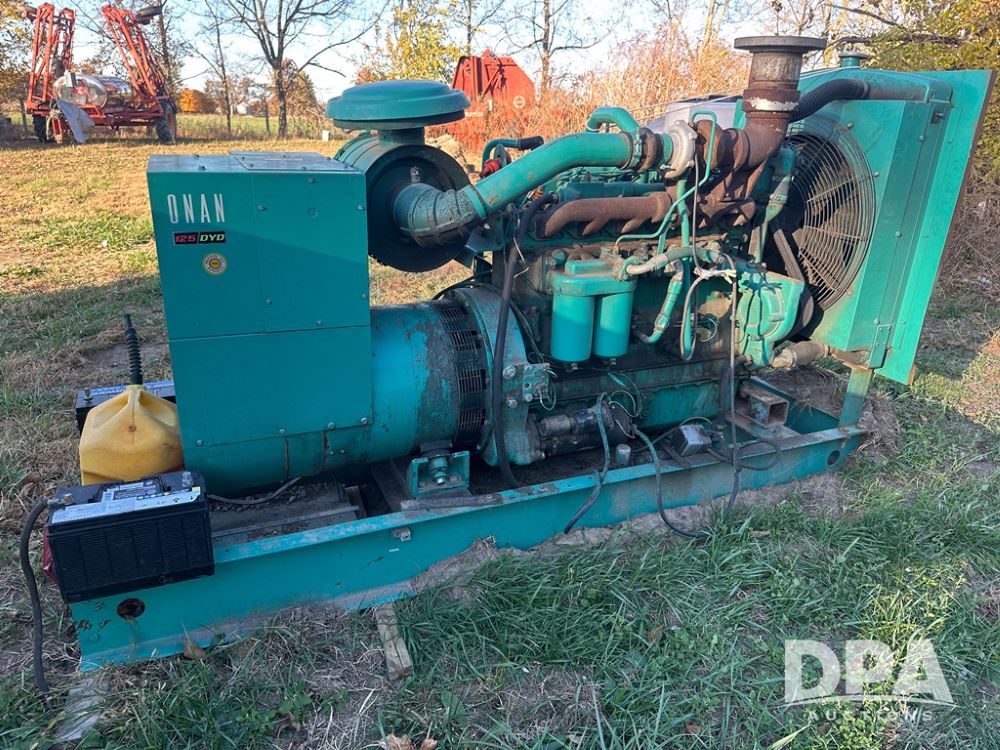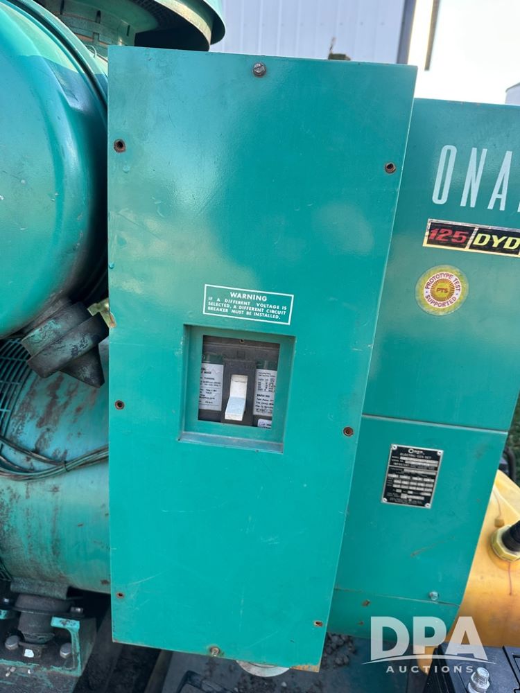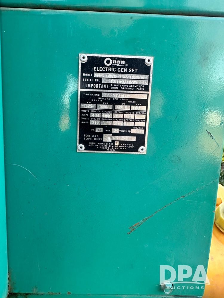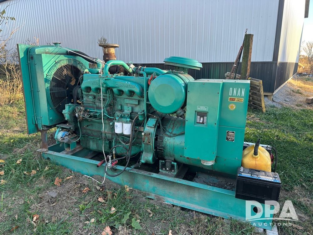 Onan Diesel Generator (LT1457), can be ran as a 125 KW 3 phase or 82.5 KW single phase, Allis Chalmers diesel engine with recent overhaul, transfer switch box, 797 hours on the transfer switch, 1,643 hours on generator.