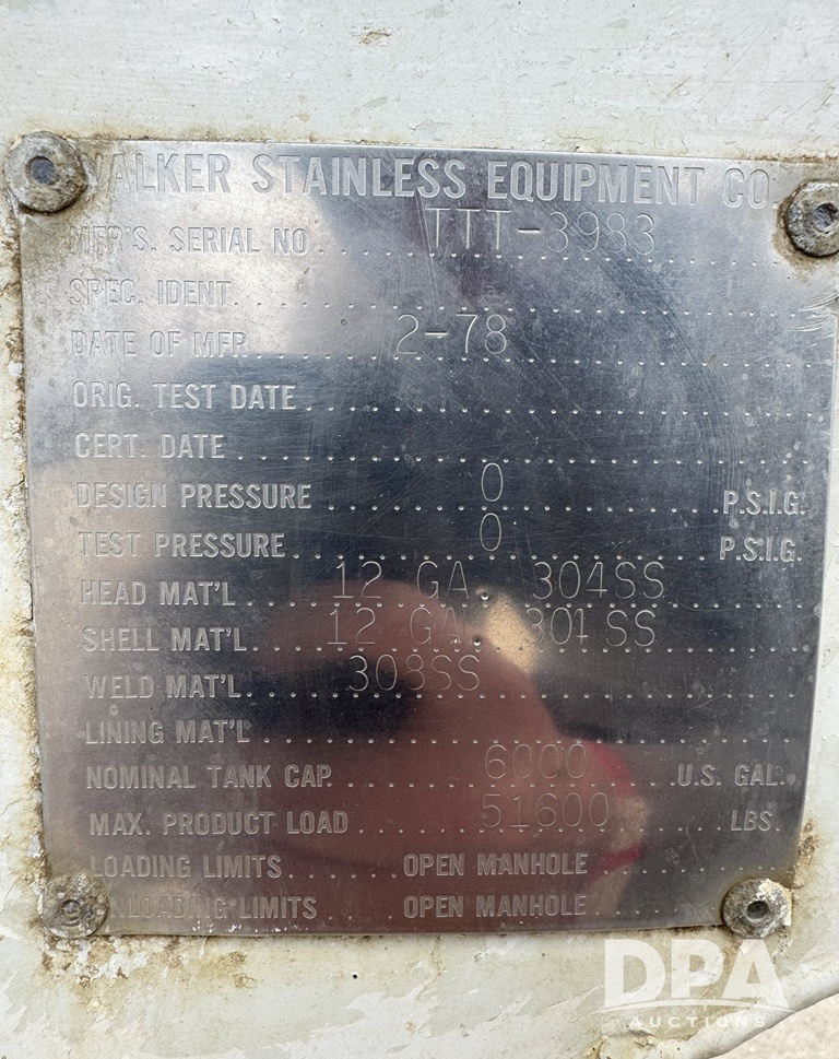 1978 Walker Stainless Steel Tanker (ED5295), all stainless steel tanker with welded-in baffles in the tank, 6,000 gallons, 4in main coming out the back, which is reduced down to 3in plumbing., everything currently attached to the tanker's plumbing will remain with the unit, aluminum outer rims, tandem axle, 295/75R22.5 tires.