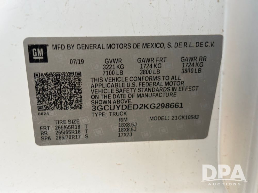 2019 Chevrolet Silverado LT Z71 Texas Edition 4x4 Pickup (GP12064, Unit 680), 4 door, 5.3L gas engine, automatic transmission, heat, air conditioning, Am/Fm radio, power windows, locks and mirrors, leather interior, cruise control, dual climate control, grill guard, tow package, bed liner, shows LT265/65R18 tires, approx. 151,110 miles.