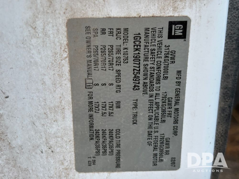 2007 Chevrolet Silverado Z71 4x4 Pickup (GP12072, Unit 1164), extended cab, Vortec gas engine, automatic transmission, heat, air conditioning, Am/Fm radio, dual climate control, power windows, locks and mirrors, cloth interior, rear tool box, tow package, cruise control, 265/70R17 tires, approx. 158,891 miles.