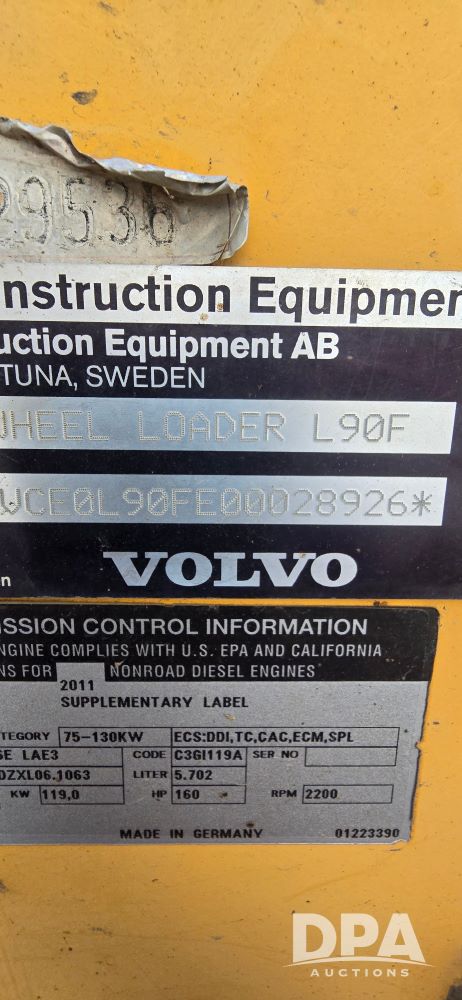 Volvo L90F Wheel Loader (PD5345), Volvo D6E turbocharged diesel engine, 175 hp, Volvo THE 125B transmission with four forward and four reverse gears, full hydraulic system, 11,000 hours.