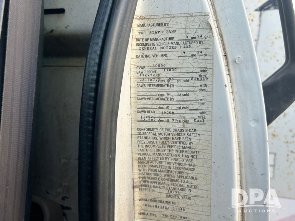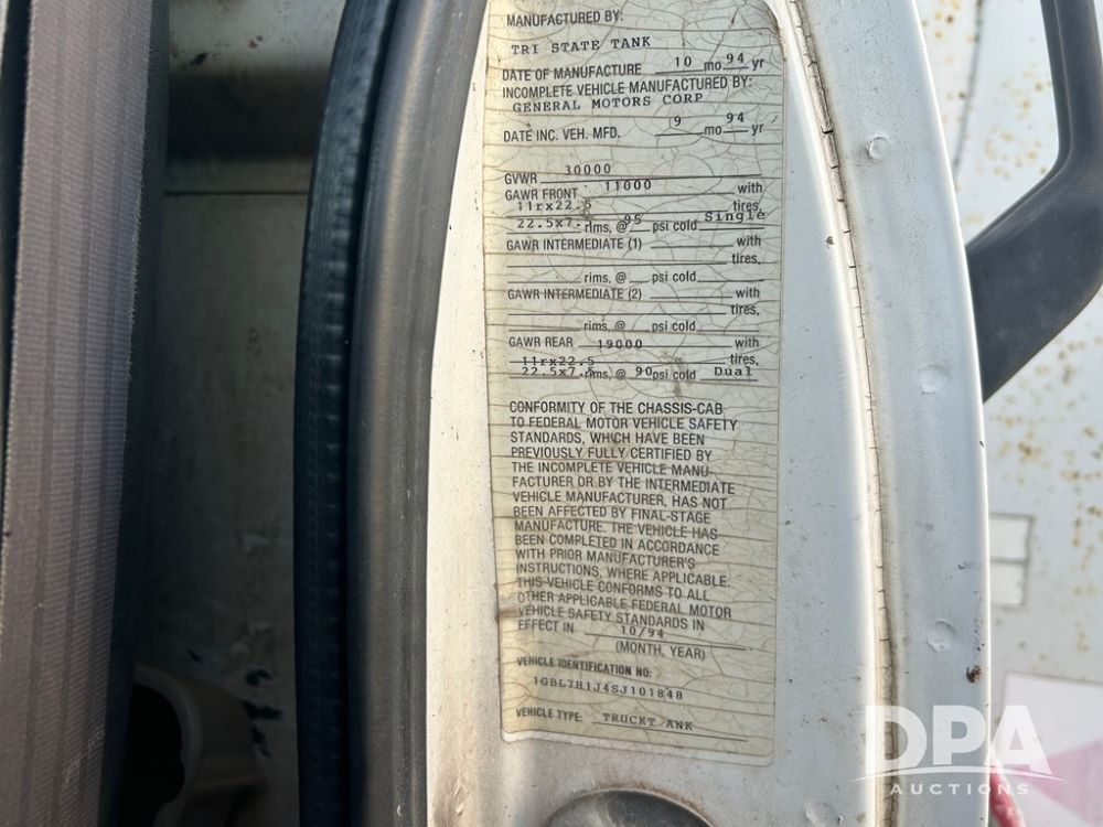 1995 Chevrolet Kodiak Fuel Truck (NP6268, Unit 389), Cat 3116 diesel engine, manual 6 speed transmission, heat, Am/Fm radio, single axle, 1994 Progress Model E80ST fuel body (S/N B-38847), 2,100 gallon capacity, 5 compartment (600-500-400-300-300), dual hose reels, dual Neptune meters, shows 235,903 miles.