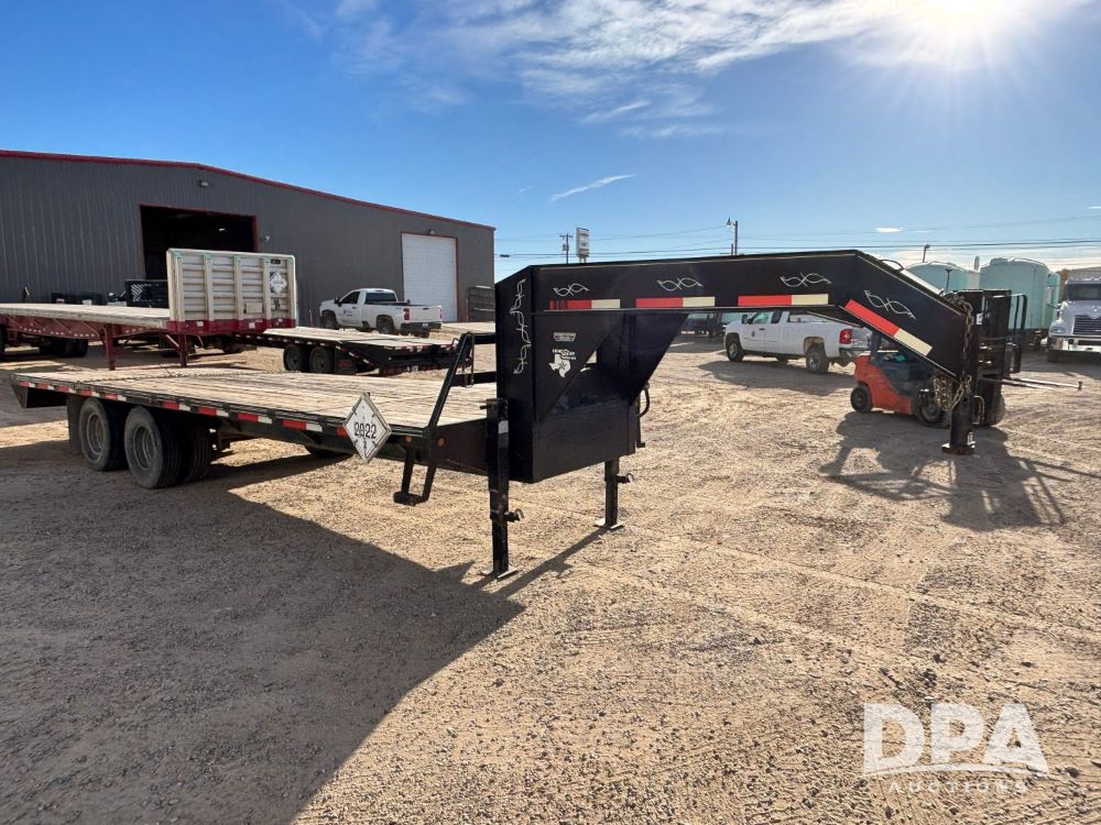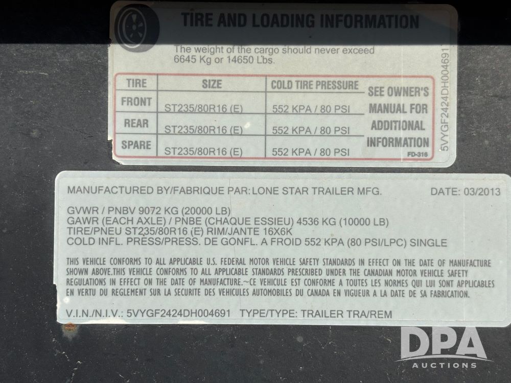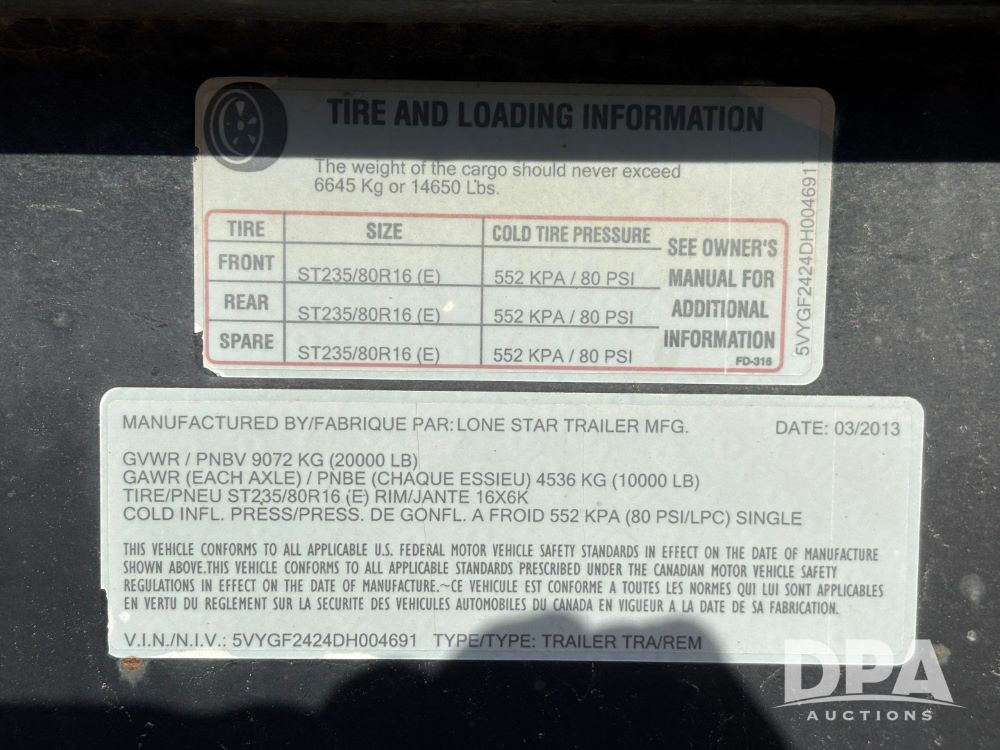 2013 Lone Star Gooseneck Trailer (GP12100, Unit 809), 2013 Lone Star gooseneck trailer, approx. 24' wood deck, tandem axle (missing rear axle tires on one side), spring suspension, landing gear, ST235/85R16 tires, GVWR 20,000 pounds.