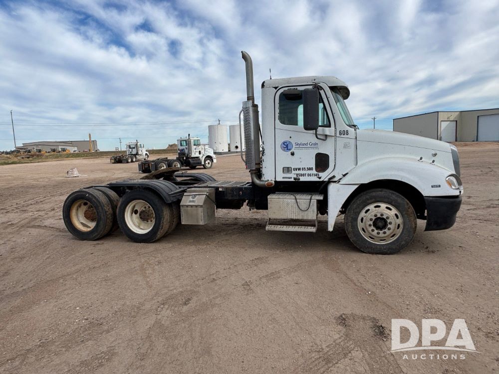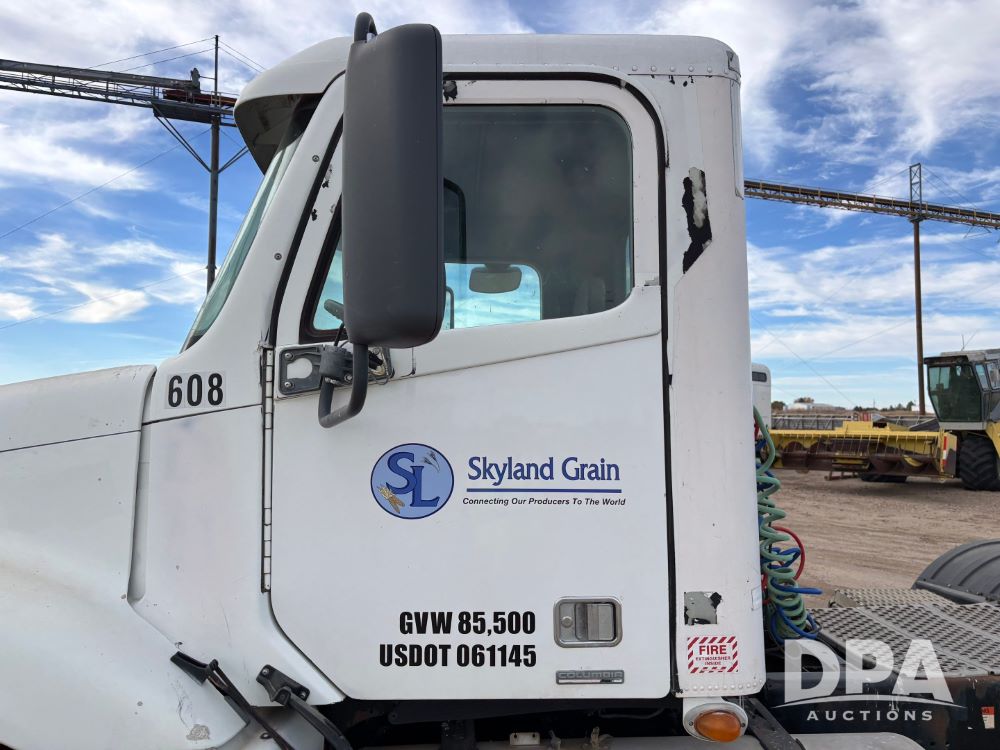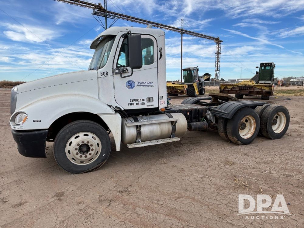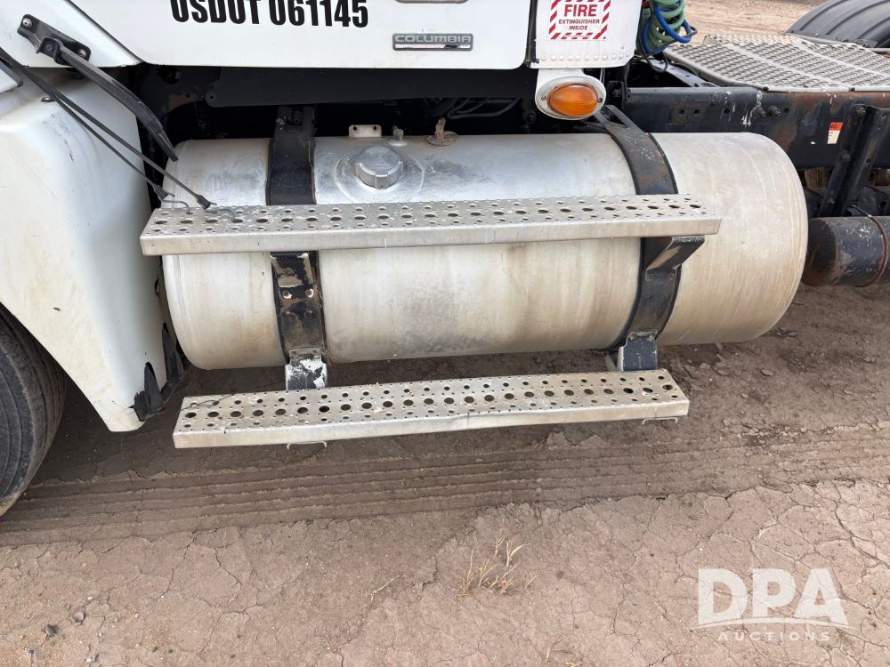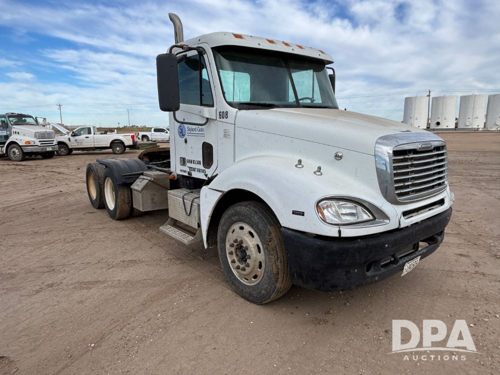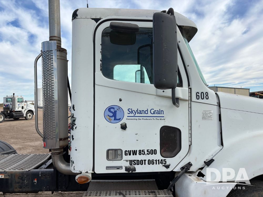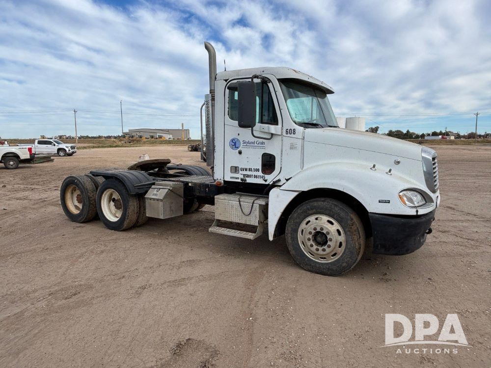 2007 Freightliner Columbia Day Cab Truck (GP12076, Unit 608), Mercedes-Benz diesel engine, Eaton Fuller 10 speed transmission, heat, Am/Fm radio, tandem axle, air ride suspension, 5th wheel plate, single fuel tank, single exhaust, 285/75R24.5 tires, GVWR 52,000 pounds, shows 462,052 miles.