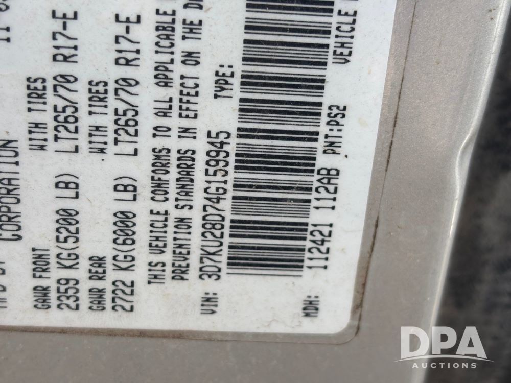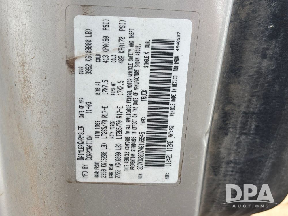 2004 RAM 2500 4x4 Pickup (GP12084, Unit 1050), 4 door, Hemi 5.7L V8 gas engine, transmission, heat, Am/Fm radio, cruise control, cloth interior, running boards, tow package, LT265/70R17, shows 247,395 miles.