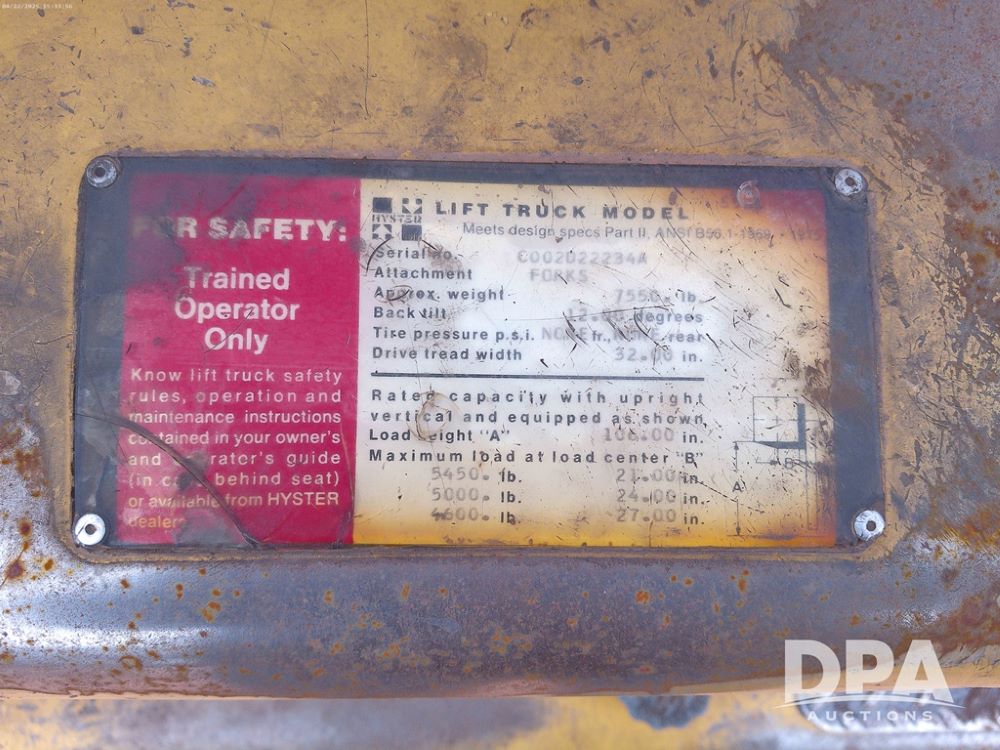 Hyster Spacesaver 50 Forklift (LLD1476), 5,000 pound capacity, 36 inch forks, shows 5,867 hours.