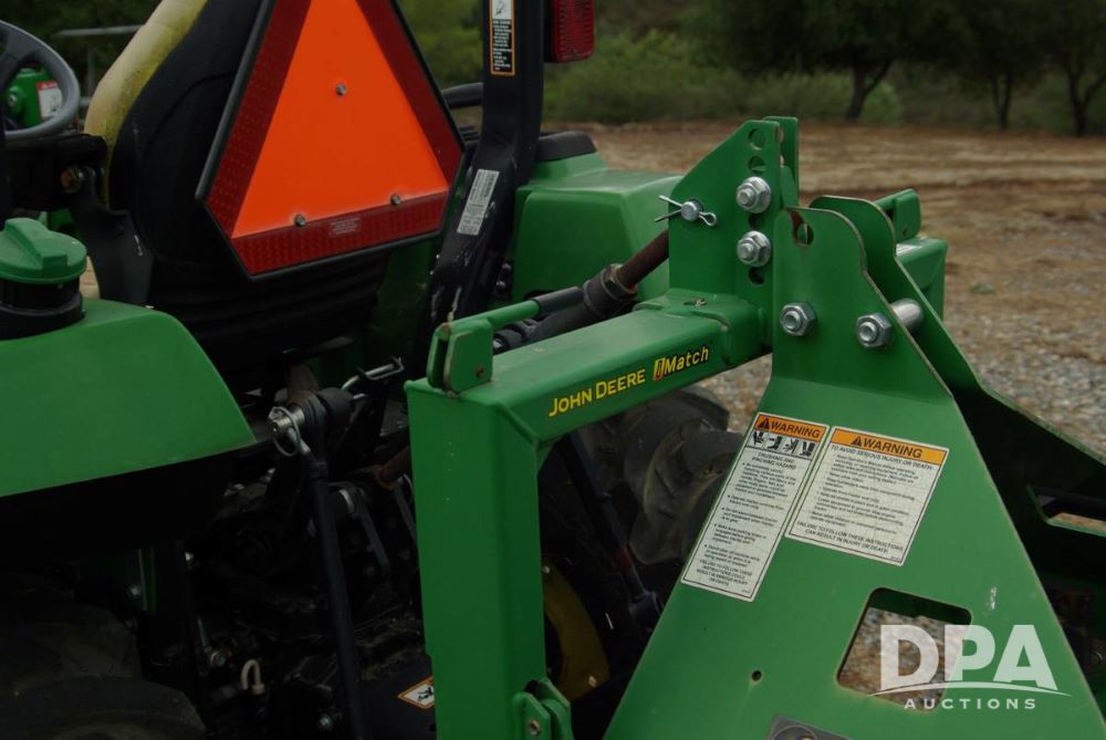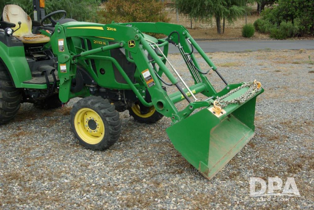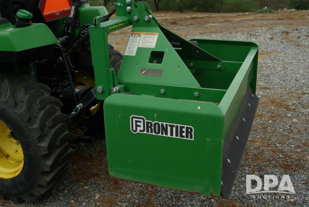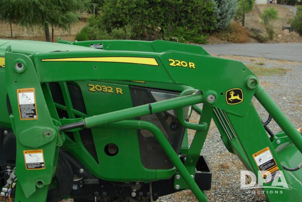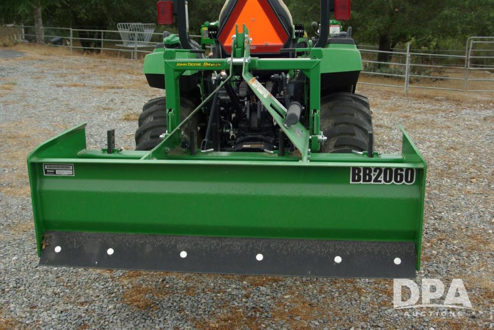 John Deere 2032R Tractor (NJP434), diesel engine, hydrostatic transmission, Imatch quick hitch, 220R loader and bucket, can lift up to 800 pounds, frontier BB2060 box blade, shows 64.5 hours.