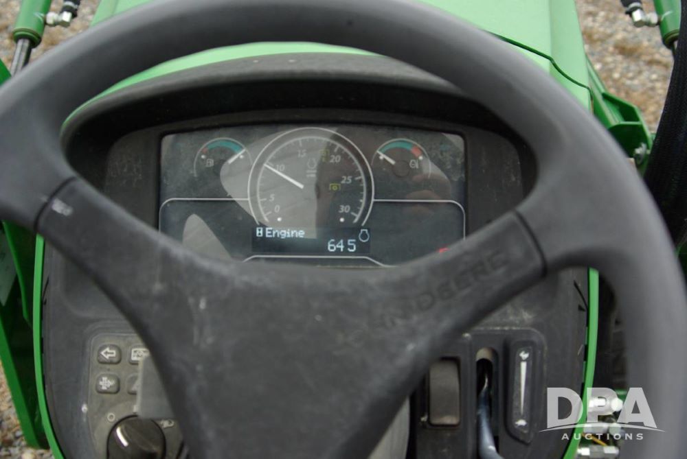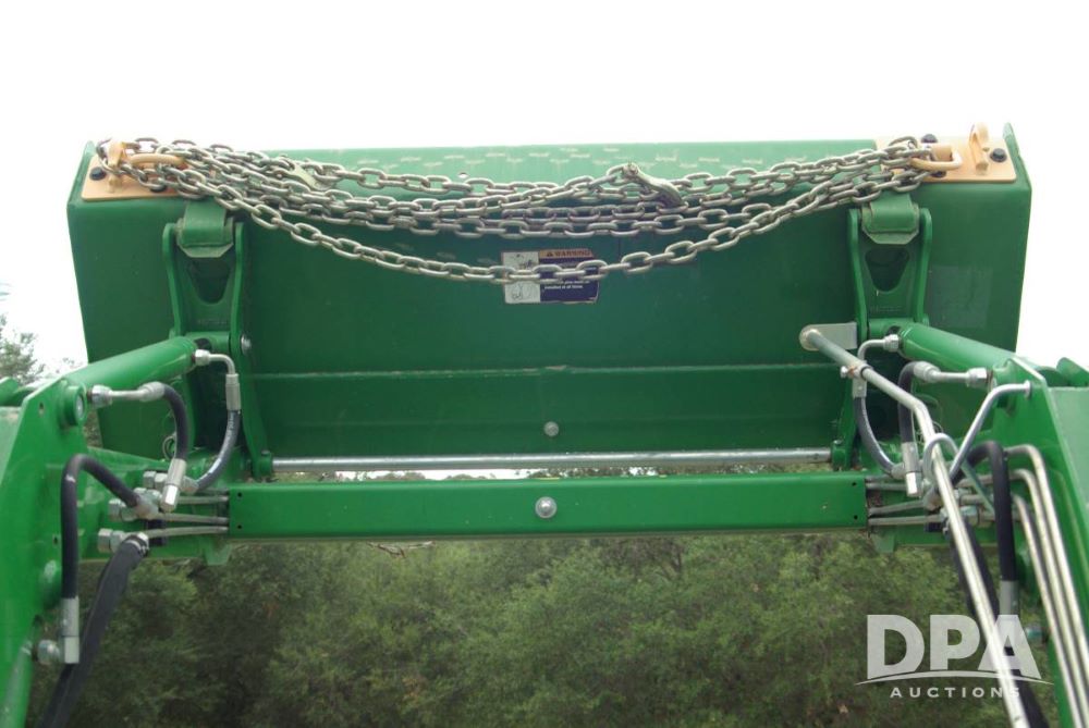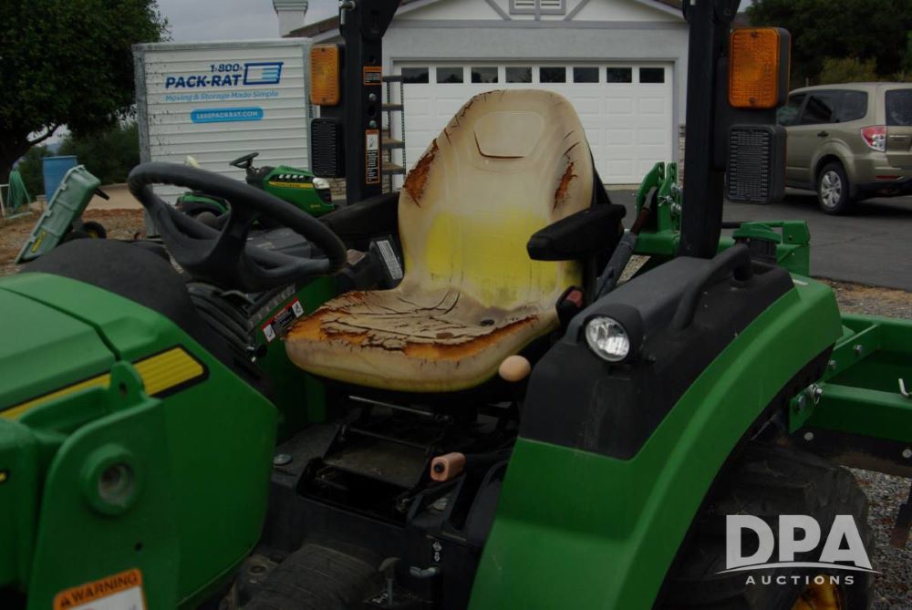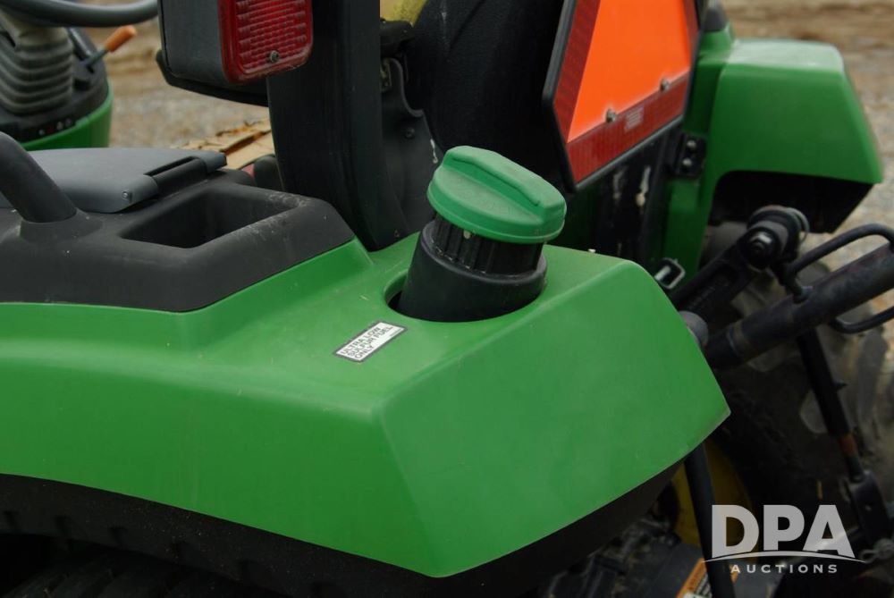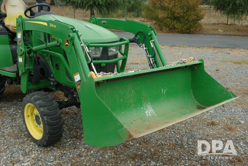 John Deere 2032R Tractor (NJP434), diesel engine, hydrostatic transmission, Imatch quick hitch, 220R loader and bucket, can lift up to 800 pounds, frontier BB2060 box blade, shows 64.5 hours.