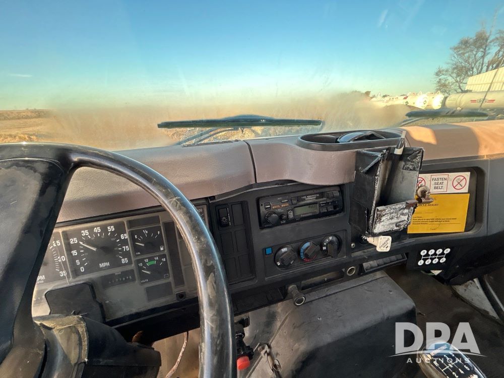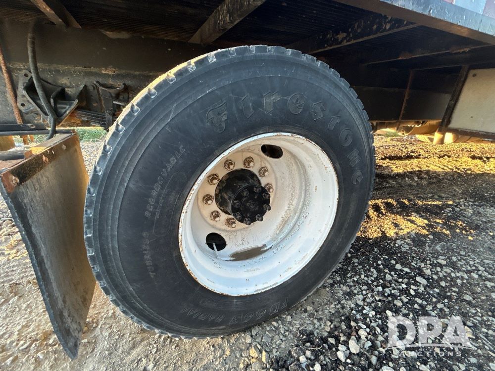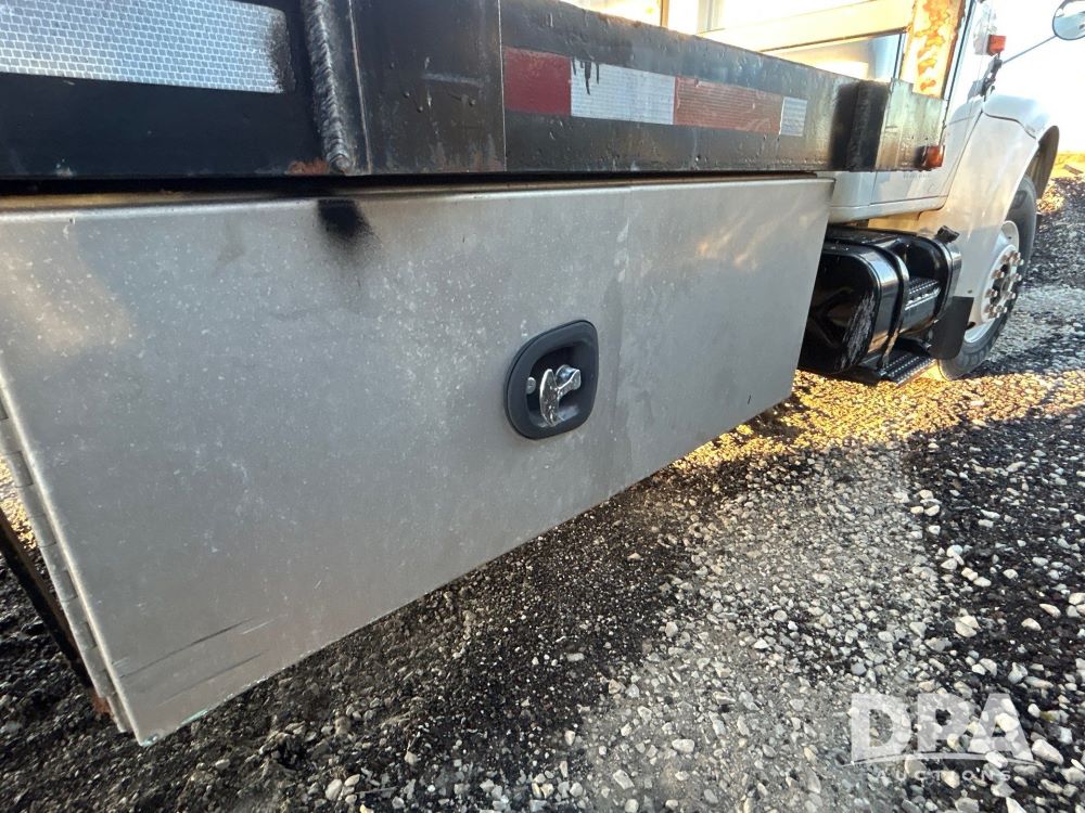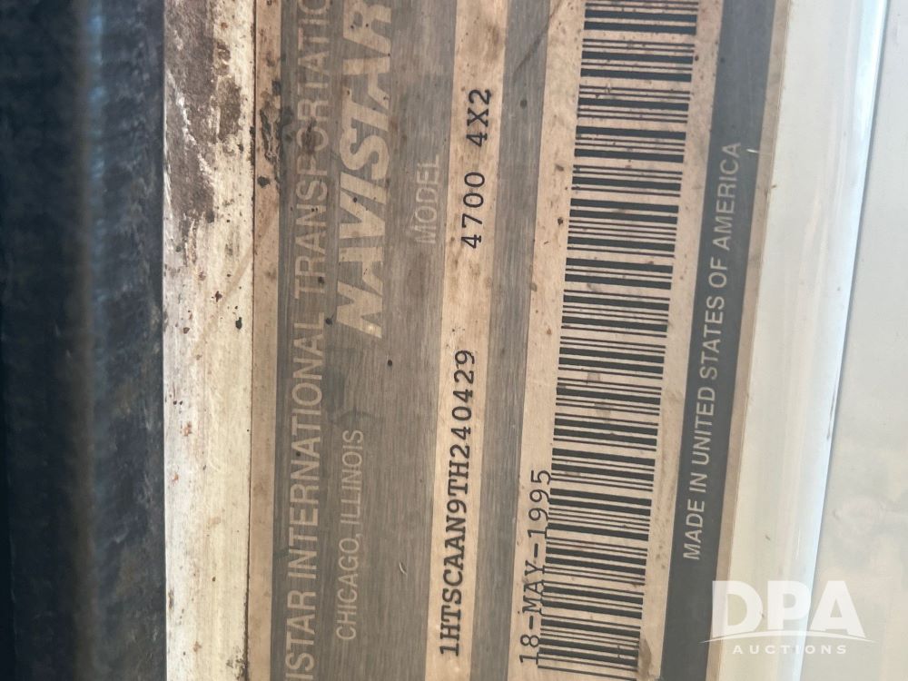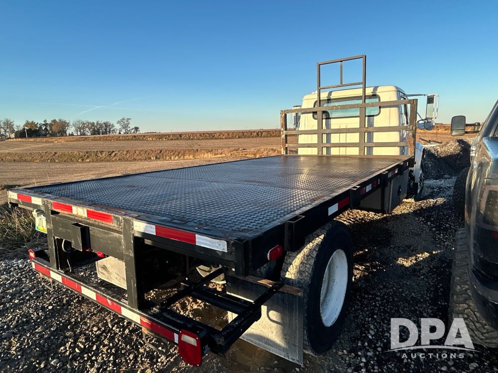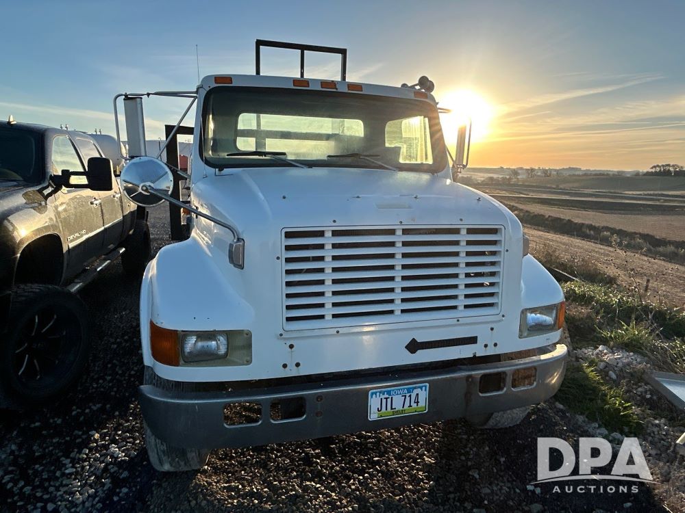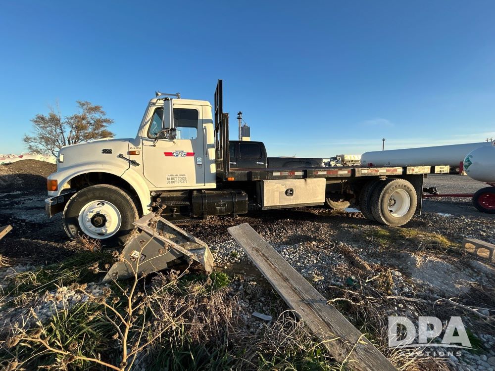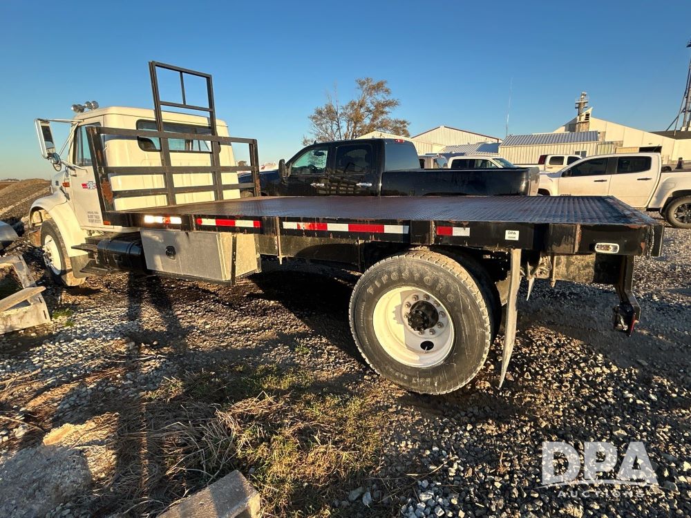 1996 International 4700 Flatbed (LS0506), DT466 diesel engine, 6-speed manual transmission, heat and air conditioning, manual windows, headache rack side compartment storage, 11r 22.5 front tires, 11r 22.5 rear dual tires, 417,727 miles.