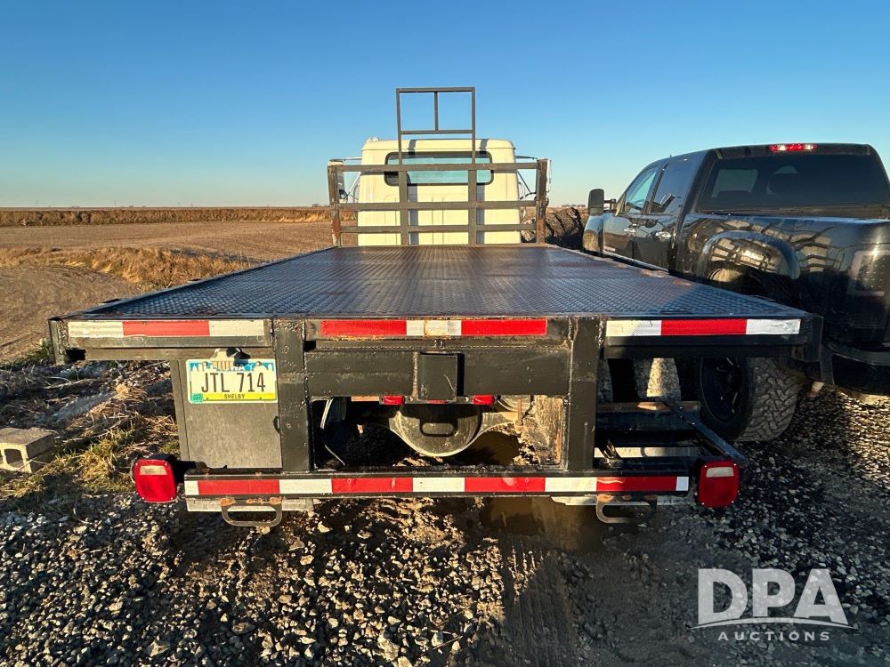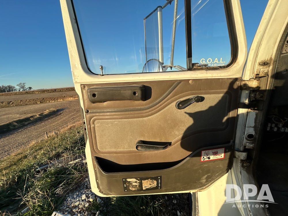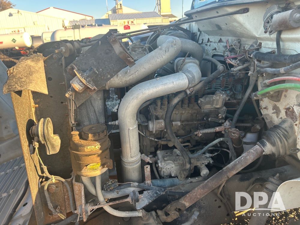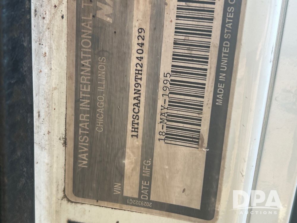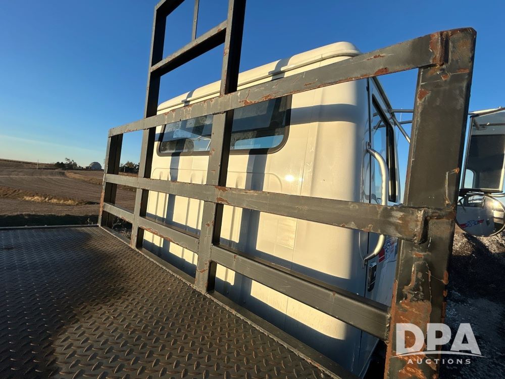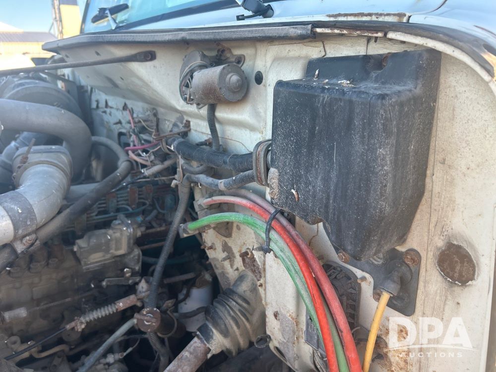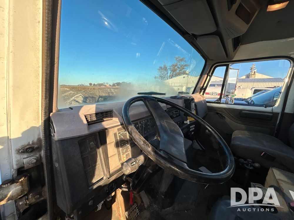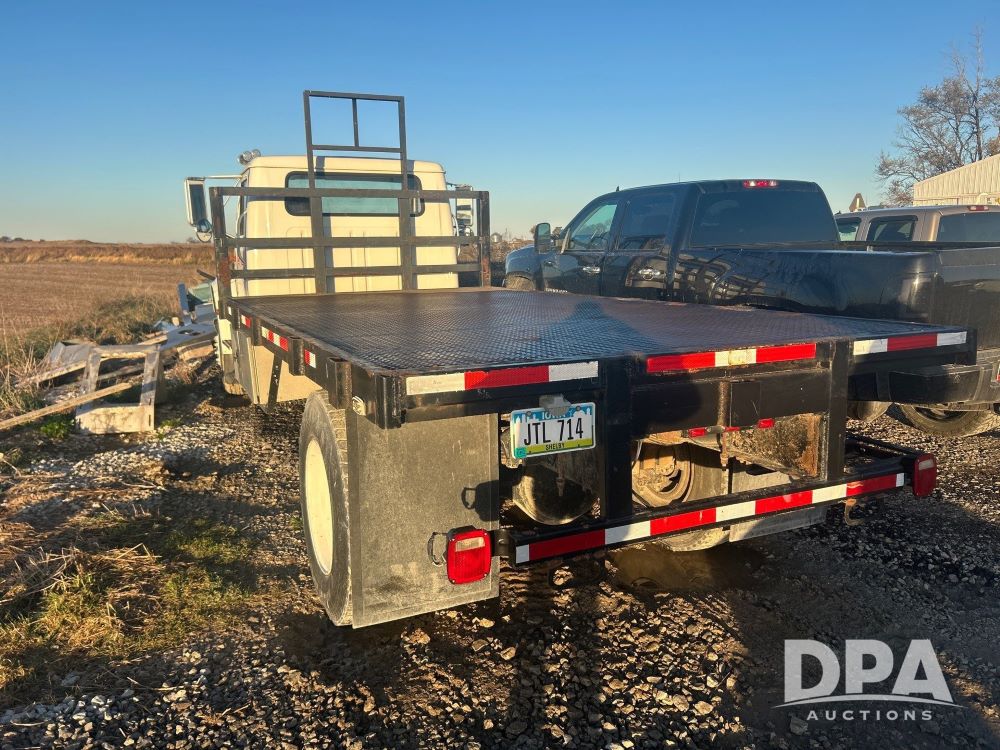1996 International 4700 Flatbed (LS0506), DT466 diesel engine, 6-speed manual transmission, heat and air conditioning, manual windows, headache rack side compartment storage, 11r 22.5 front tires, 11r 22.5 rear dual tires, 417,727 miles.