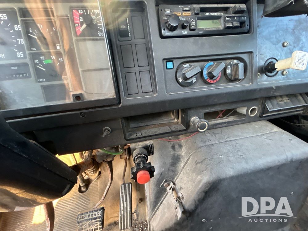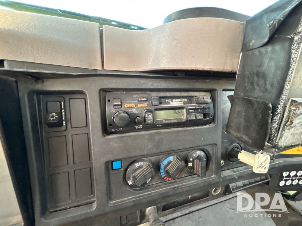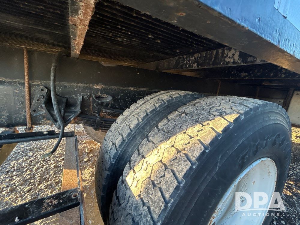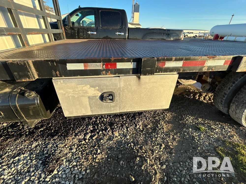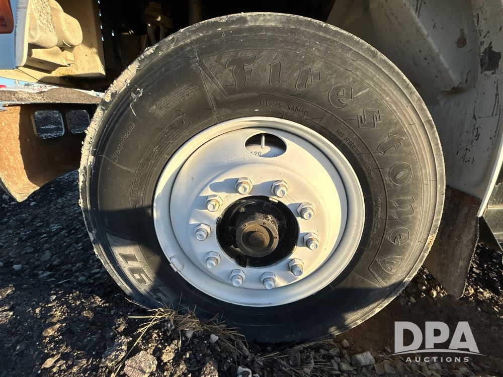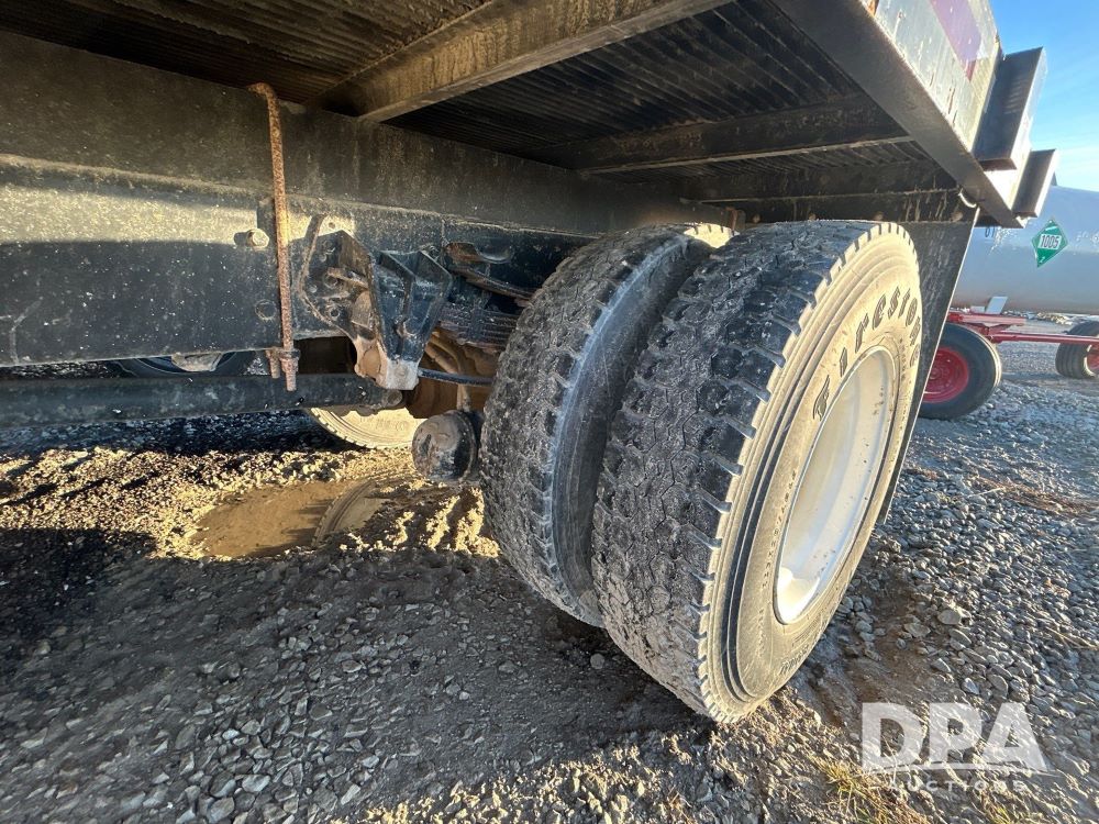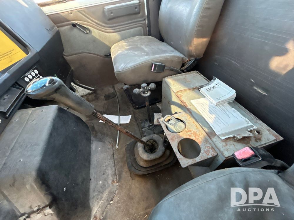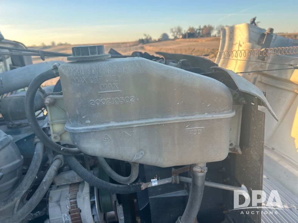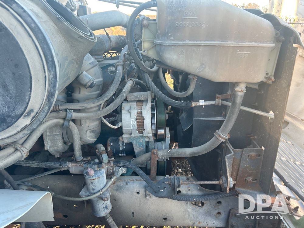 1996 International 4700 Flatbed (LS0506), DT466 diesel engine, 6-speed manual transmission, heat and air conditioning, manual windows, headache rack side compartment storage, 11r 22.5 front tires, 11r 22.5 rear dual tires, 417,727 miles.