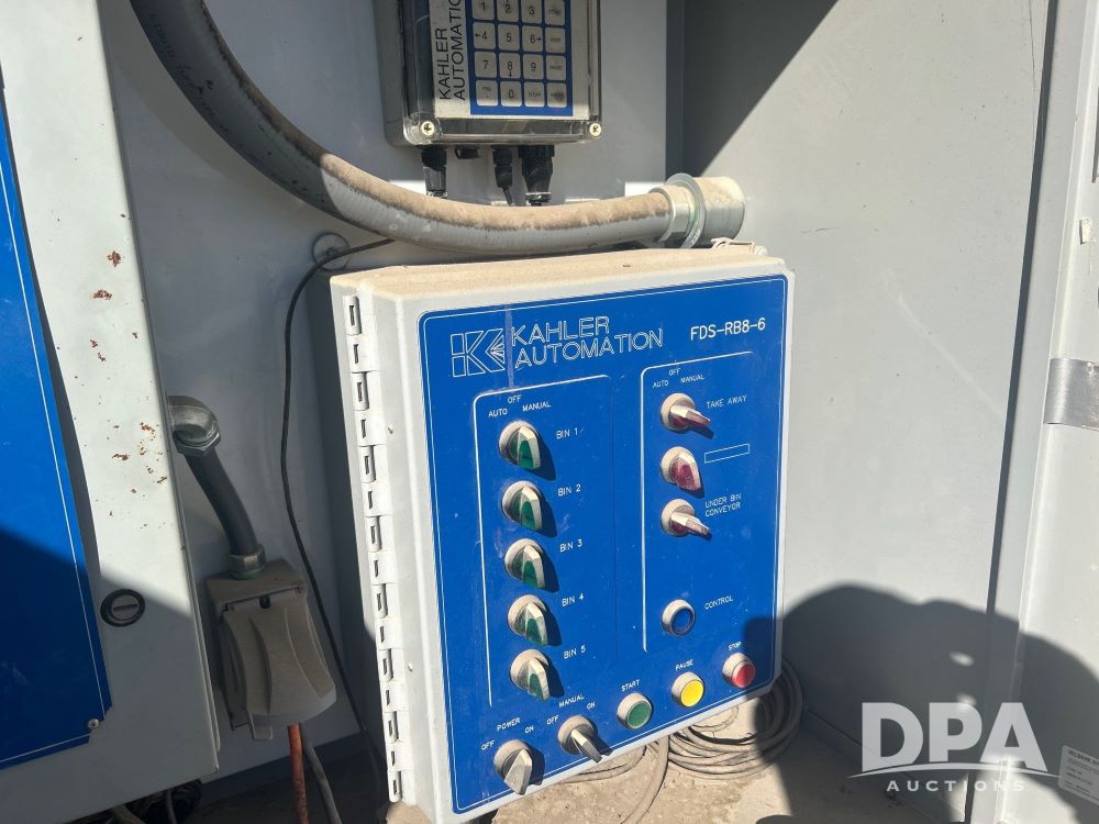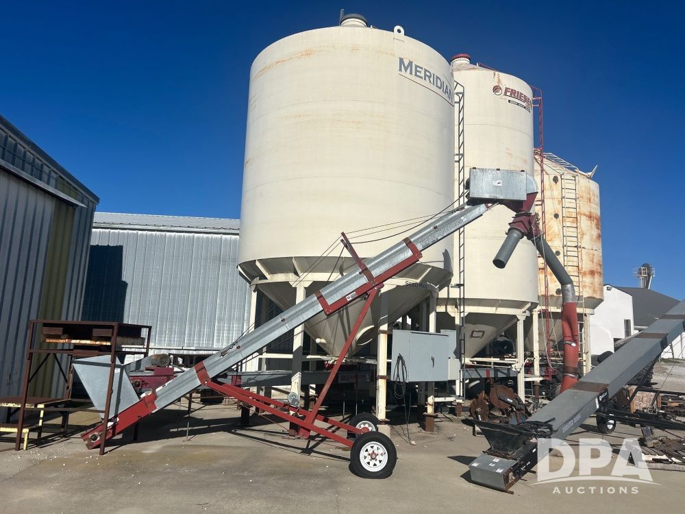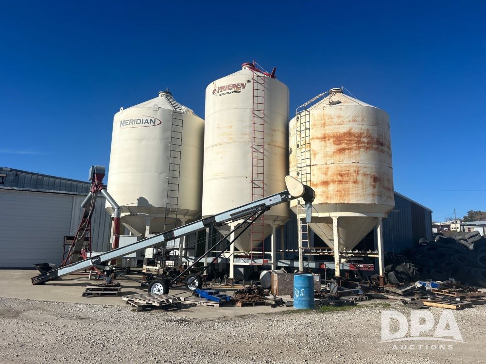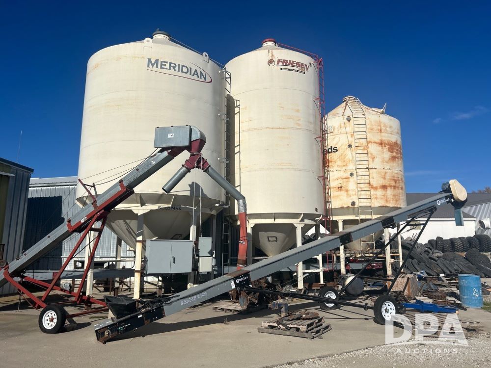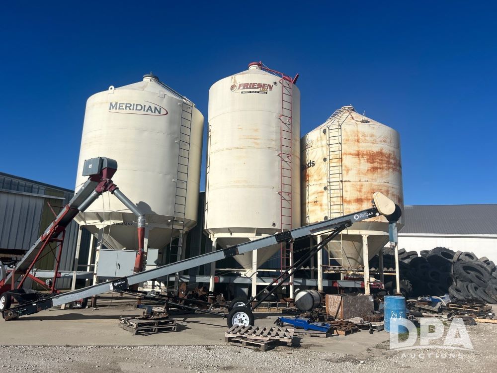 3 - Bulk Seed Bins w/ Under Conveyor (LS0480), 1 Meridian bin, approximately 3,500 unit capacity, 1 Friesen approximately 3,500 unit capacity, 1 Friesen approximately 2,500 unit capacity, KSI 12UB under conveyor, Kahler automation, KSI 1208 25 conveyor.