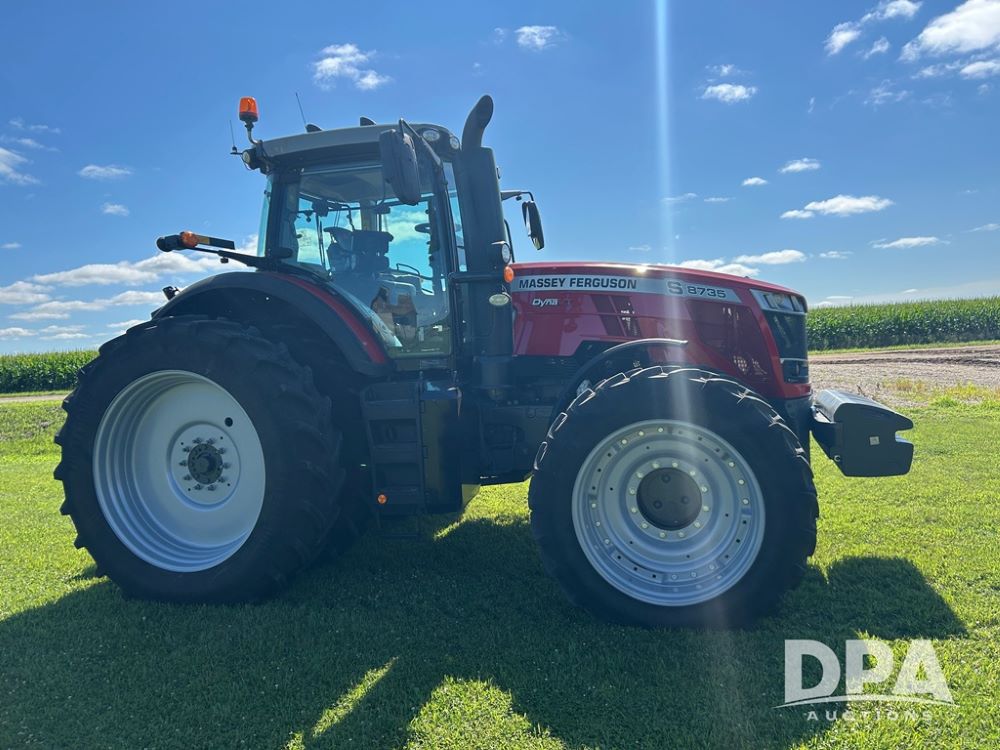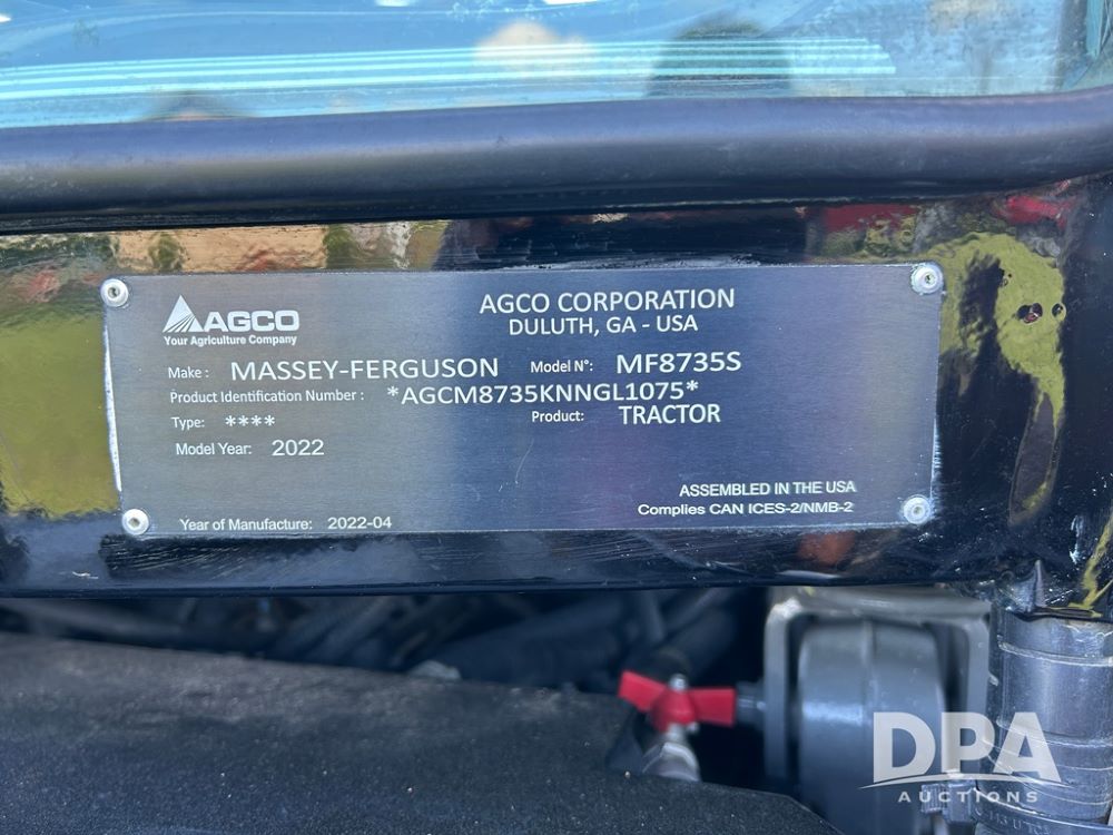 2022 Massey Ferguson 8735S Tractor (CP0581), AGCO Power 8.4L 6 cylinder diesel engine, Dyna-VT transmission, heat, air conditioning, Am/Fm radio, Cat 4 hitch, 6 port hydraulics, PTO, Trelleborg TM600 - 380/80R38 front duals, Trelleborg TM600 - 480/80R50 rear duals, extended fender flares, (24) front suitcase weights, Massey Ferguson command center, shows 789 hours.