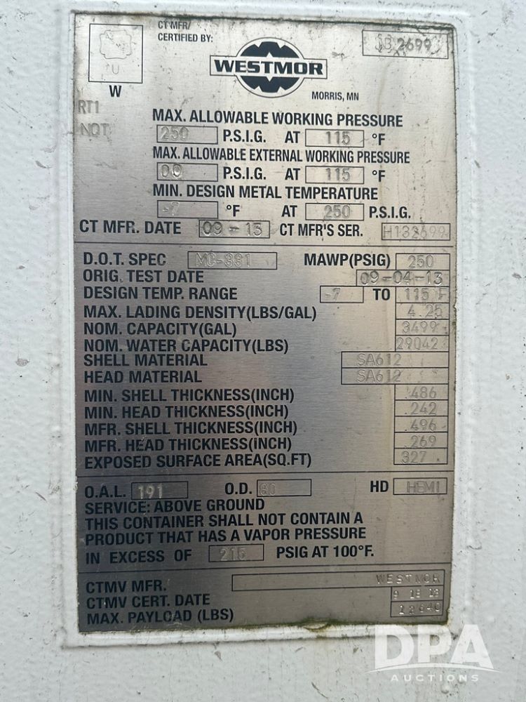 2014 Kenworth LP Delivery Truck (DR12678 Unit 8), diesel engine, Allison automatic transmission, single axle, air brakes, Westmor 3500 gallon LP tank, single metered hose reel, engine brake, cruise control, cab heat/air conditioning, odometer reads 165,827 miles, 22.5 tires, all aluminum wheels.