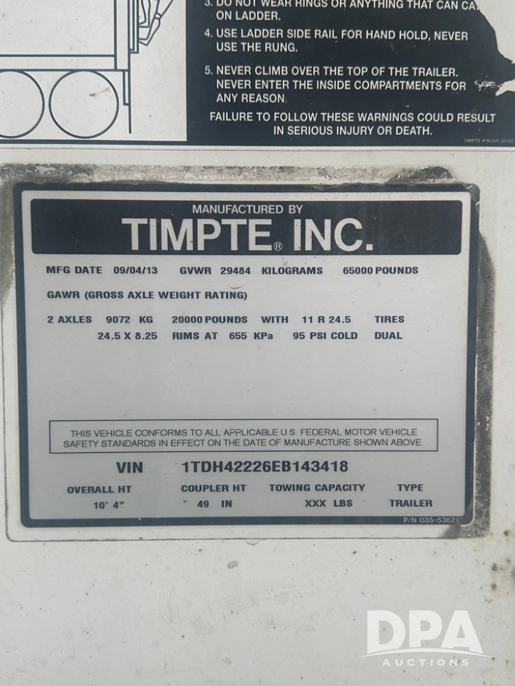 2014 Timpte Hopper Trailer (DR12680 Unit 415), 42' aluminum grain hopper trailer, 66'' sides, air ride suspension, roll over tarp, 22.5 tires, aluminum wheels.