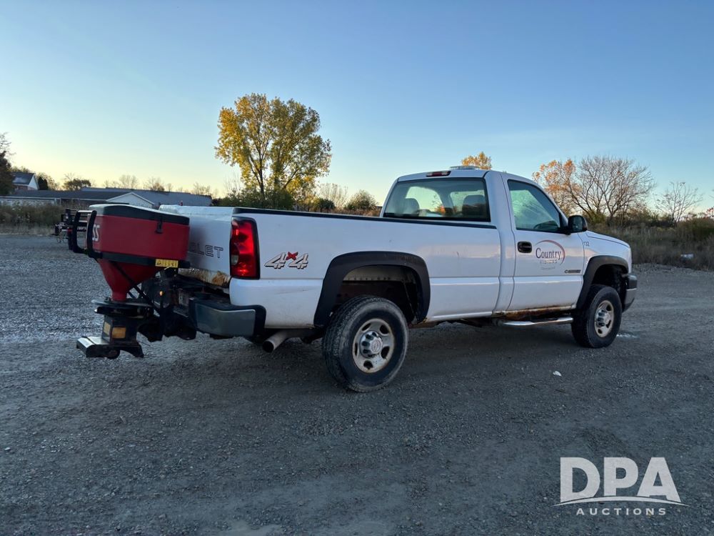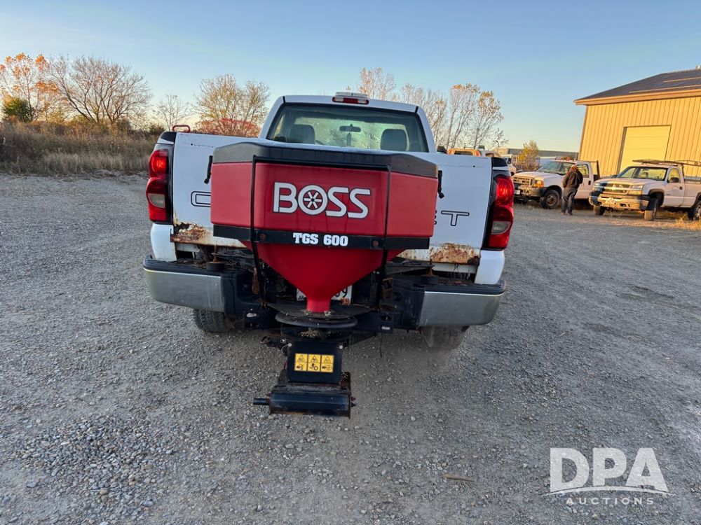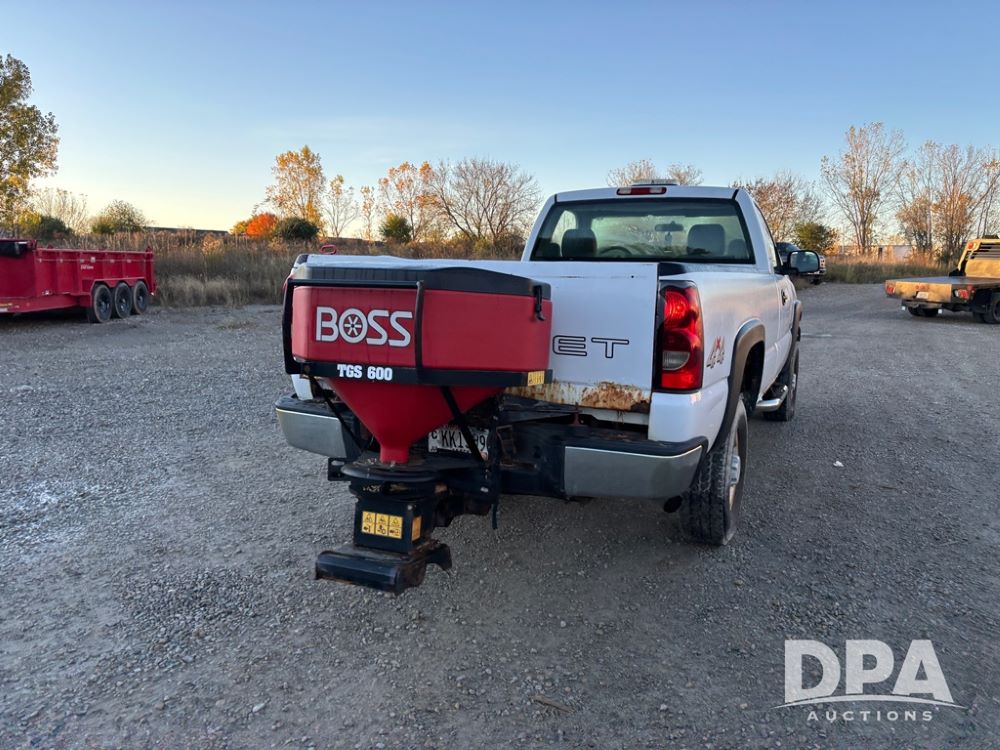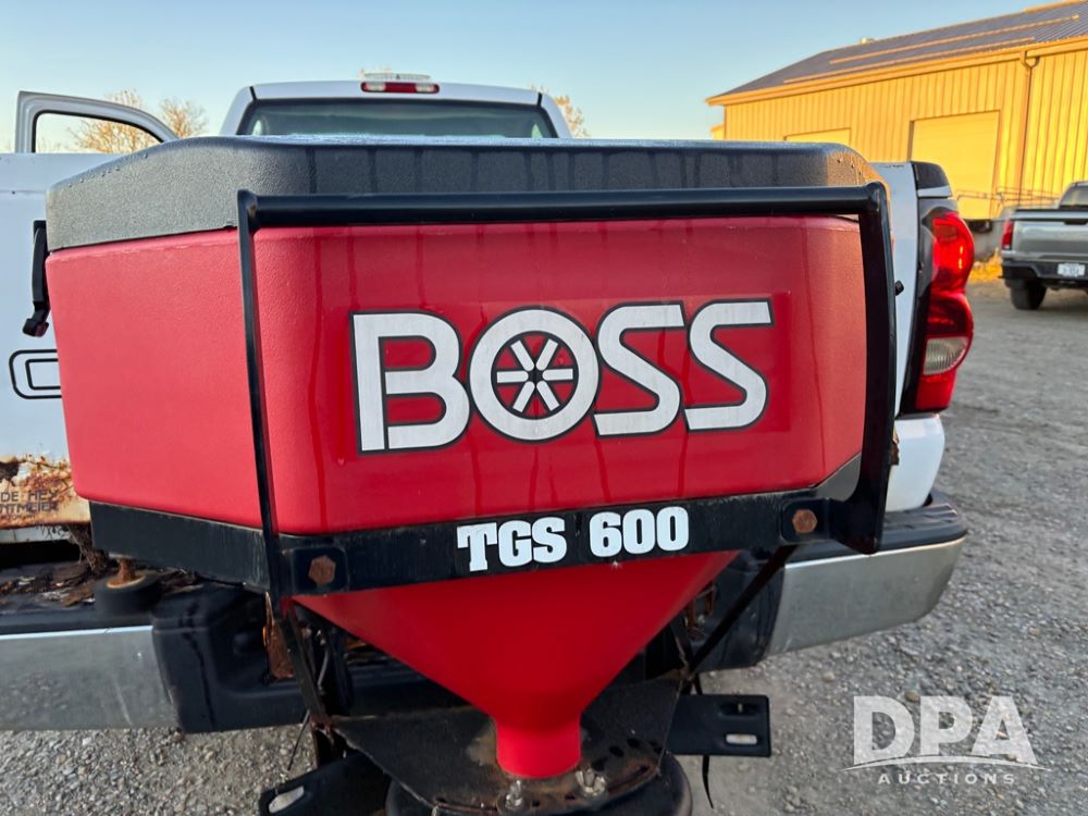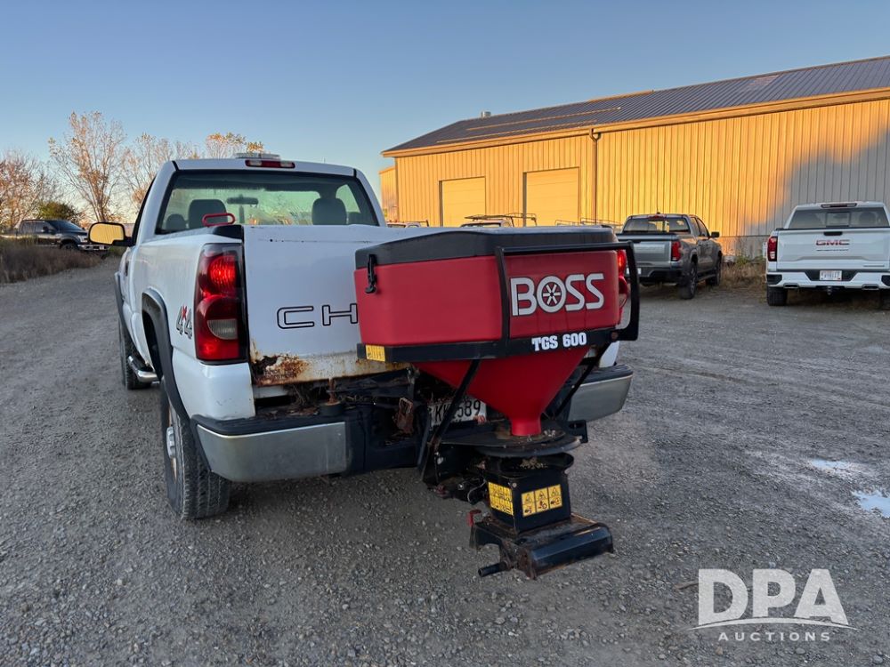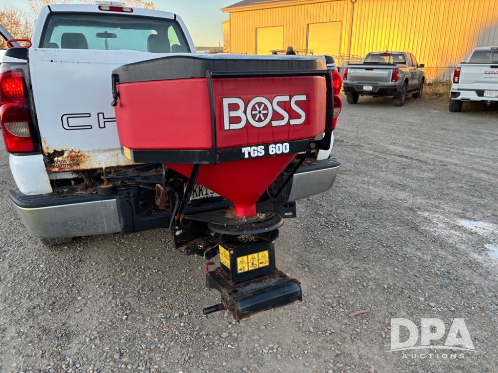 2006 Chevy 2500HD Pickup (DR12587 Unit B132), 6.0 liter gas engine, automatic transmission, 4X4, regular cab long box, Boss TGS rear mounted salt spreader w/cab control, chrome nerf bars, front plow bracket, spray bed liner, 245/75R16 tires, odometer reads 119,204 miles.