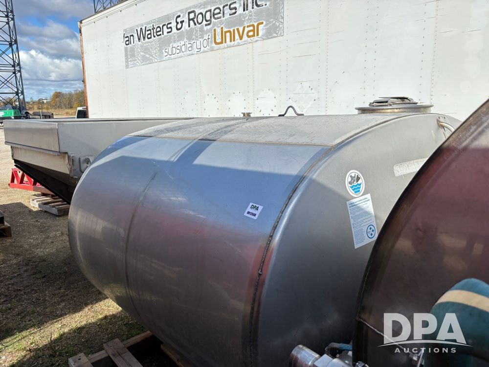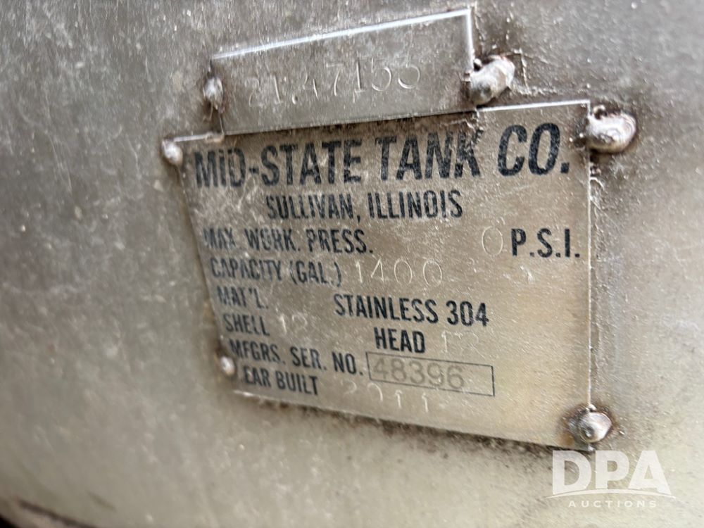 2011 Mid State Tank (DR12608), 1400 gallon stainless steel sprayer tank.