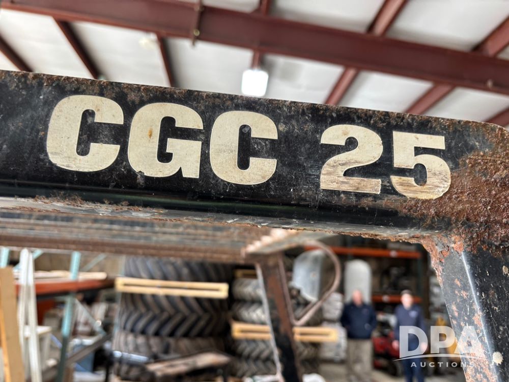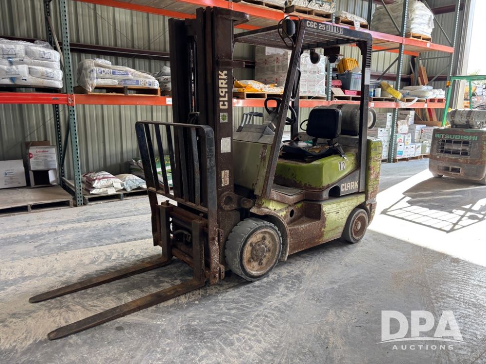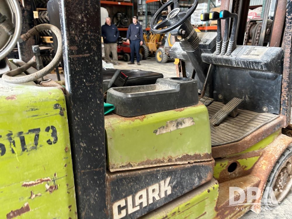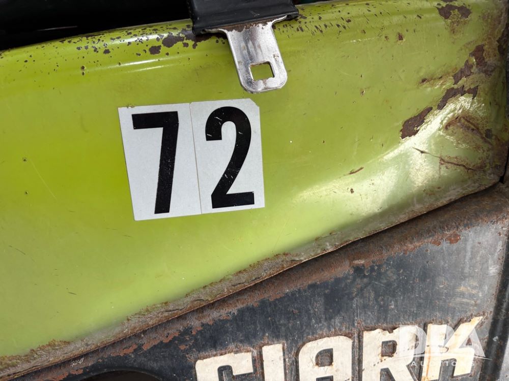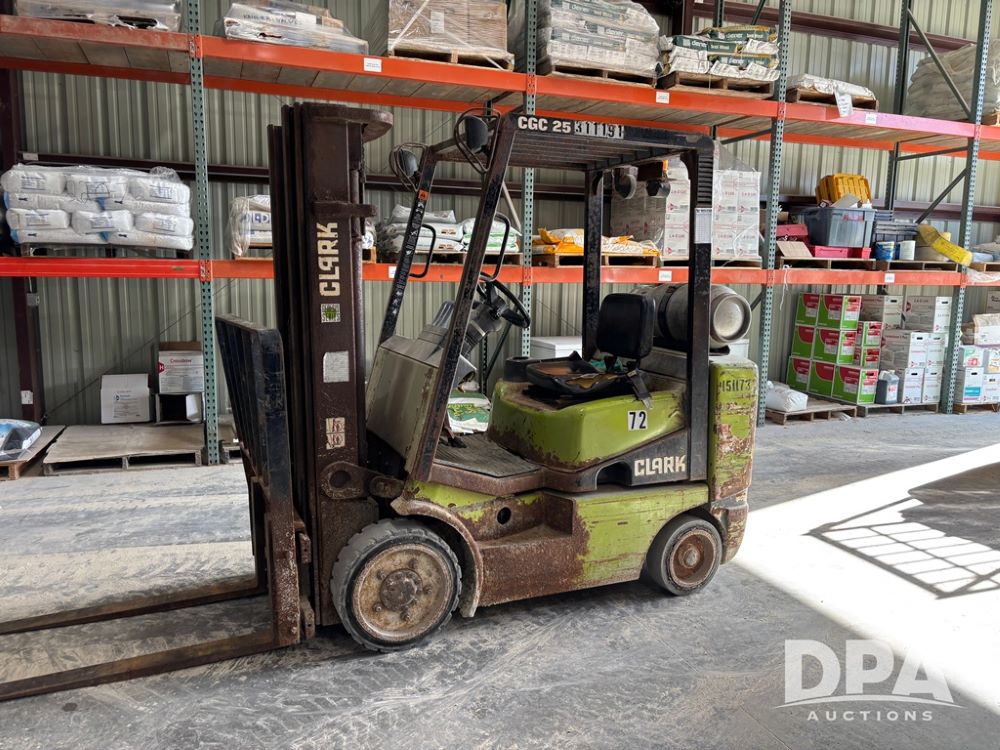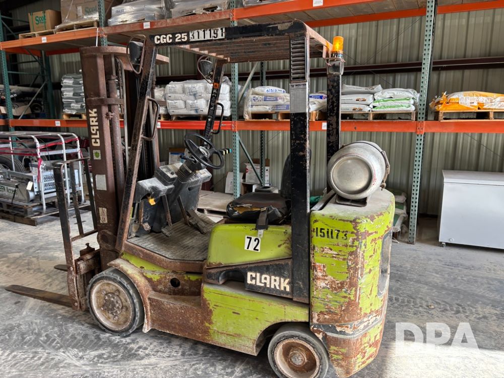 Clark Forklift (DR12604 Unit 72), model CGC25, LP gas engine, shuttle shift drive, OROPS, 3 stage mast, 4600lb capacity, hydraulic side shift, solid tires, shows 5,737 hours.