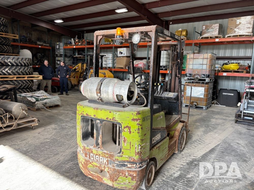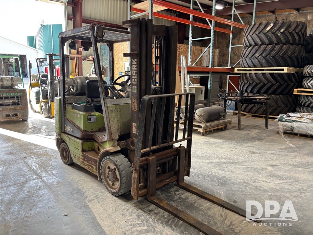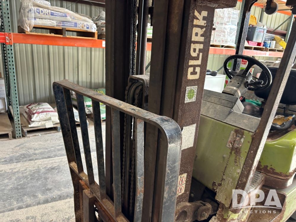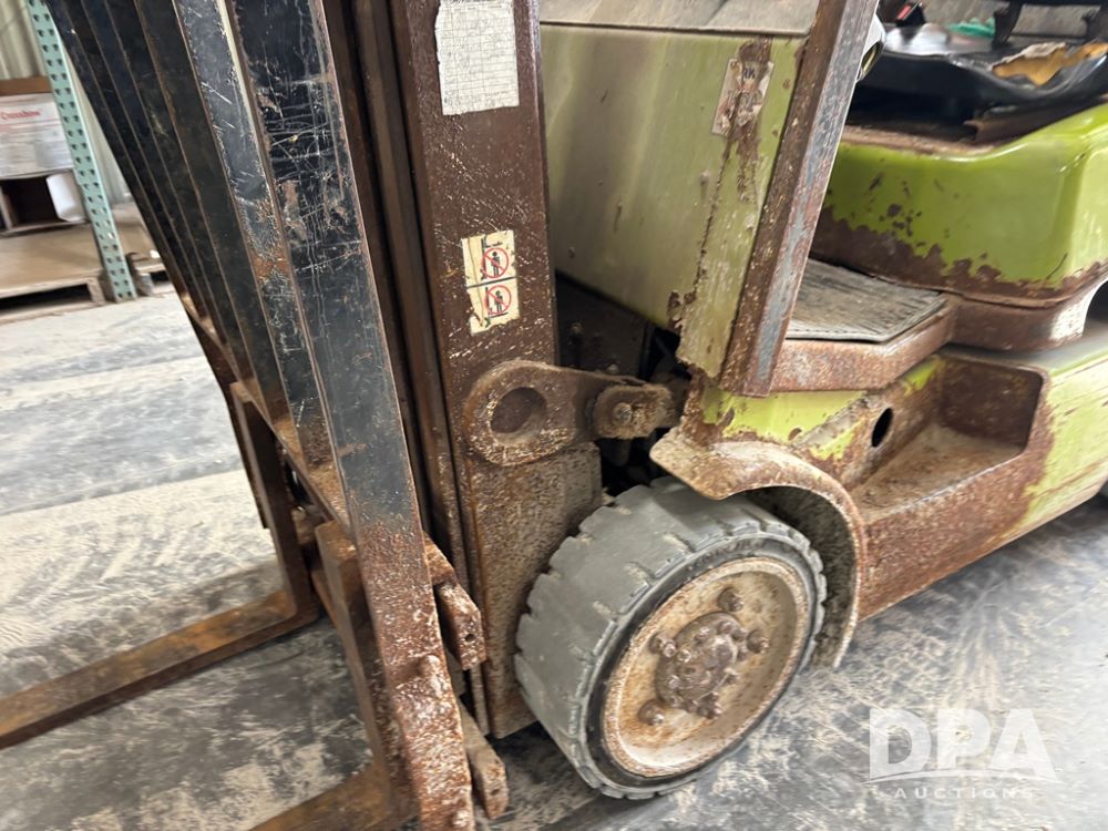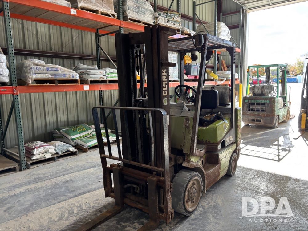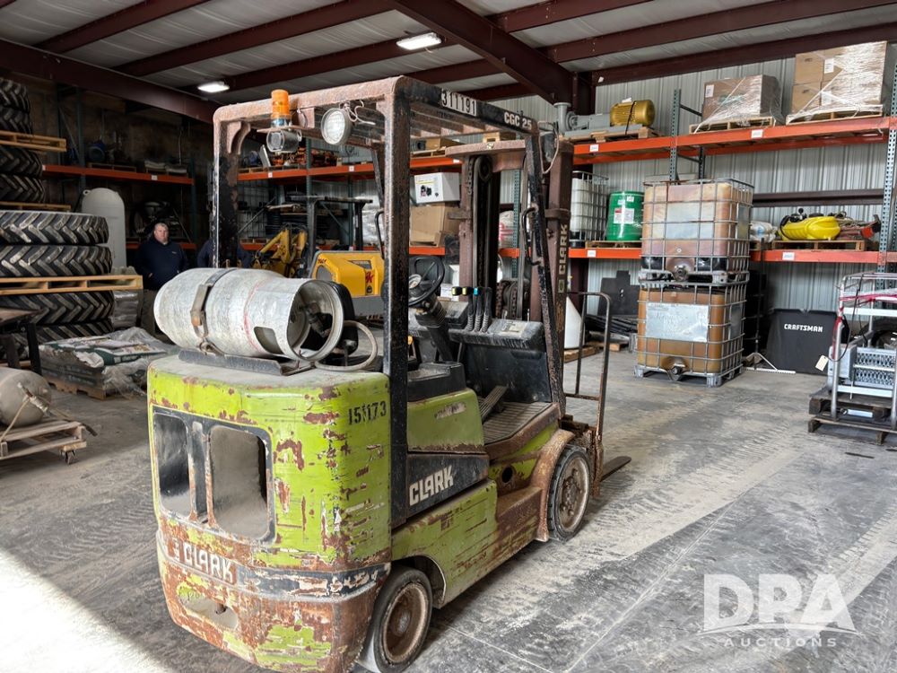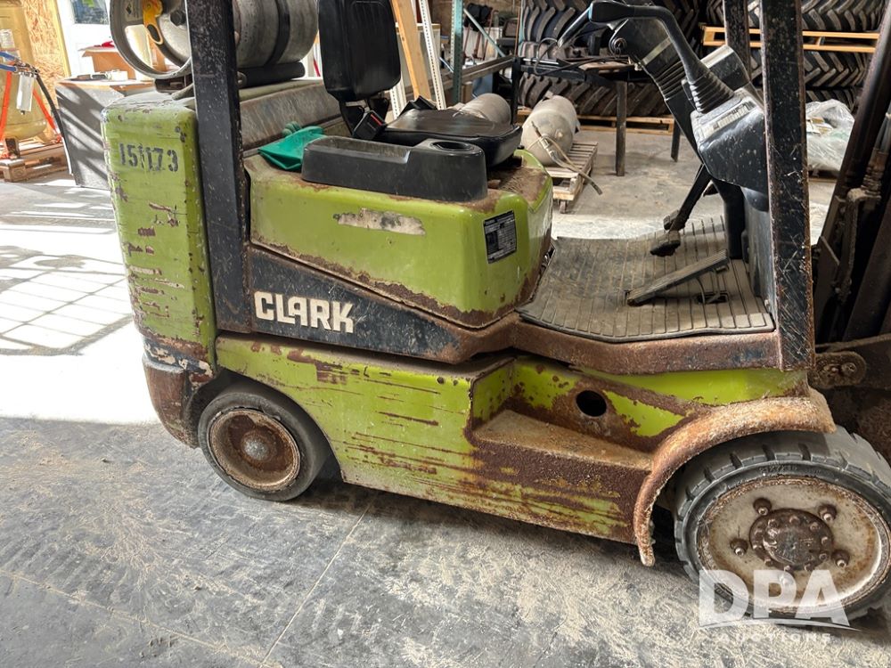 Clark Forklift (DR12604 Unit 72), model CGC25, LP gas engine, shuttle shift drive, OROPS, 3 stage mast, 4600lb capacity, hydraulic side shift, solid tires, shows 5,737 hours.