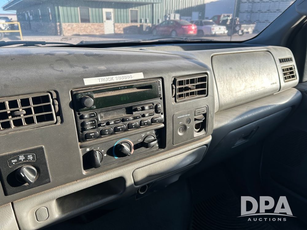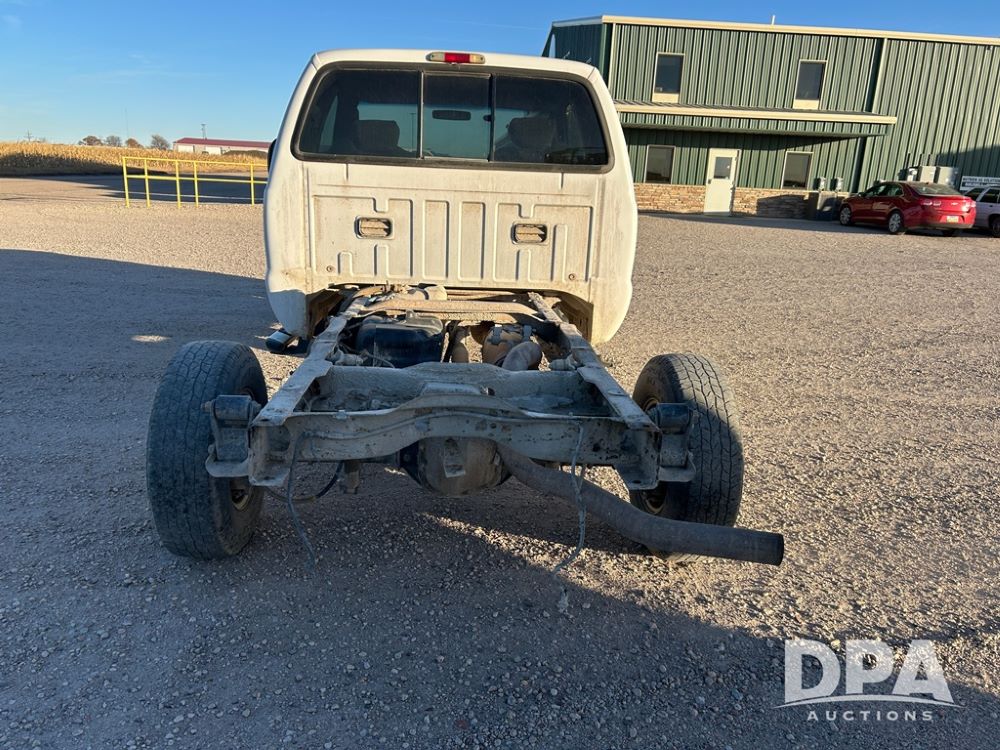 2004 Ford F-250 Super Duty 4x4 Pickup Chassis (CP1284, Unit 105806), extended cab, Power Stroke V8 turbo diesel engine, transmission, heat, Am/Fm radio, power windows, locks and mirrors, cruise control, driver's door keypad, running boards, LT235/85R16 tires, shows 232,744 miles.