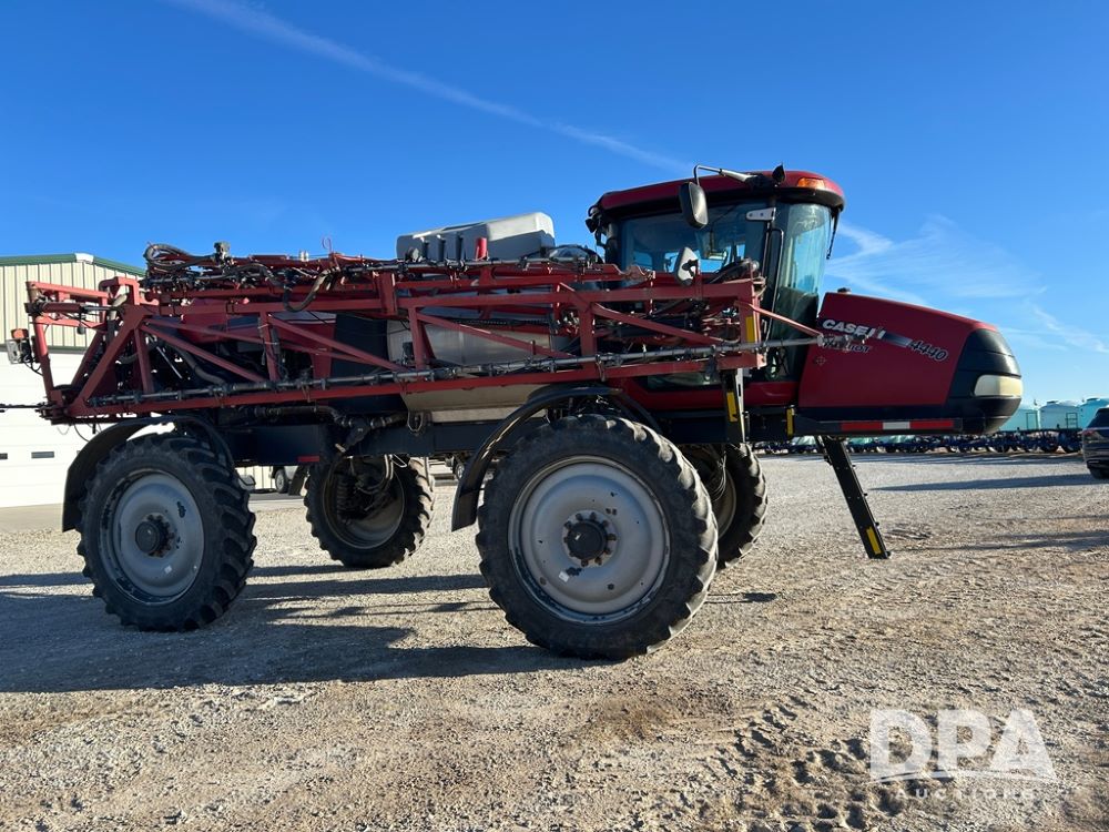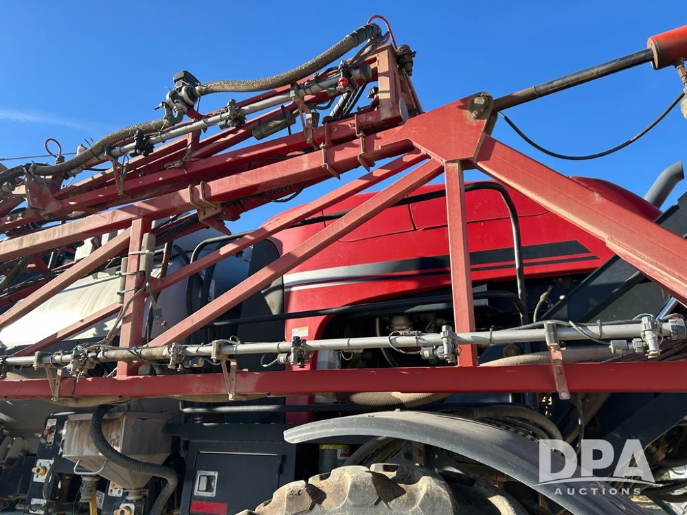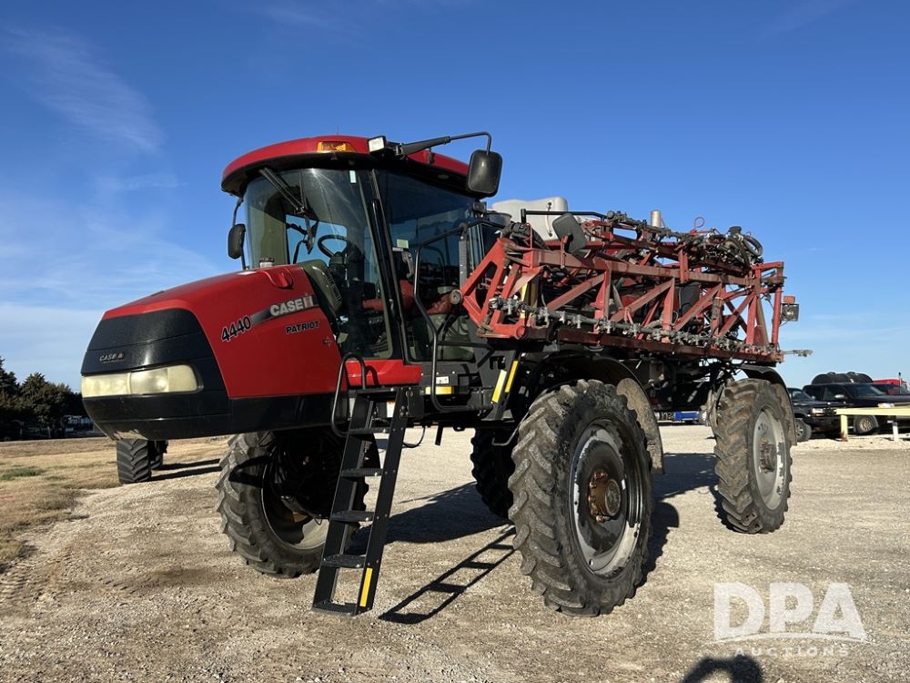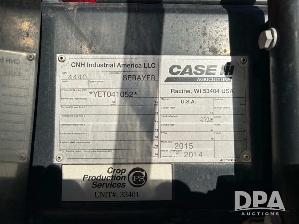 2015 CaseIH Patriot 4440 Sprayer (CP1289, Unit 33401), diesel engine, hydrostatic transmission, heat, air conditioning, Am/Fm radio, leather driver and buddy seat, power mirrors, 1,200 gallon stainless steel liquid system, 120' boom, top poly rinse tank, stainless steel chemical inductor tank, 380/90R46 row crop tires, fenders, Voyager backup camera, AIM Command Pro (S/N AP1456), Raven GPS, Raven Viper 4 monitor, shows 5,170 hours.