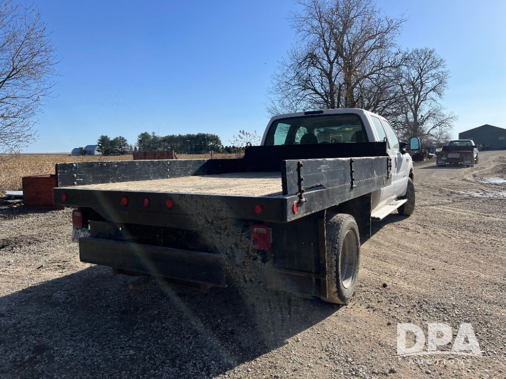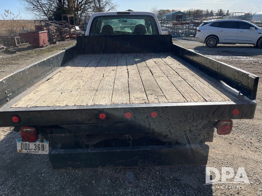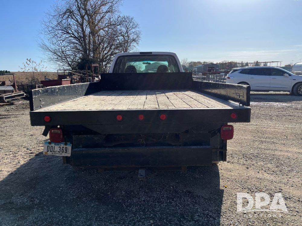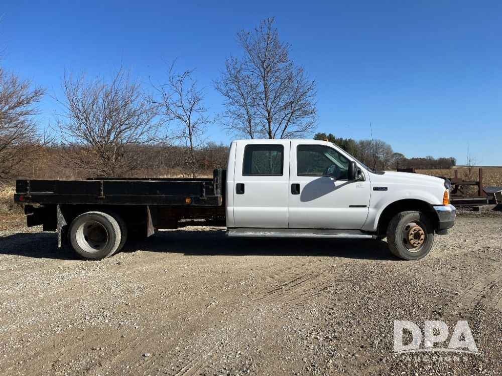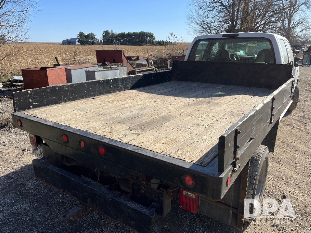 2001 Ford F-550 XL Super Duty Flatbed Truck (JN3393), 4 door, Power Stroke V8 diesel engine, manual transmission, heat, Am/Fm radio, cruise control, approx. 10' wood flatbed, wood stakebed sides, running boards, dually, 225/70R19.5 tires, shows 230,266 miles.